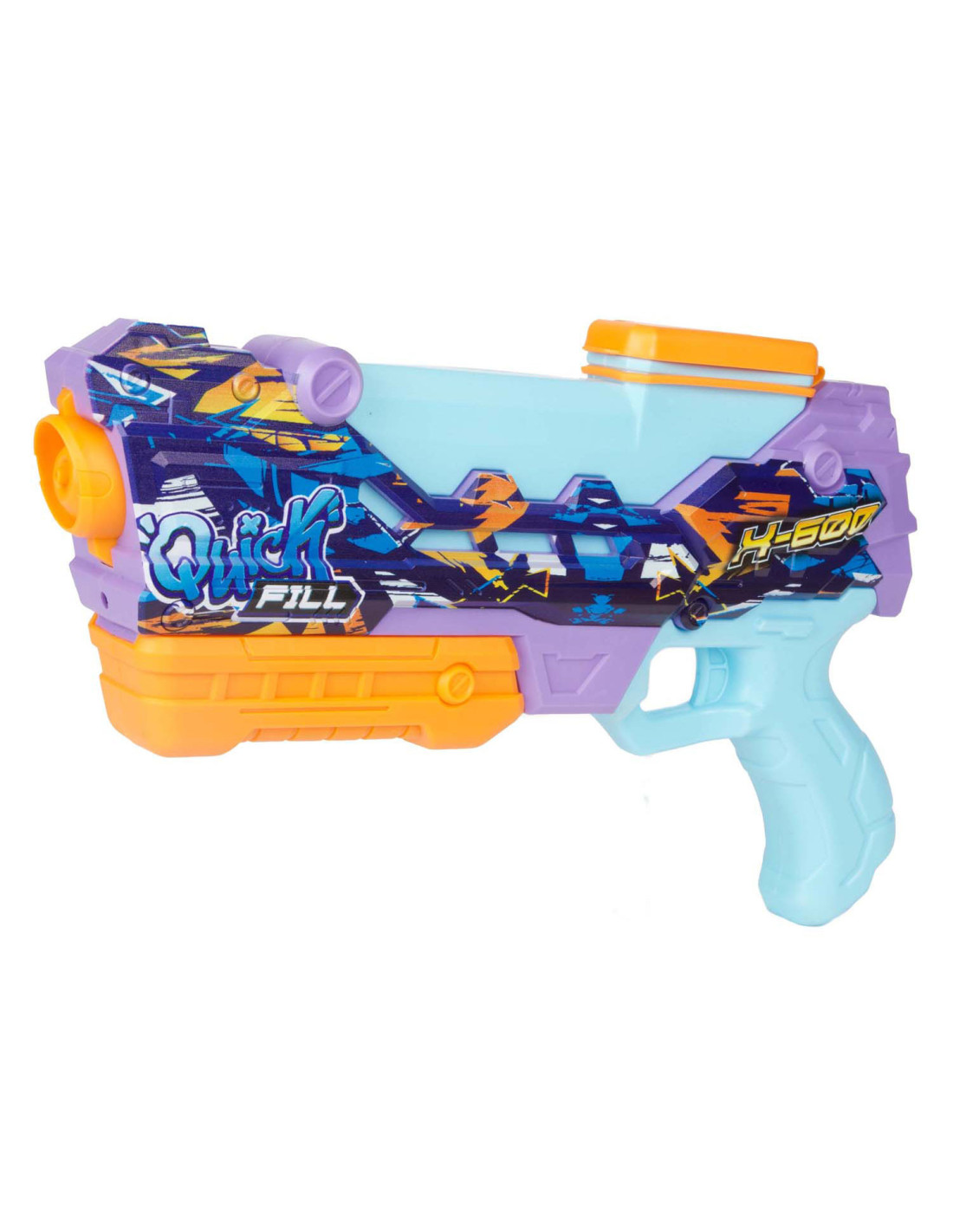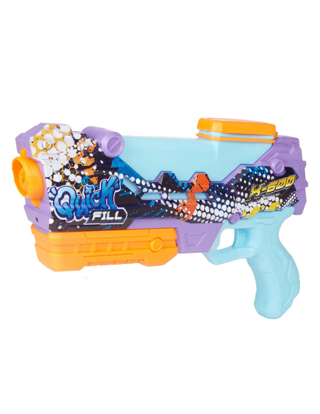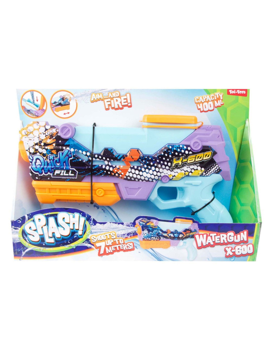 SPLASH Waterpistool Quick fill -X600-. Dit waterpistool schiet tot wel 7 meter ver en heeft een capaciteit van 400 ml.