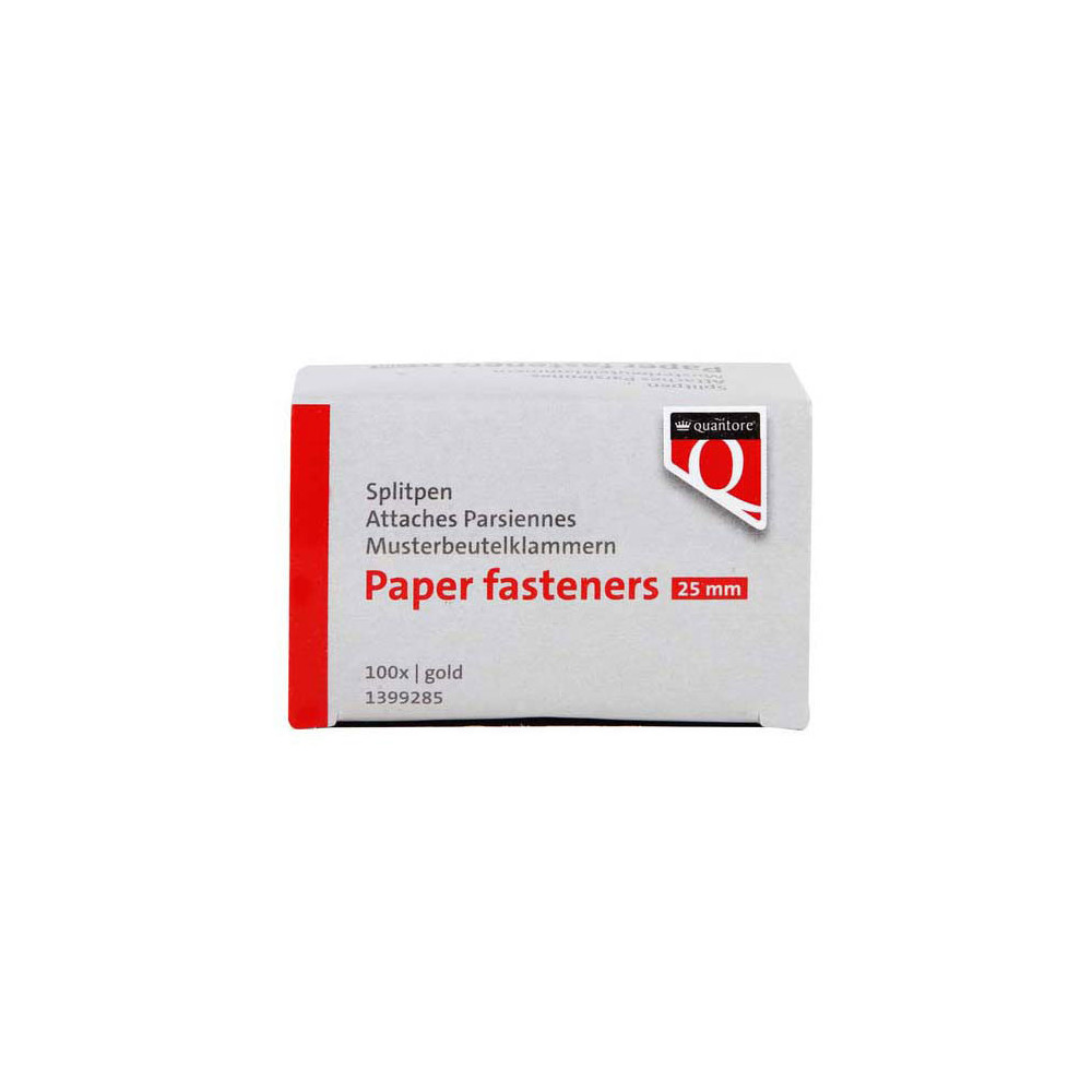 De ronde splitpennen van Quantore zijn ideaal voor het samenvoegen of binden van documenten, presentaties of creatieve projecten. Met een lengte van 25mm en een klassieke goudkleurige afwerking zijn ze zowel functioneel als representatief. Ze zijn eenvoudig in gebruik: steek ze door de perforatie en vouw de uiteinden open om de papieren stevig vast te zetten. Verpakt in een praktisch doosje met 100 stuks, perfect voor op kantoor, school of bij hobbywerk.
