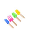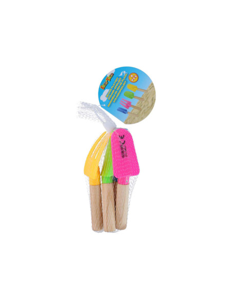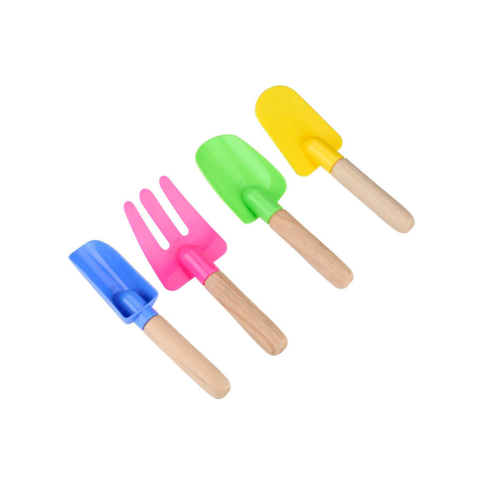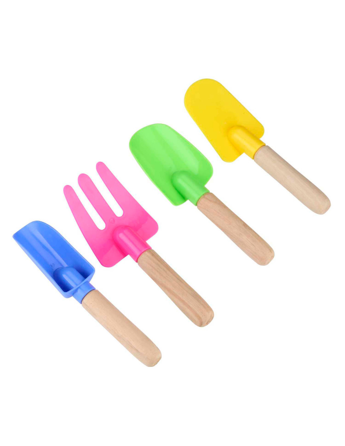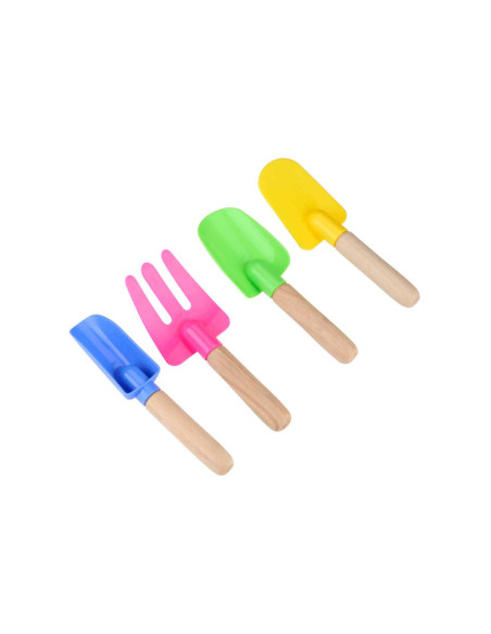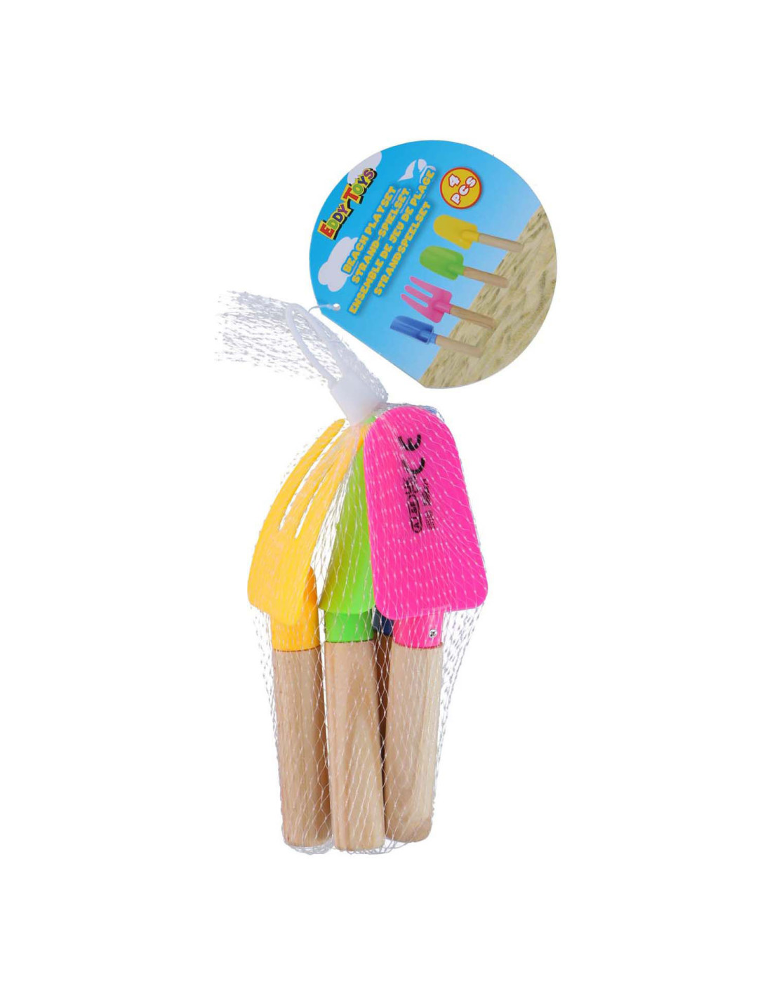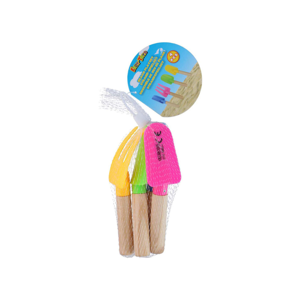 Strandspeelset met 4 items: 3 schepjes en 1 harkje. Elk item is ca. 17 cm.