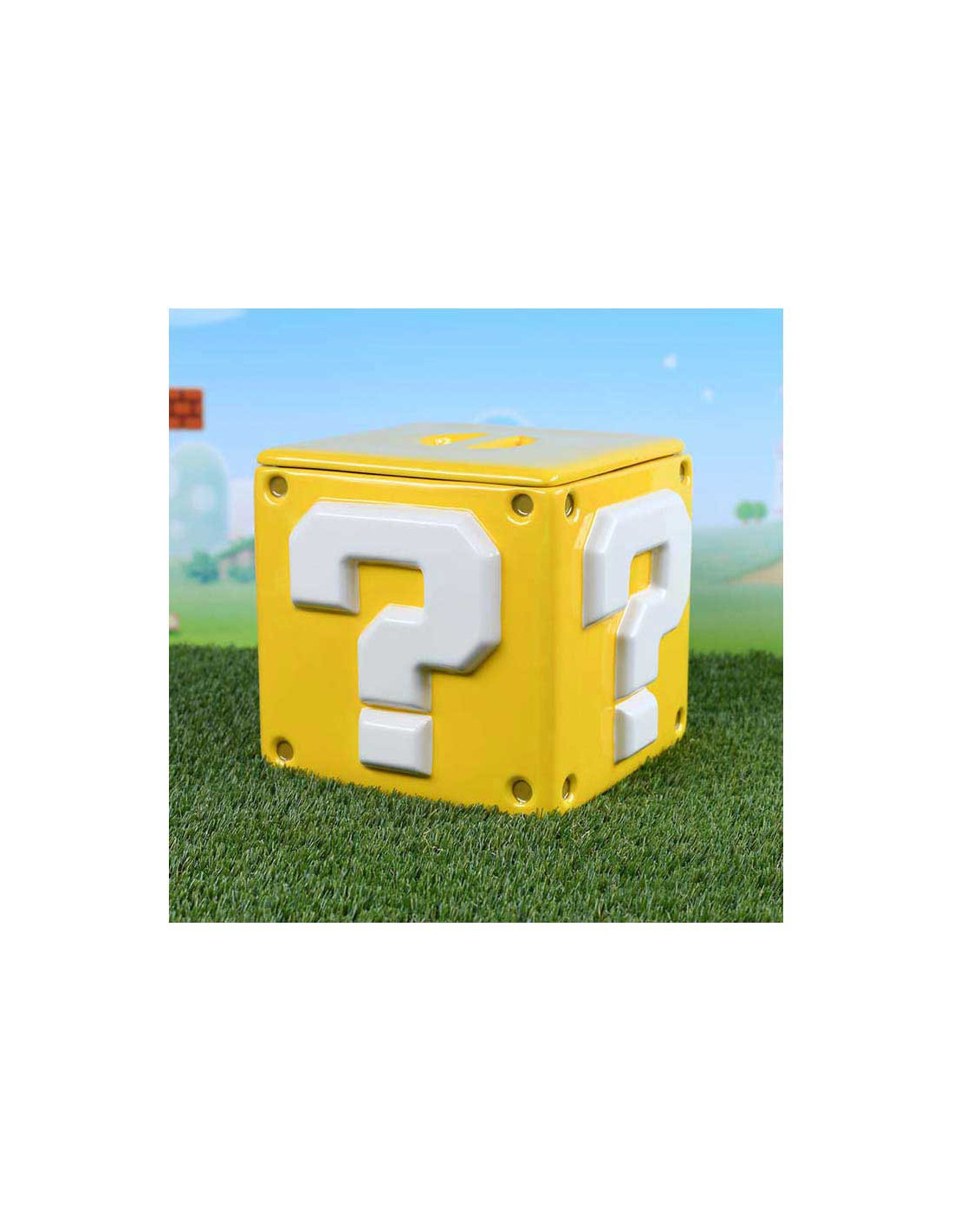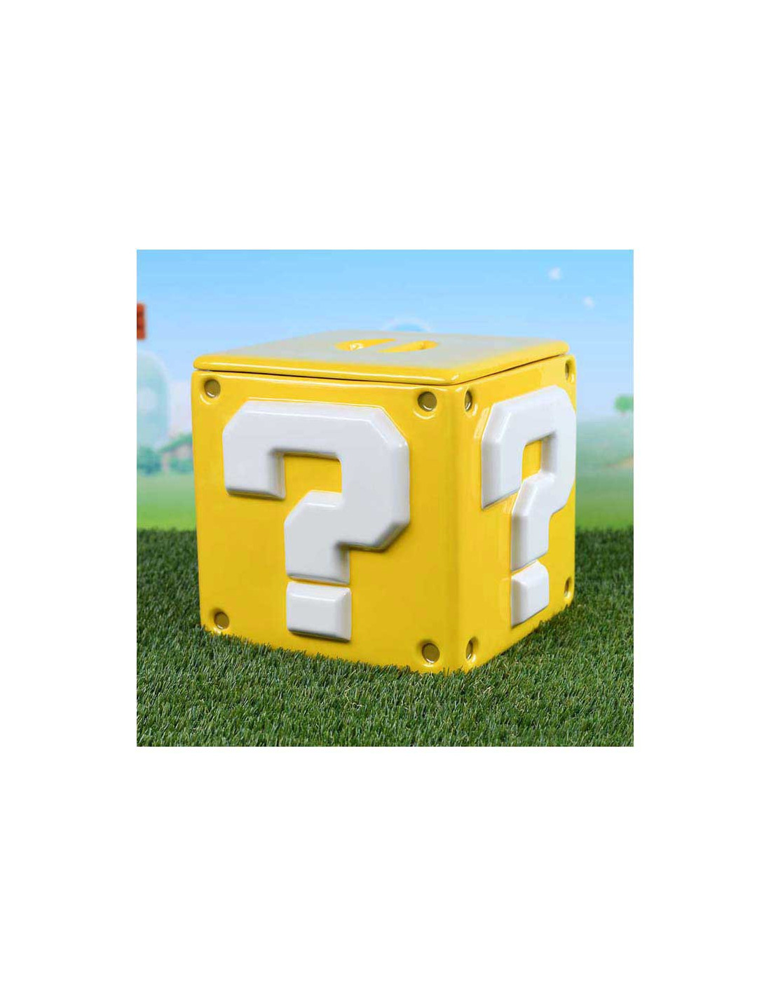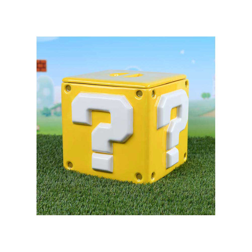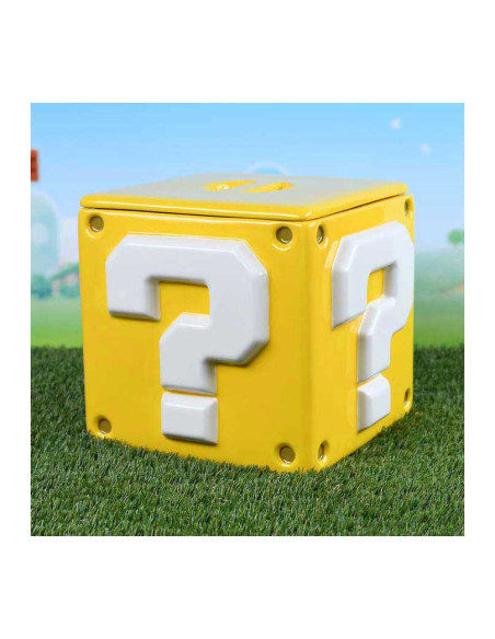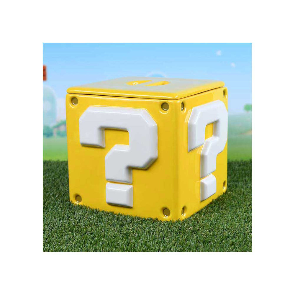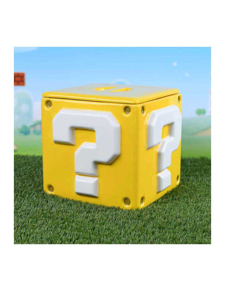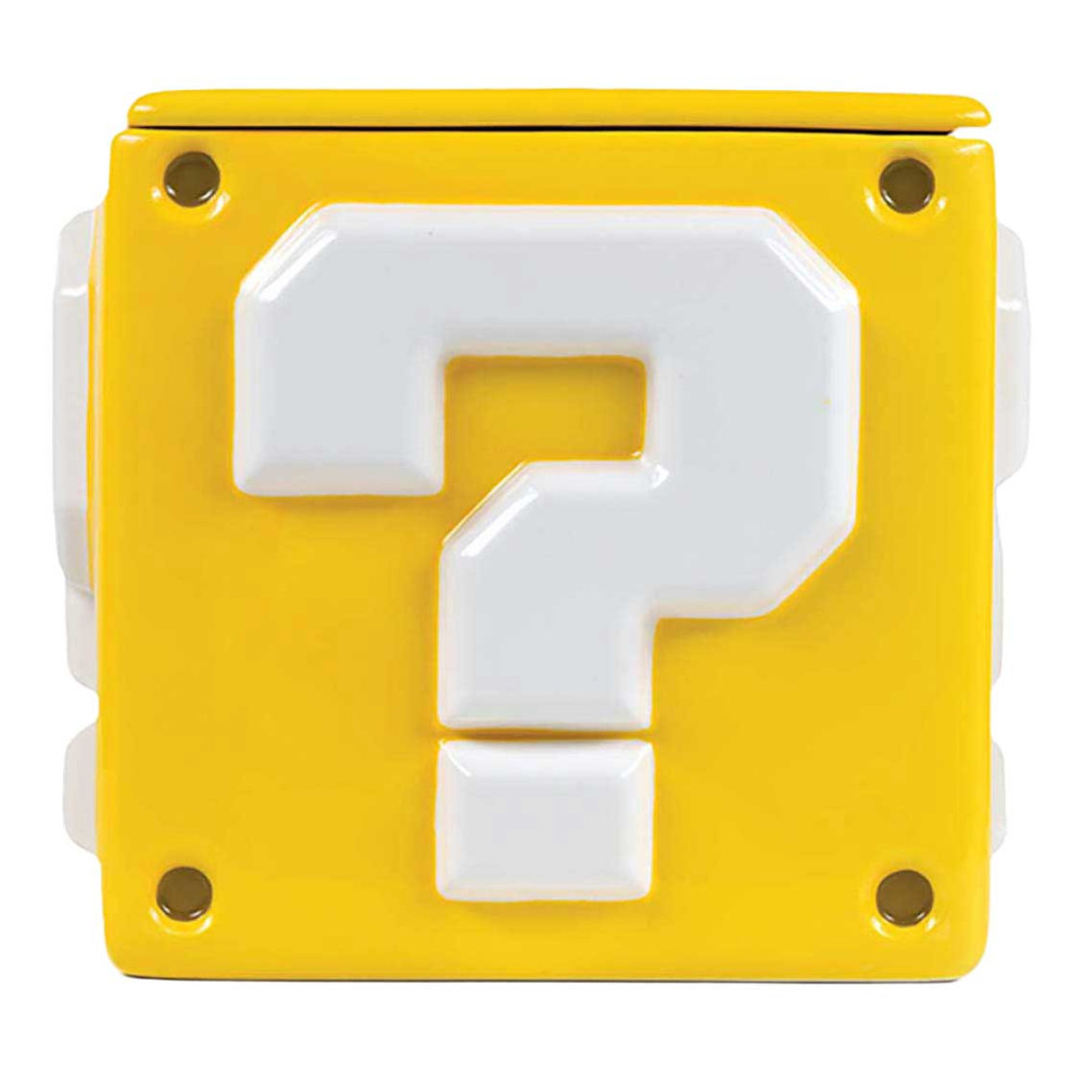 Deze keramische Super Mario koektrommel heeft de vorm van het iconische vraagtekenblok en meet ongeveer 15,9 x 15,9 x 14,3 cm. Het deksel sluit stevig af om de inhoud vers te houden. Een officieel gelicentieerd Nintendo-product van Pyramid International.