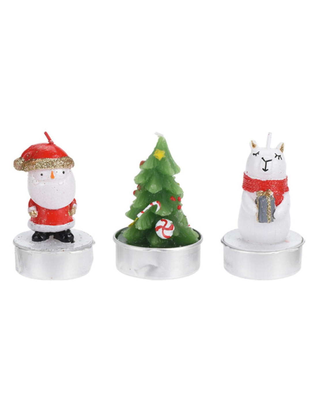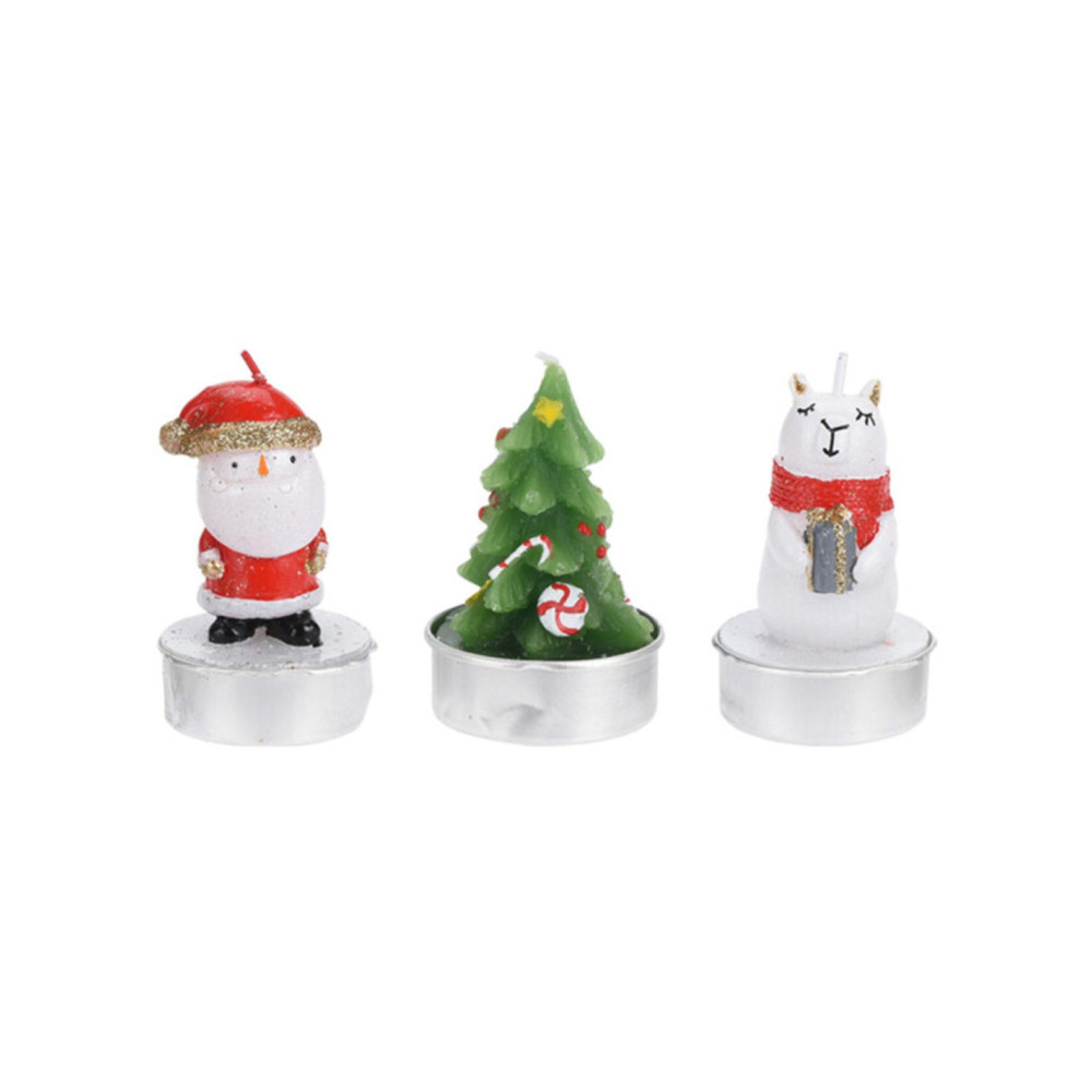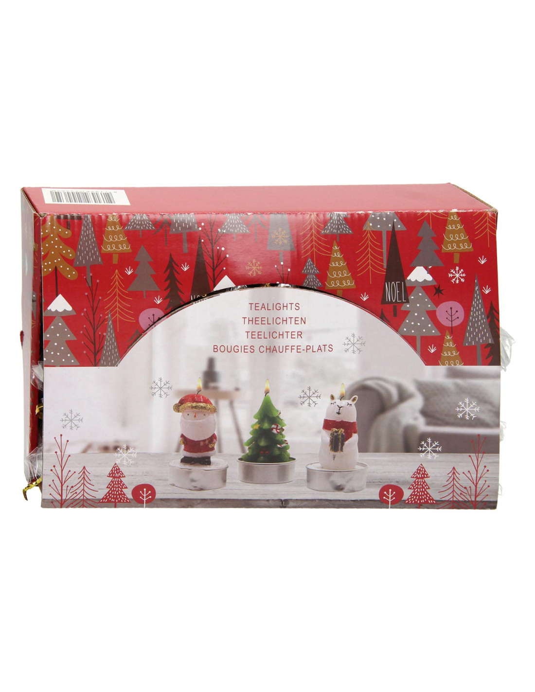 24 stuks theelichtjes met kerstfiguur, namelijk een kerstman, kerstboom en een ijsbeer.