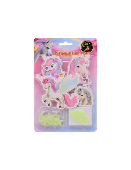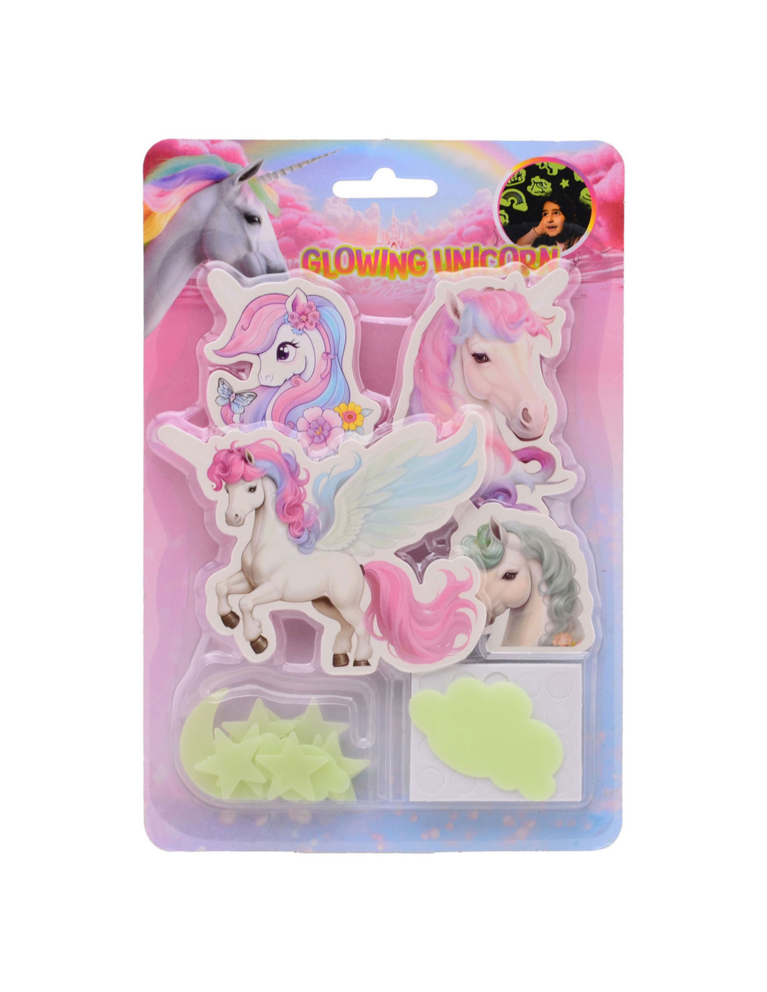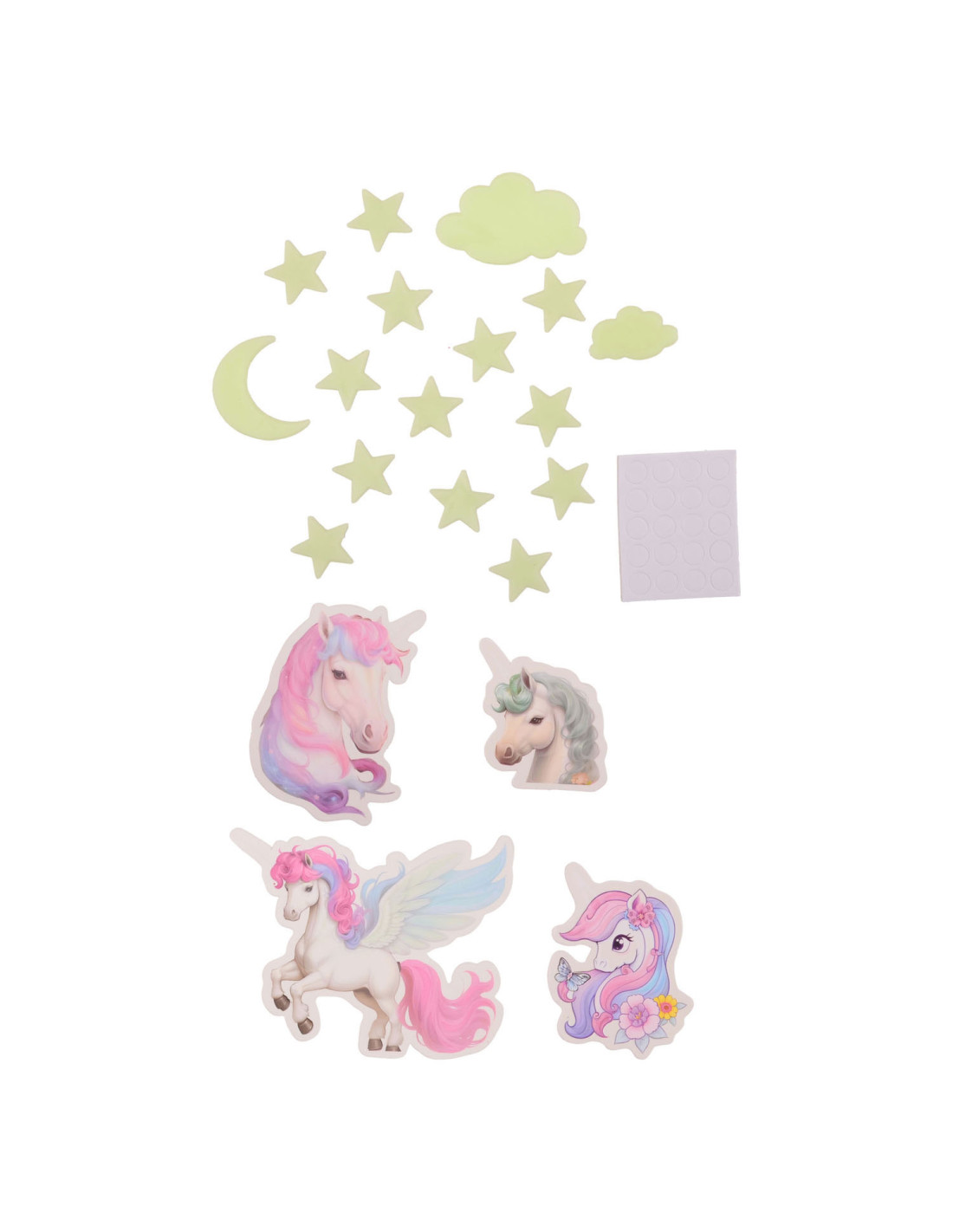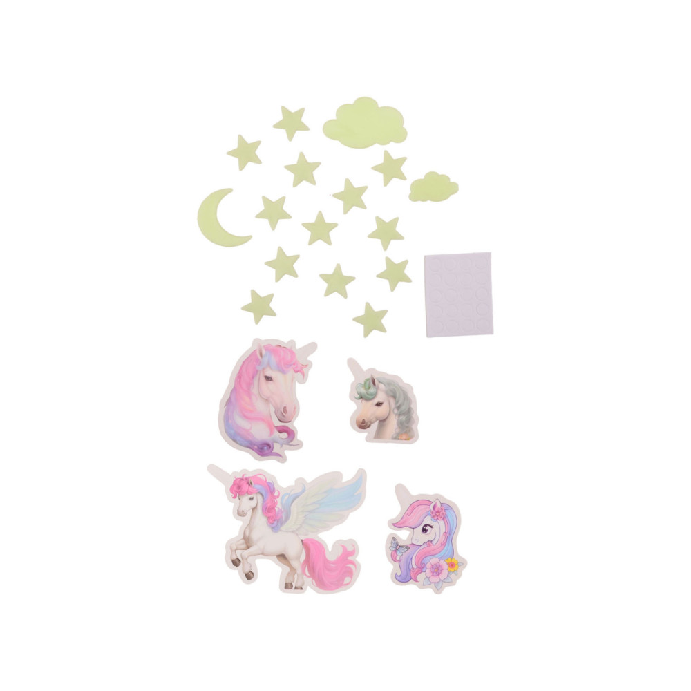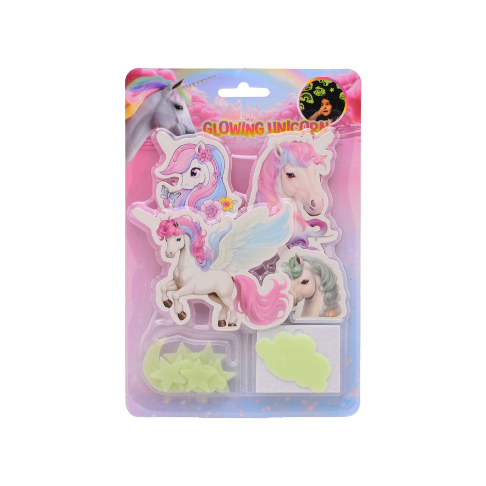 Glow in the dark eenhoorn stickers. In de verpakking zitten eenhoorn stickers en materiaal om ze vast te plakken.