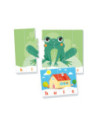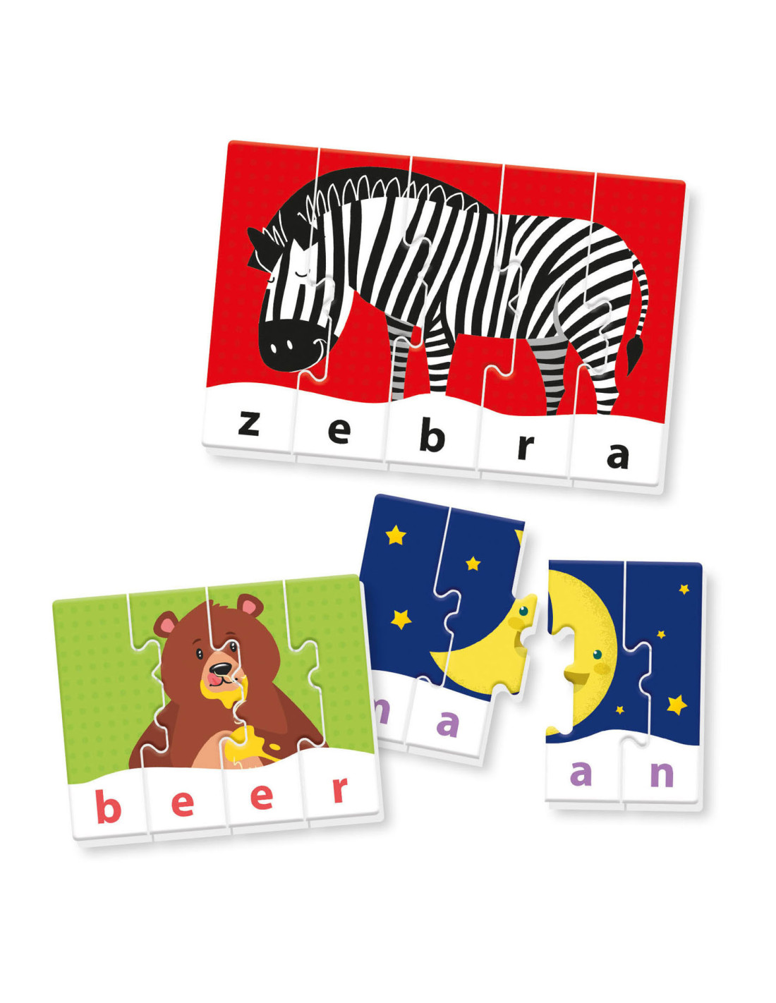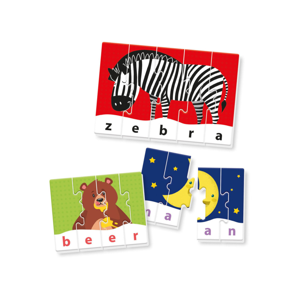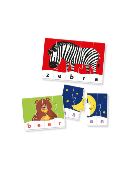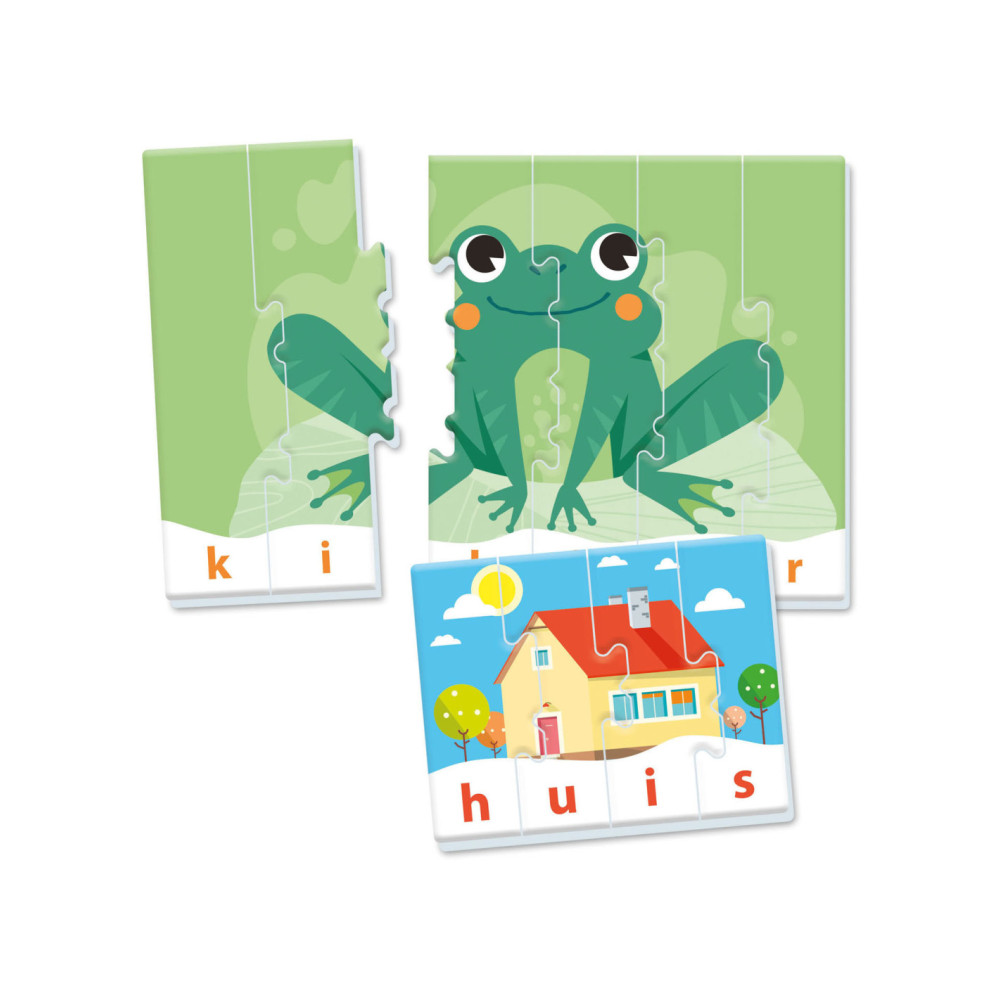 Puzzelspel met 16 puzzels om de eerste woorden en letters te leren herkennen en spellen. Geschikt voor kinderen van 3 tot 5 jaar oud.