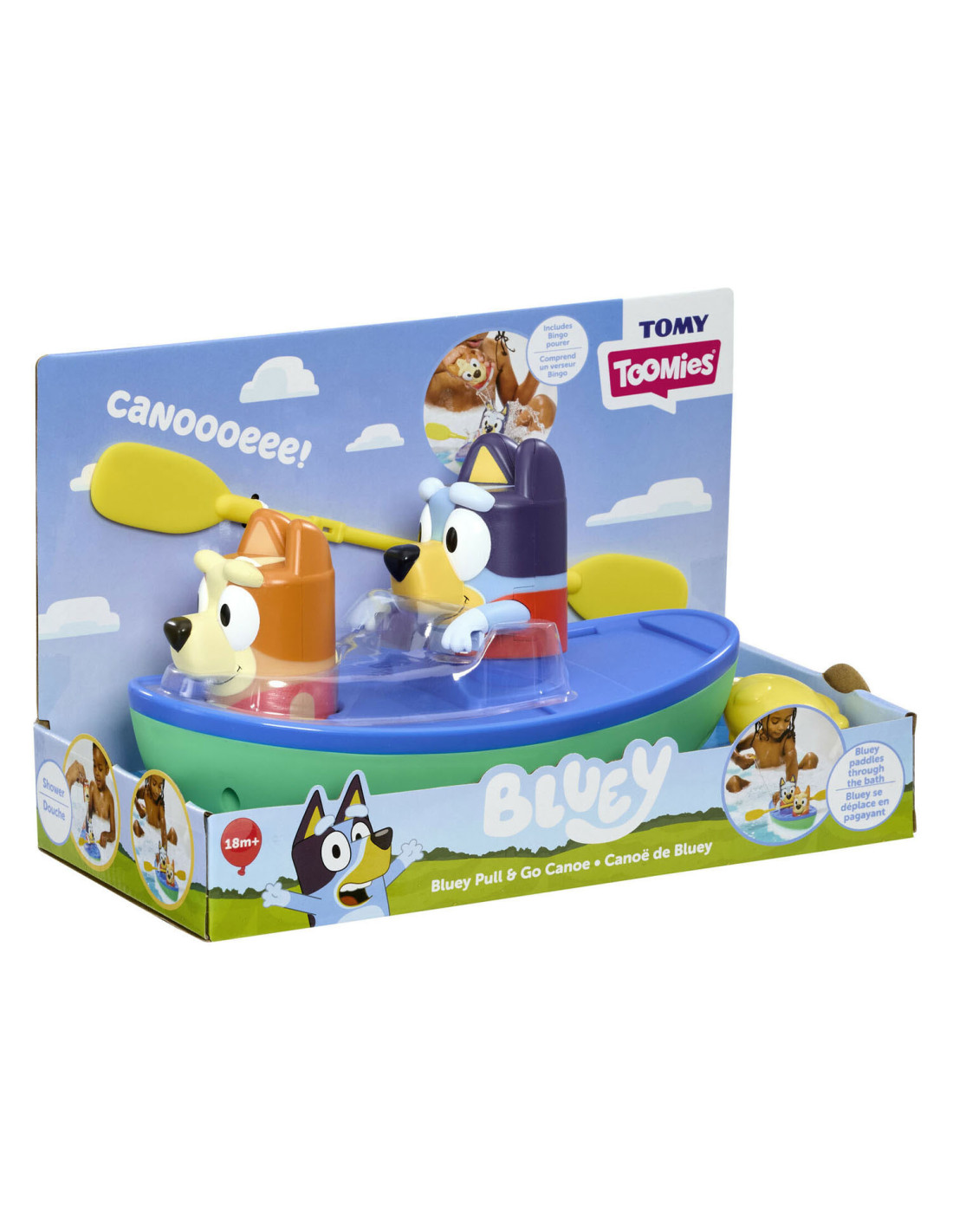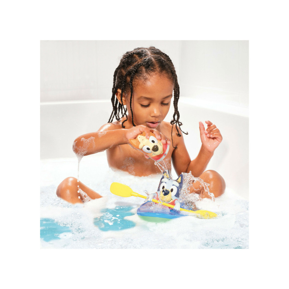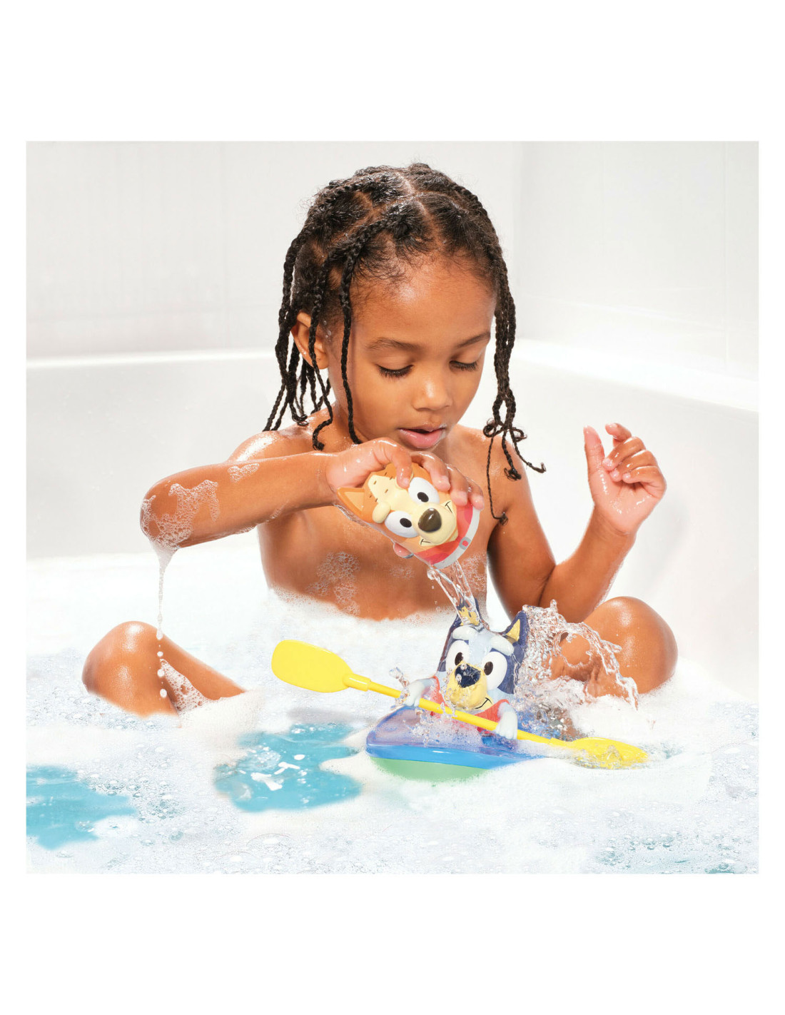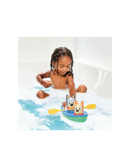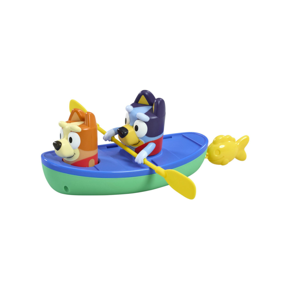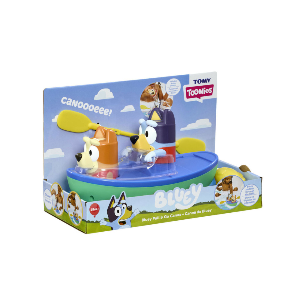 Dit Bluey Trekken & Gaan badspeelgoed maakt het nog leuker om in bad te gaan! Zie Bluey en Bingo eens heerlijk zitten in hun kano. Trek aan het koord achter de kano en roetsj... Bluey zal door je bad paddelen! Haal Bingo uit de kano en je kunt haar gebruiken als bekertje waarmee je water kunt scheppen en gieten. Of houd Bingo ondersteboven en laat het water door de gaatjes stromen, nu heb je een mini douche! Spelen met Bluey en Bingo is niet alleen heel erg leuk, maar het stimuleert ook fantasierijk spel en door de speelelementen, leer je oorzaak en gevolg kennen. In bad gaan was nog nooit zo leuk!Na gebruik afgieten en aan de lucht laten drogen. Maak de binnenkant regelmatig schoon door grondig te spoelen met een antibacteriële of steriliserende oplossing. Leeftijdsindicatie: 18 maanden+.
