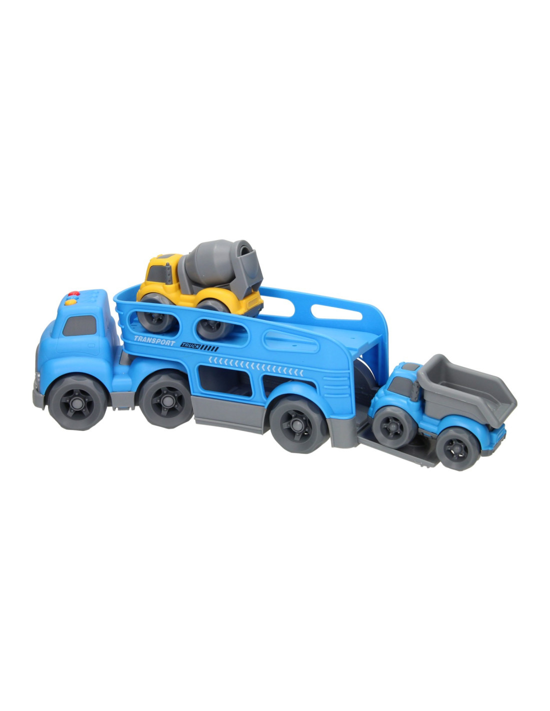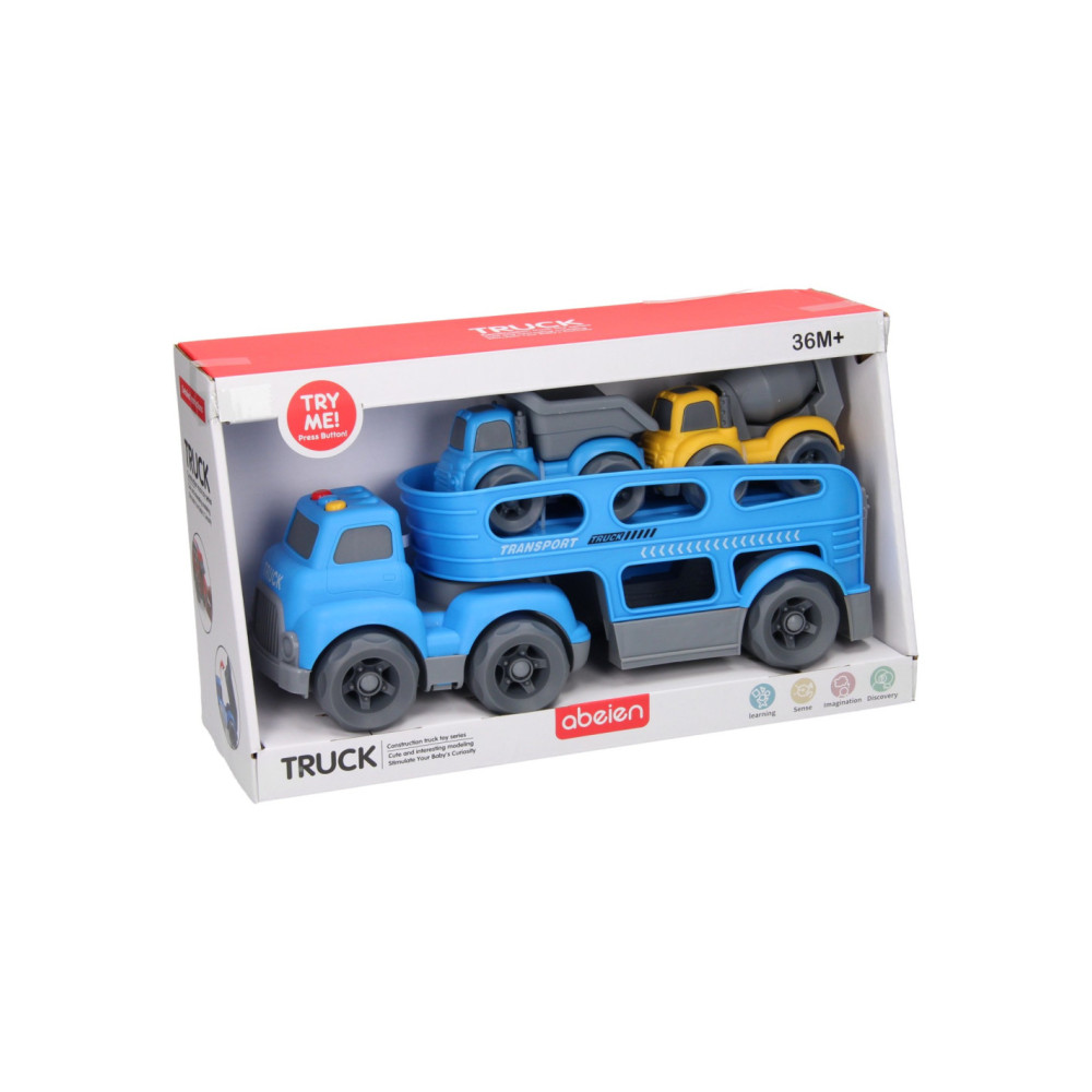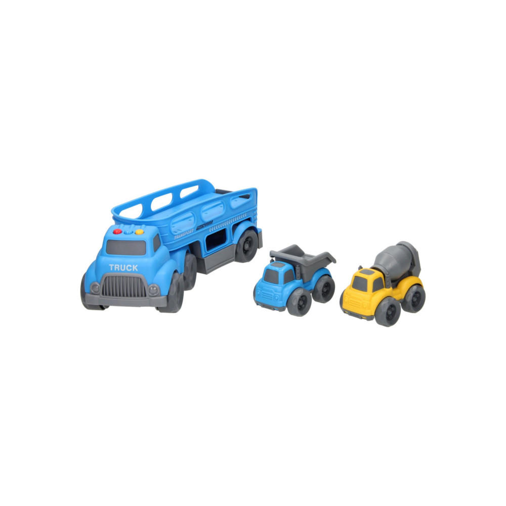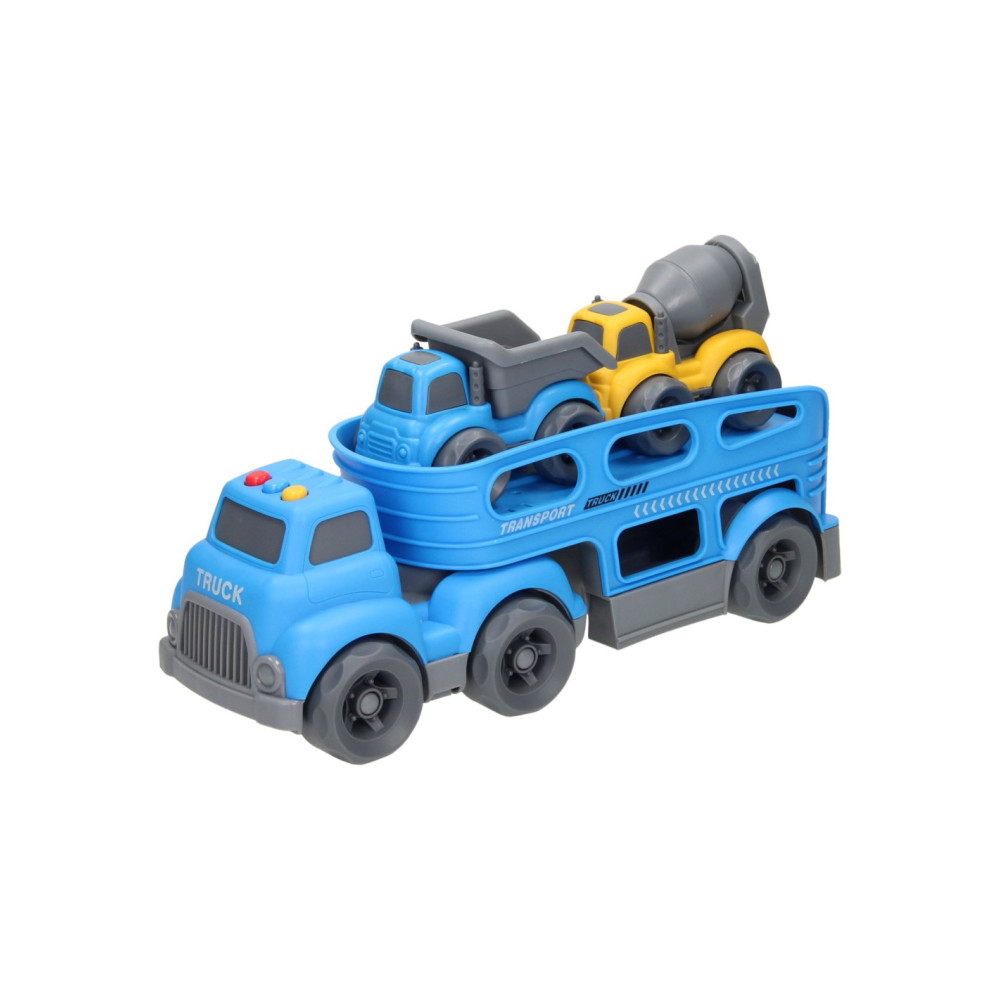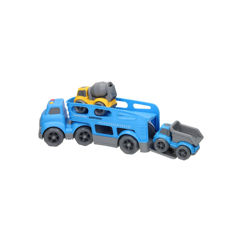 Blauwe autotransporter van stevig kunststof met 2 verdiepingen en 2 werkvoertuigen (blauw en geel). De truck heeft verschillende geluidseffecten en een openklapbare achterklep. De truck is 30 x 11 centimeter groot, de werkvoertuigen zijn 10,5 x 7 centimeter groot. Geschikt voor kinderen vanaf 3 jaar oud. Werkt op 3 knoopcelbatterijen (inbegrepen).