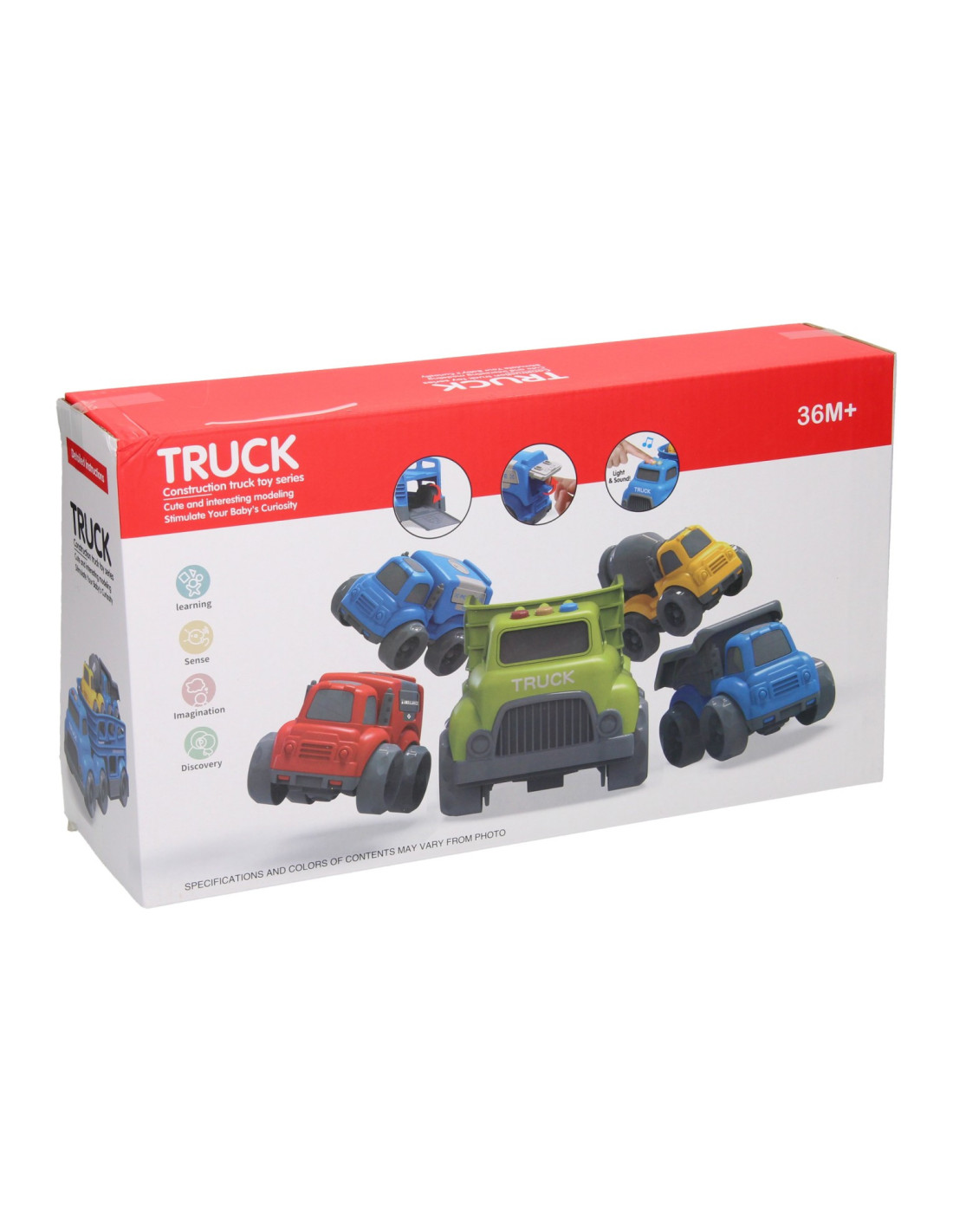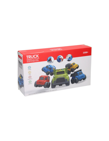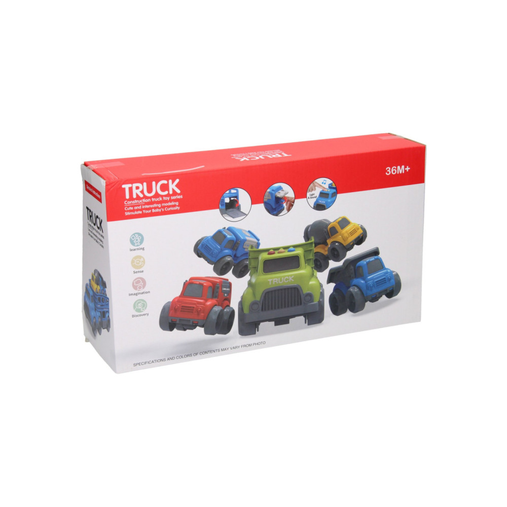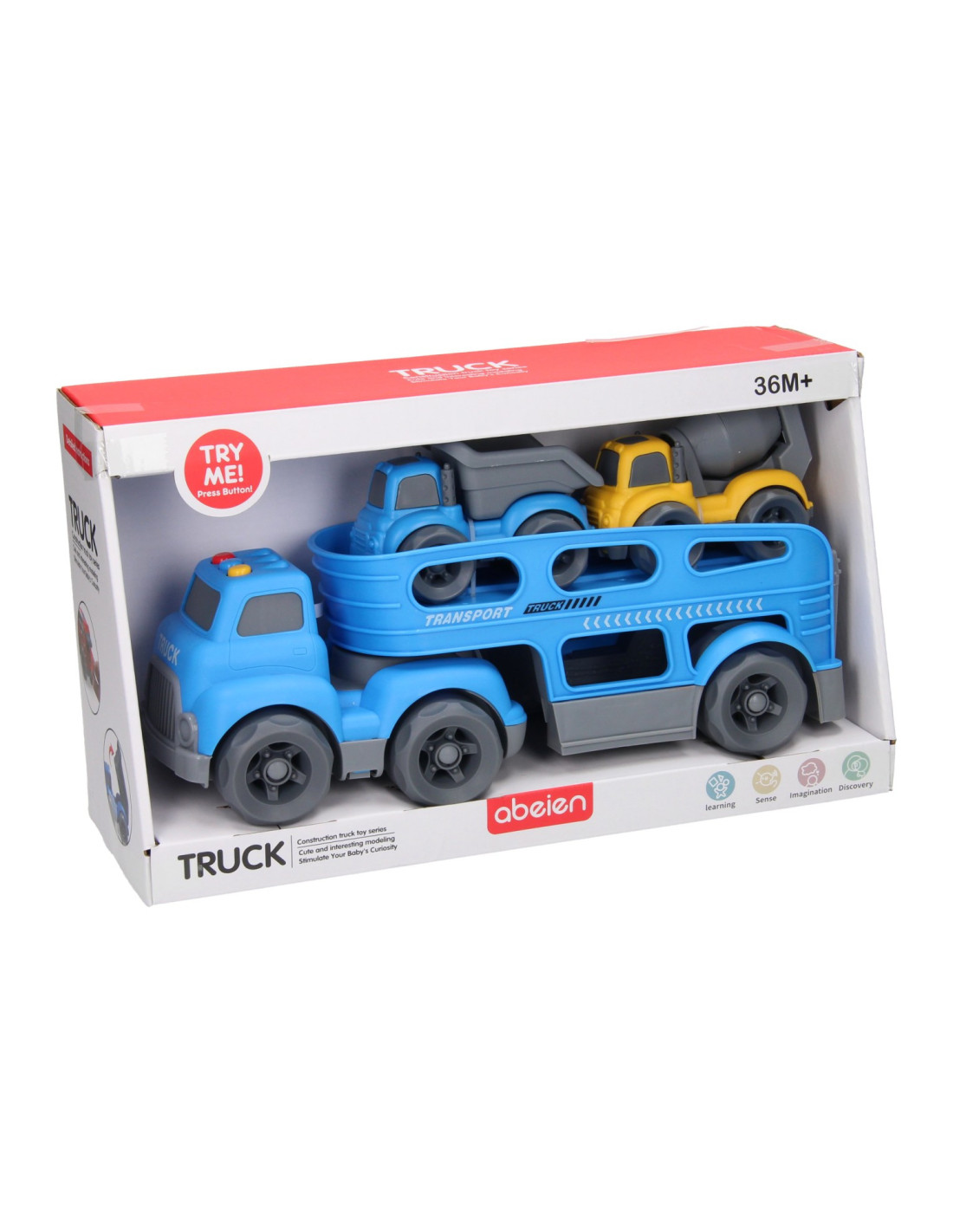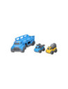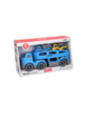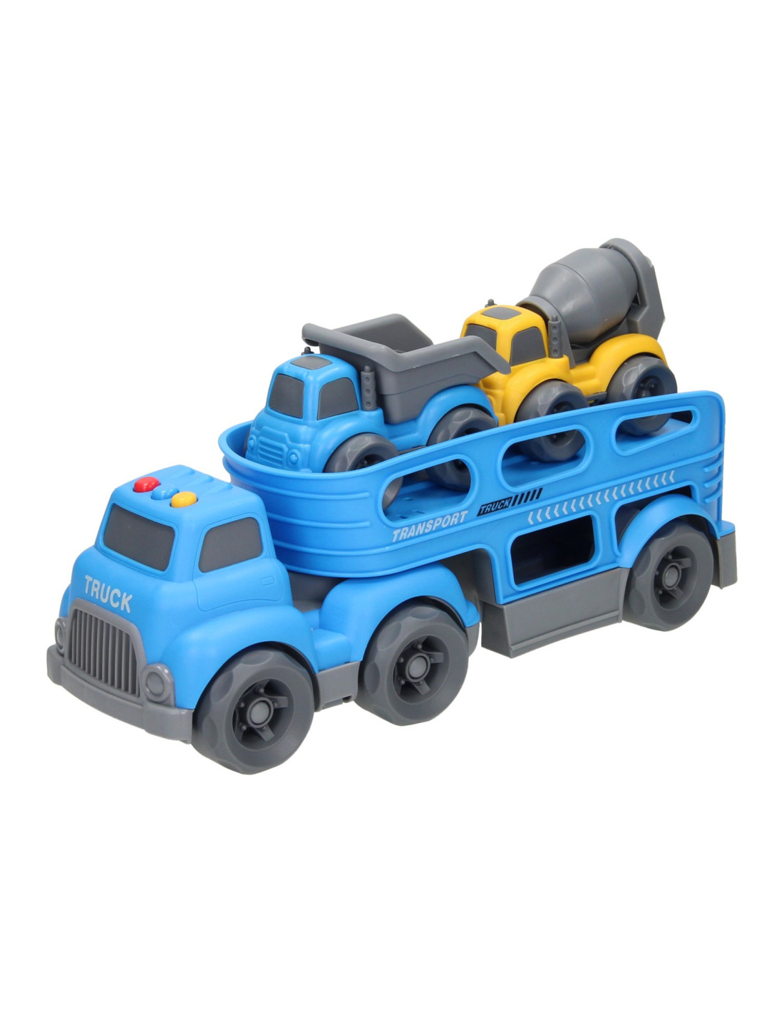 Blauwe autotransporter van stevig kunststof met 2 verdiepingen en 2 werkvoertuigen (blauw en geel). De truck heeft verschillende geluidseffecten en een openklapbare achterklep. De truck is 30 x 11 centimeter groot, de werkvoertuigen zijn 10,5 x 7 centimeter groot. Geschikt voor kinderen vanaf 3 jaar oud. Werkt op 3 knoopcelbatterijen (inbegrepen).