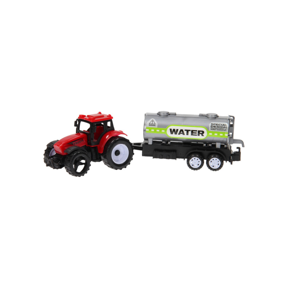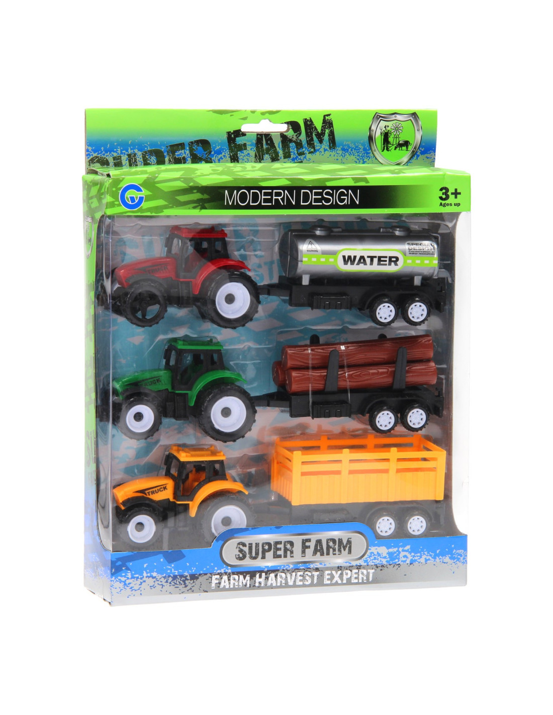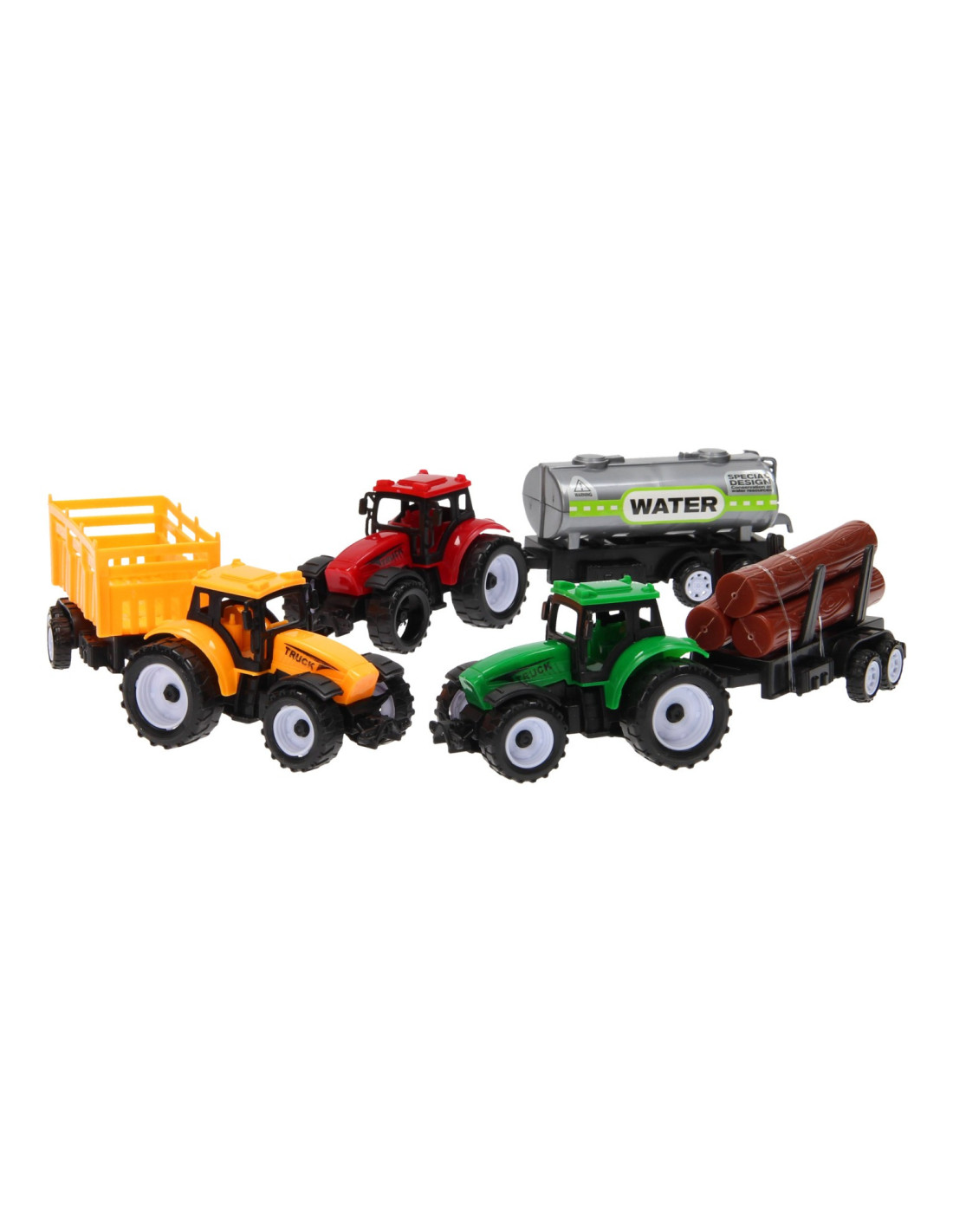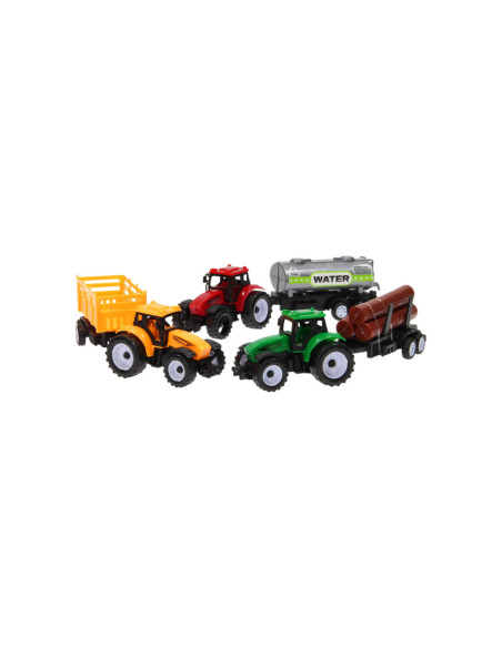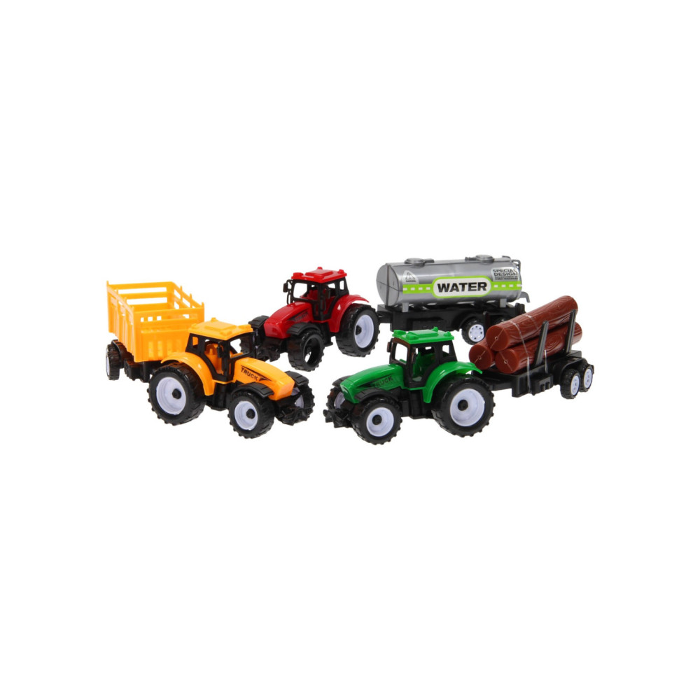 Beleef de leukste avonturen op de boerderij met deze 3-delige trekkerset. Verzamel met de groene trekker de boomstammen van het land, geef de gewassen water met de rode trekker met giertank of verzamel gras met behulp gele trekker met aanhanger. De trekkers met aanhangers zijn gemaakt van stevig kunststof en zijn niet van elkaar los te koppelen.