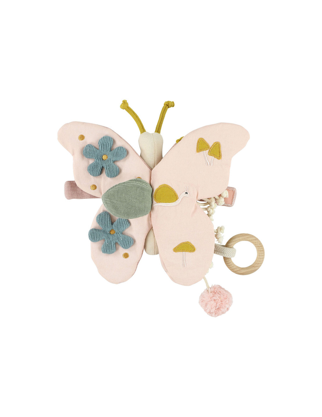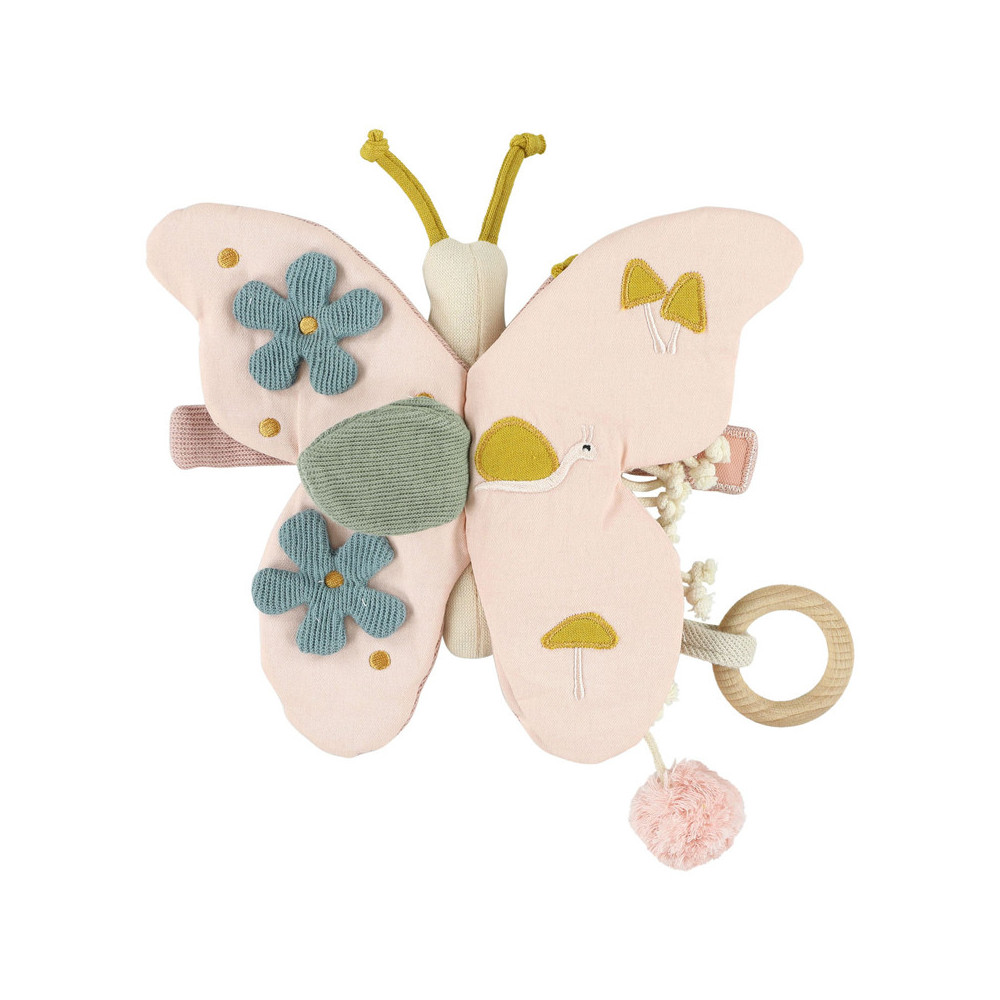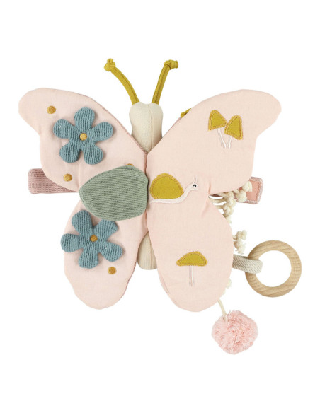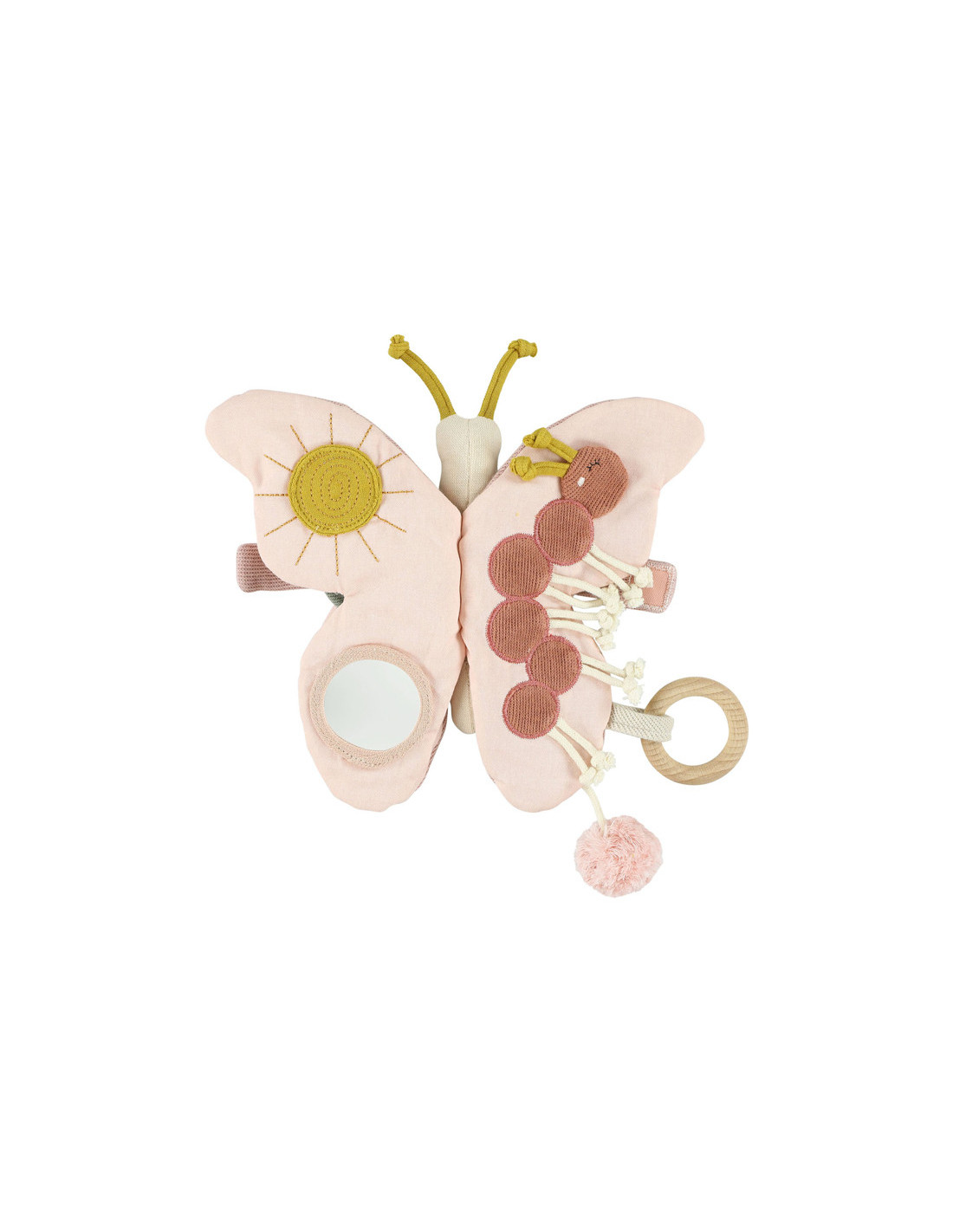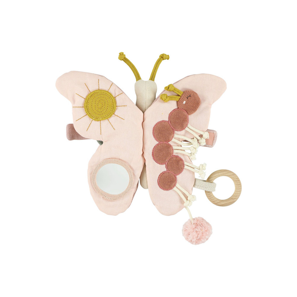 Dit activiteitenboek in de vorm van een prachtige vlinder zit vol leuke, interessante zaken om te voelen, te horen en te ontdekken. Het vertelt het wonderlijke verhaal van een rups die zich ontpopt tot prachtige vlinder! Het bevat een spiegel, veel touwtjes en flapjes om mee te spelen, een houten bijtring en een zachte pompon. Baby's genieten van de verschillende texturen die ze met hun vingertjes kunnen ontdekken. Het bandje om het boekje te sluiten werkt ook prima als een manier om het boek aan een kinderwagen te bevestigen, zodat het onderweg niet kwijtraakt.
