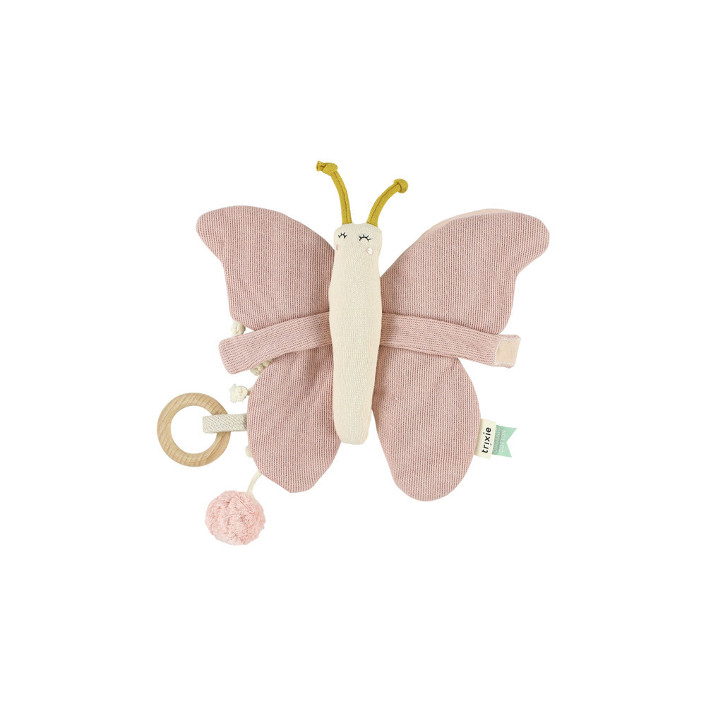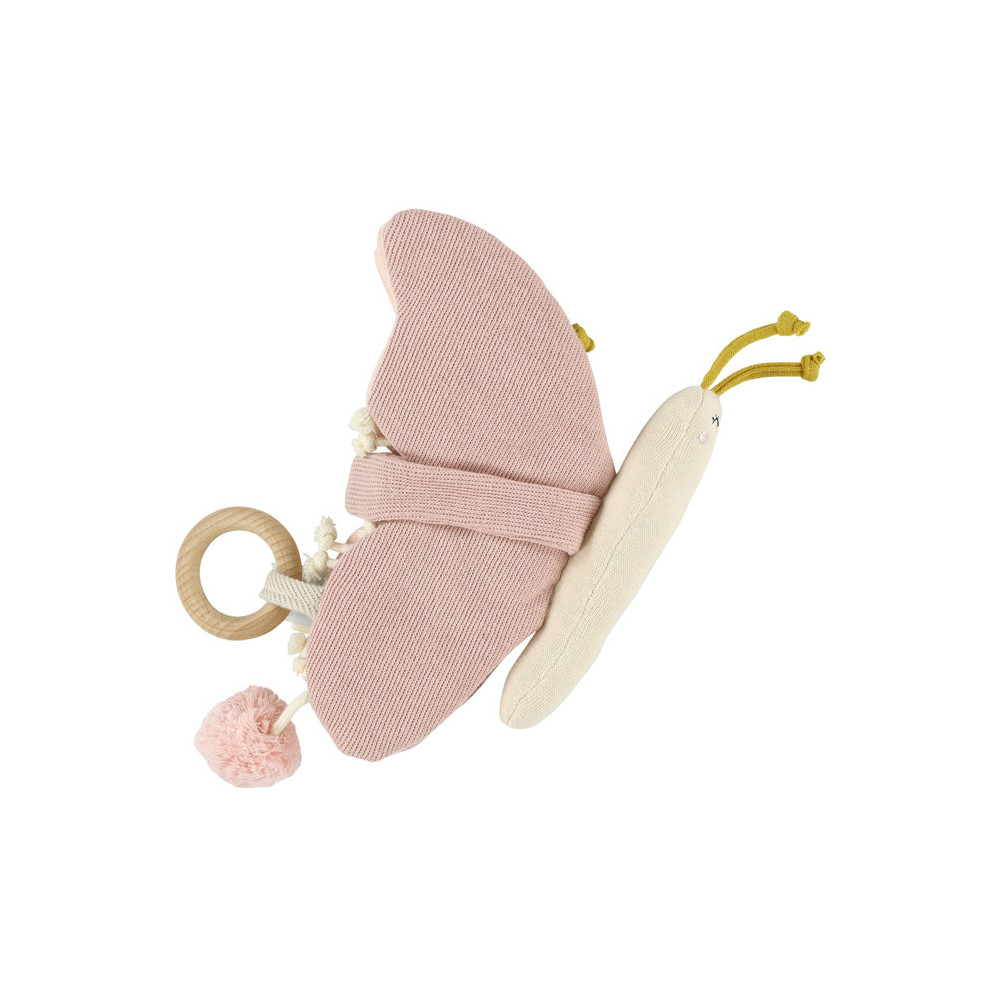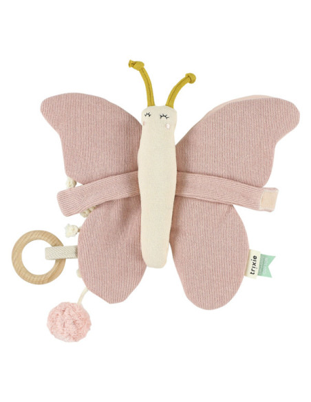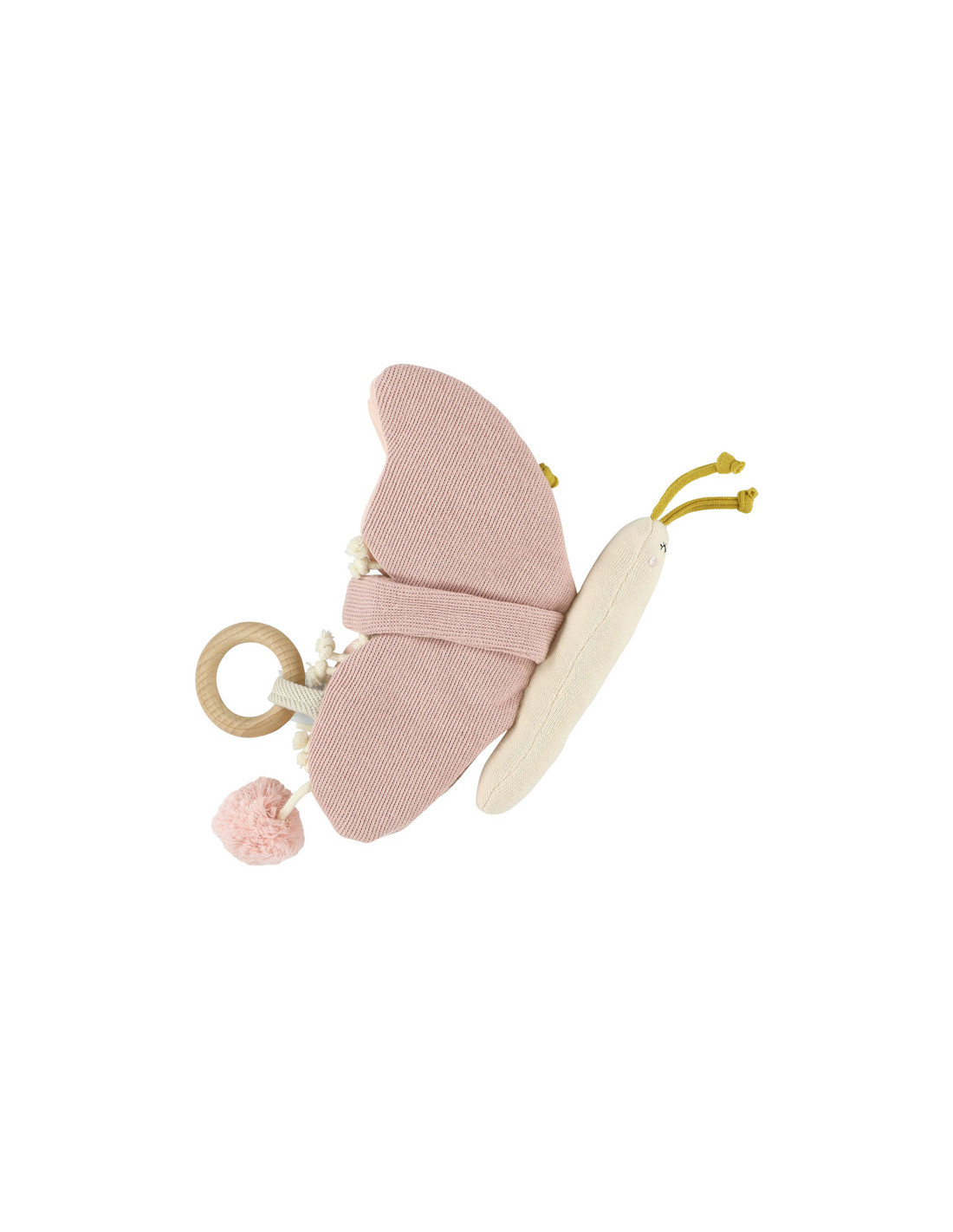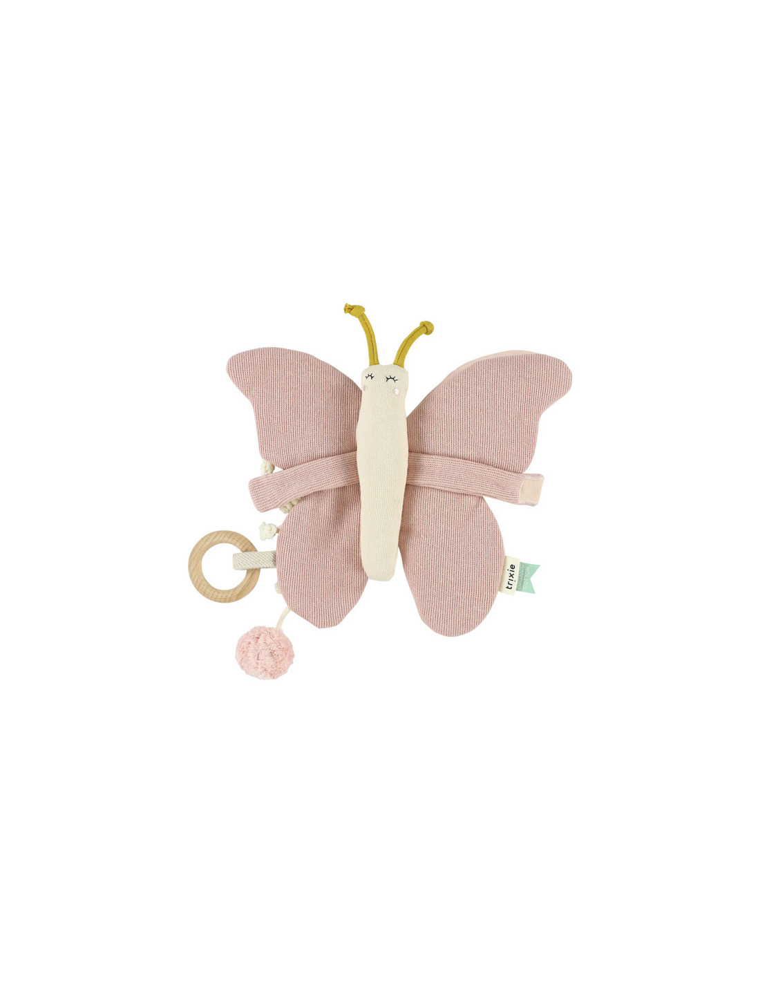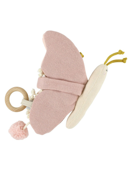 Dit activiteitenboek in de vorm van een prachtige vlinder zit vol leuke, interessante zaken om te voelen, te horen en te ontdekken. Het vertelt het wonderlijke verhaal van een rups die zich ontpopt tot prachtige vlinder! Het bevat een spiegel, veel touwtjes en flapjes om mee te spelen, een houten bijtring en een zachte pompon. Baby's genieten van de verschillende texturen die ze met hun vingertjes kunnen ontdekken. Het bandje om het boekje te sluiten werkt ook prima als een manier om het boek aan een kinderwagen te bevestigen, zodat het onderweg niet kwijtraakt.
