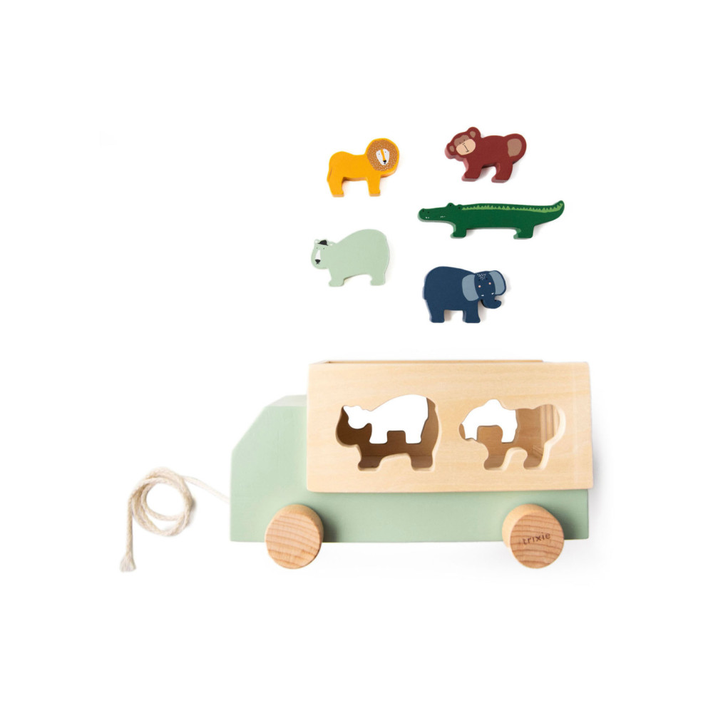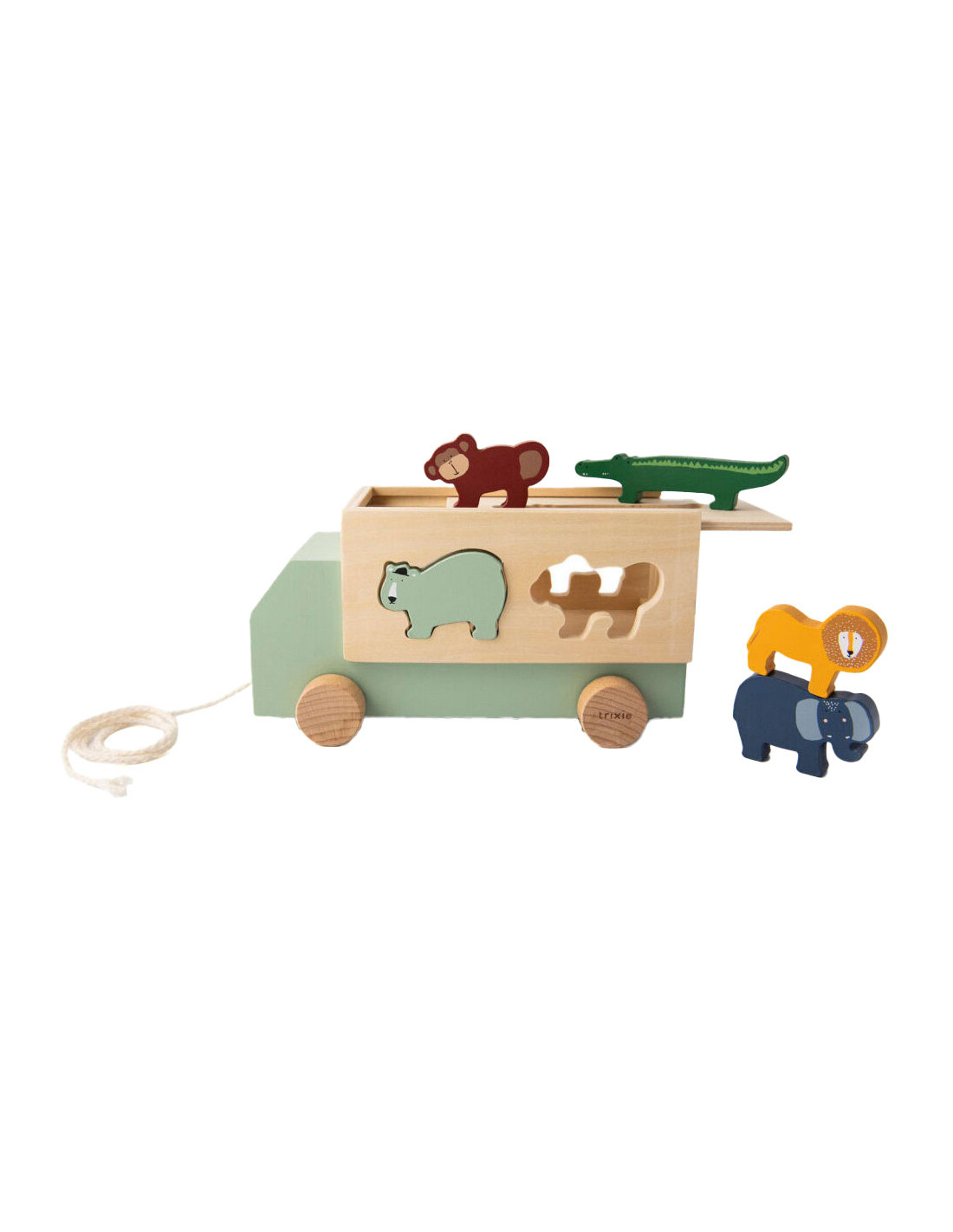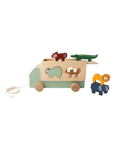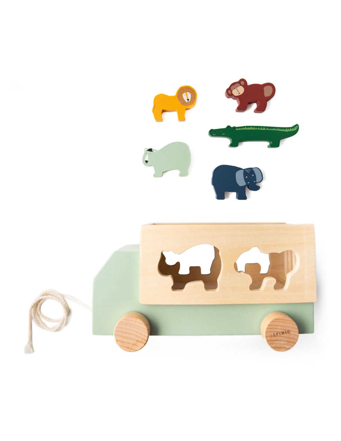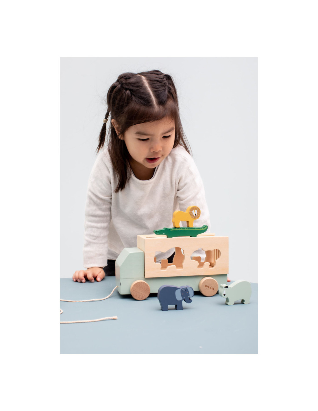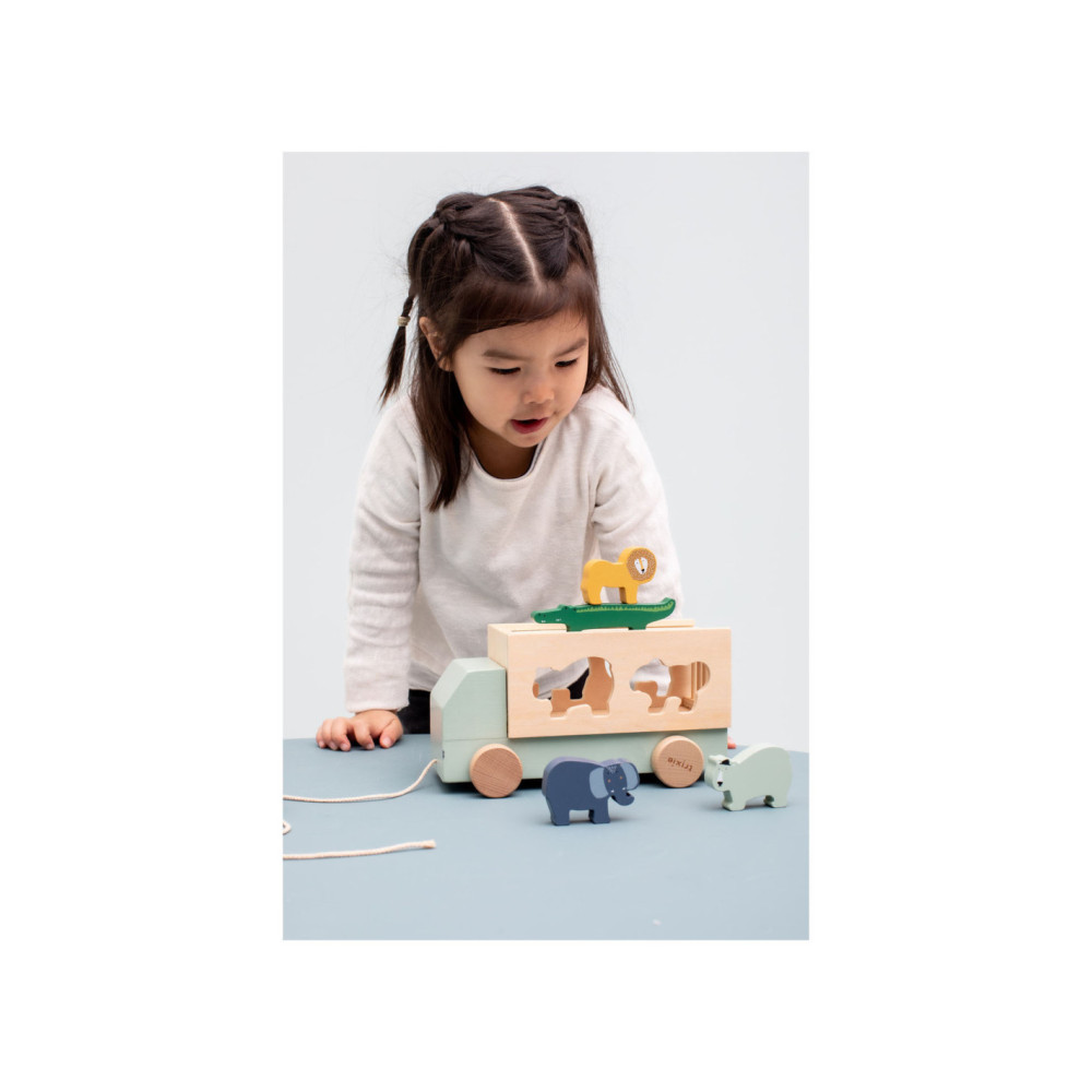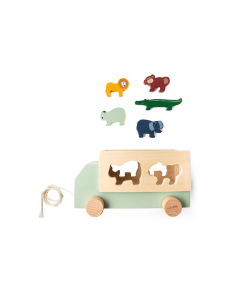 Op pad met alle dieren! Deze vrachtwagen heeft 5 dierenvrienden aan boord. Je kunt de vrachtwagen en alle dieren voorttrekken met het touwtje aan de voorkant. De openingen aan de zijkant van de vrachtwagen dagen kinderen uit om te puzzelen en hun fijne motoriek te verbeteren. Schuif de bovenkant van de vrachtwagen open om alle dieren er gemakkelijk uit te halen. Deze verschillende dieren zijn geweldig om de wildste avonturen mee te bedenken.