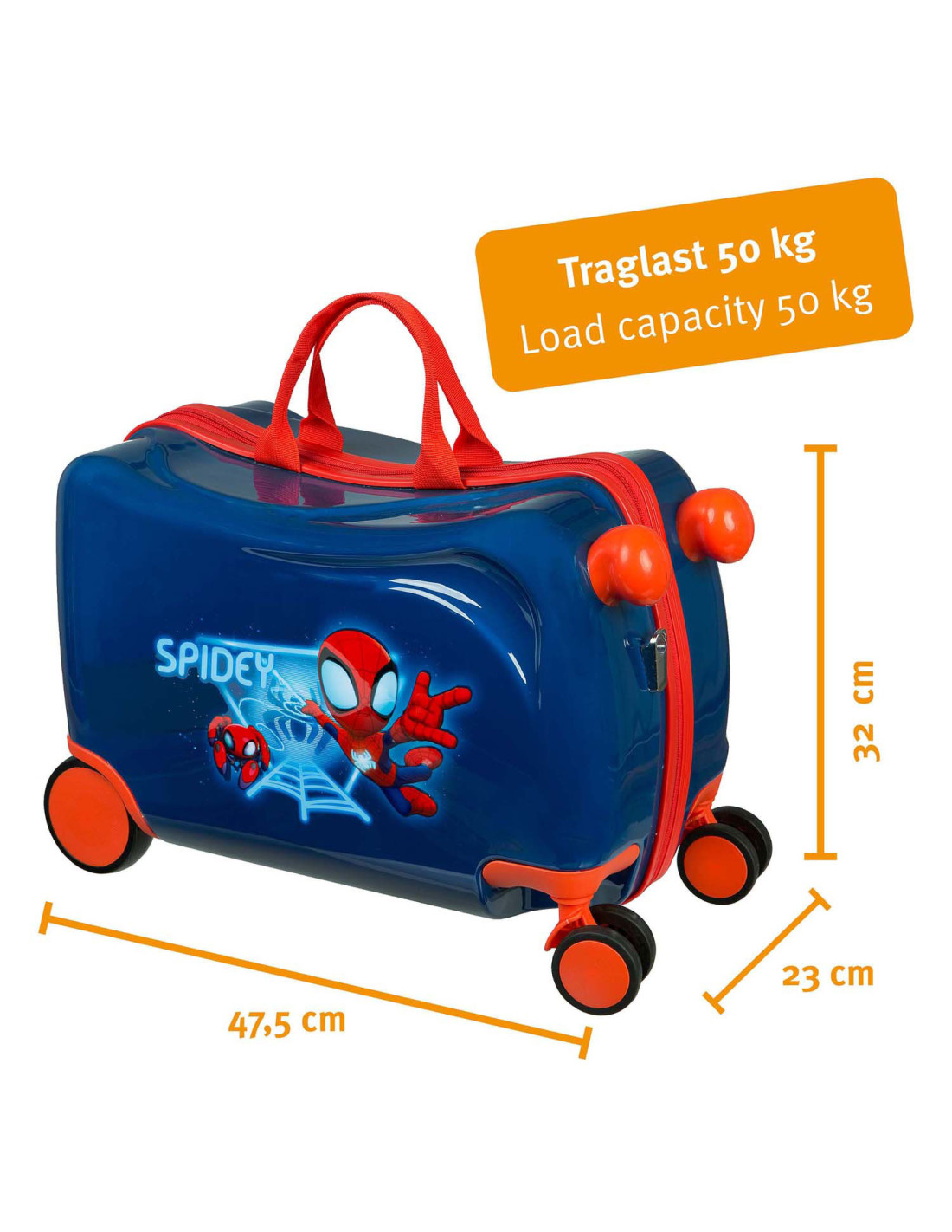 Spidey ride-on trolley. • 47,5 x 32 x 23 cm • Draaglast: 50 kg • Gewicht van de koffer: 1,7 kg