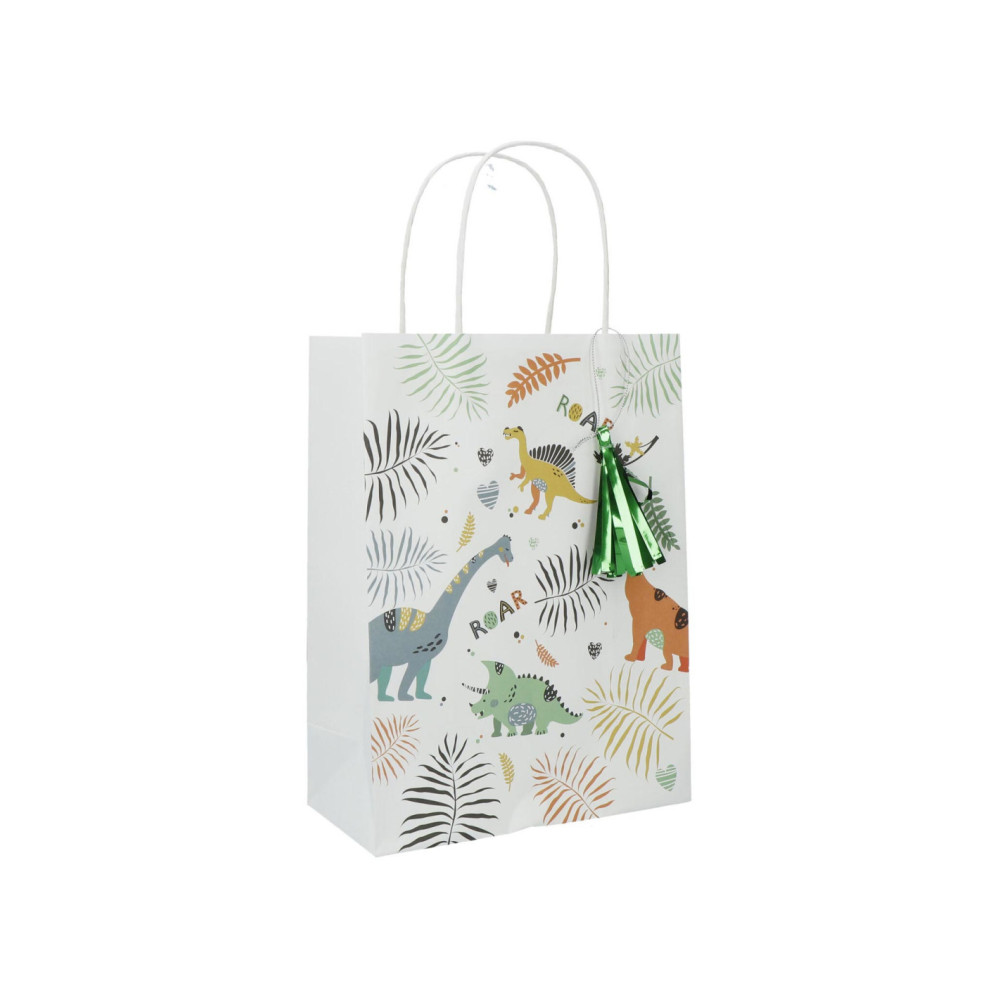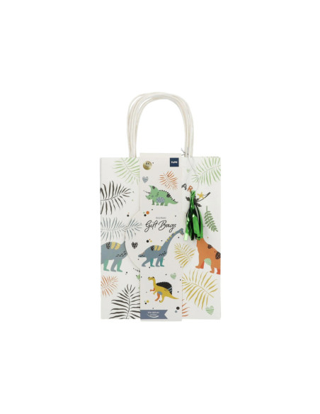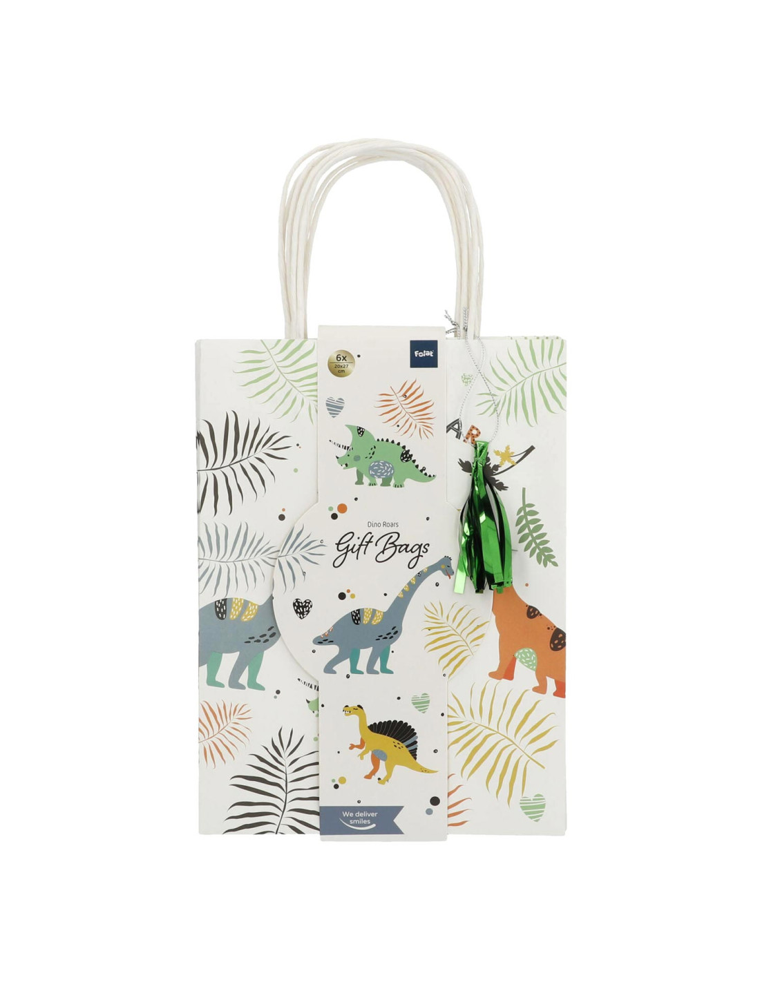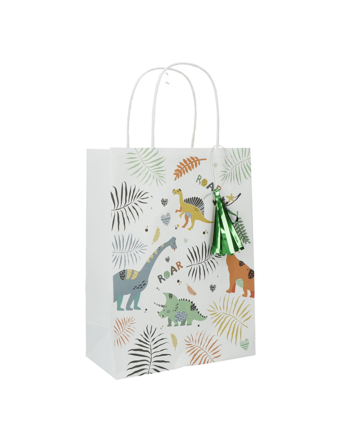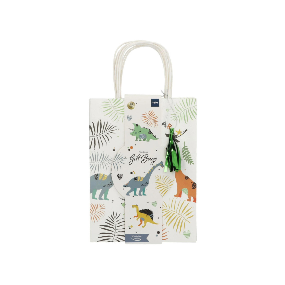 Zes stoere dinosaurus uitdeelzakjes voor cadeautjes of lekkernijen. Ga je trakteren en ben je fan van dino’s? Deze leuke cadeautasjes zijn perfect voor jouw feestje! De uitdeelzakjes zijn ongeveer 27 x 20 centimeter groot en zijn dubbelzijdig bedrukt. Aan elk tasje zit een tassel. De verpakking bevat 6 stuks. Gemaakt van papier.