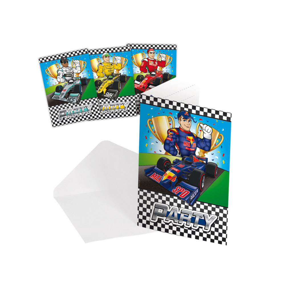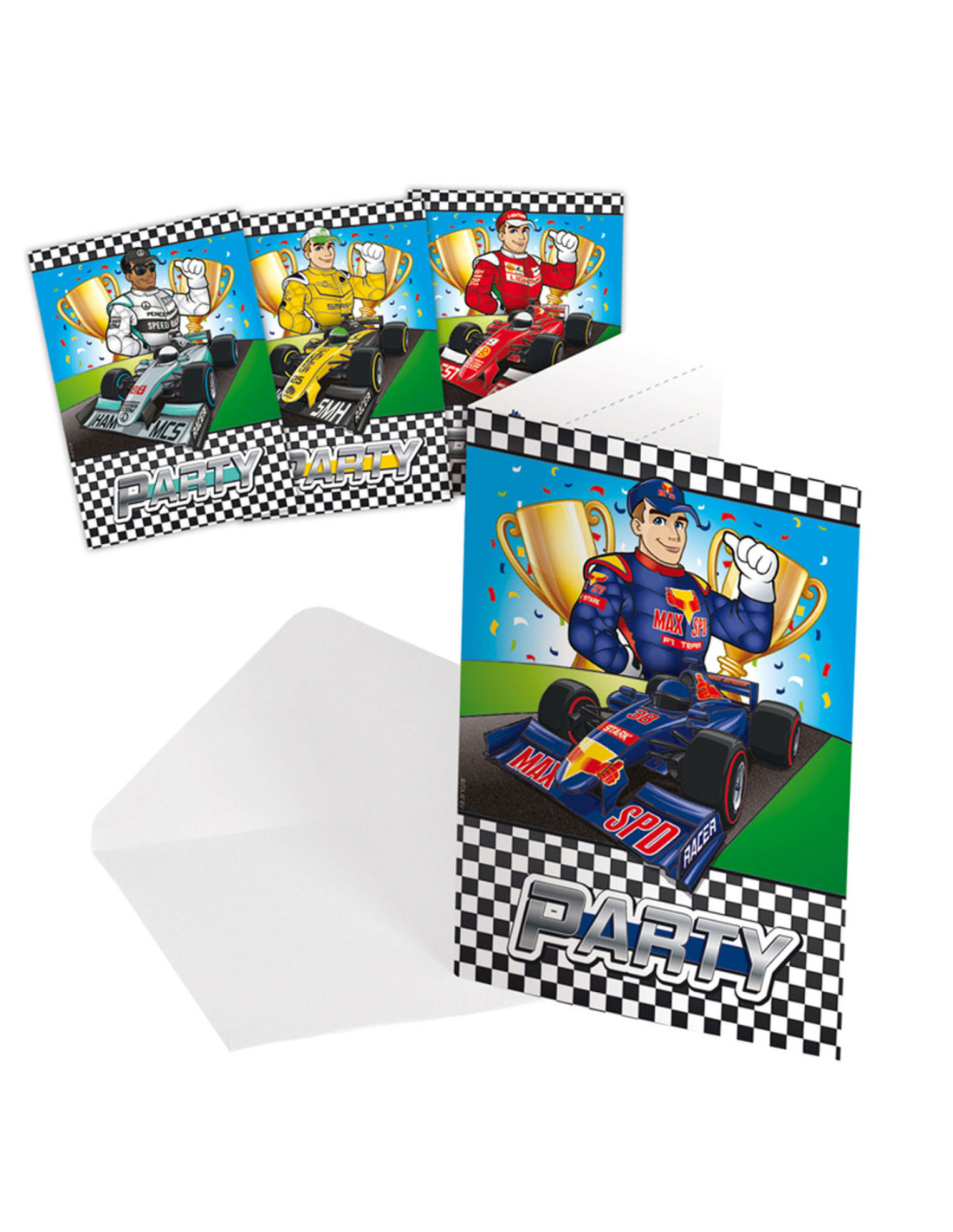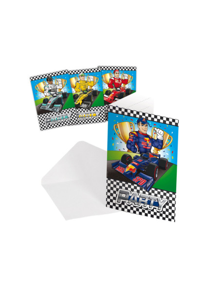Nodig je vrienden uit voor je verjaardagsfeestje met deze Formule 1 uitnodigingen. De 8 dubbele kaartjes hebben elk een afbeelding van coureur met zijn raceauto. Inclusief bijpassende enveloppen.