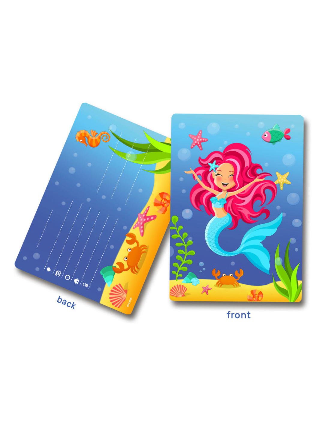 Nodig je vrienden uit voor je verjaardagsfeestje met deze zeemeermin uitnodigingen. De kaartjes hebben elk een afbeelding van een leuke zeemeermin. Verpakt per 8 stuks.