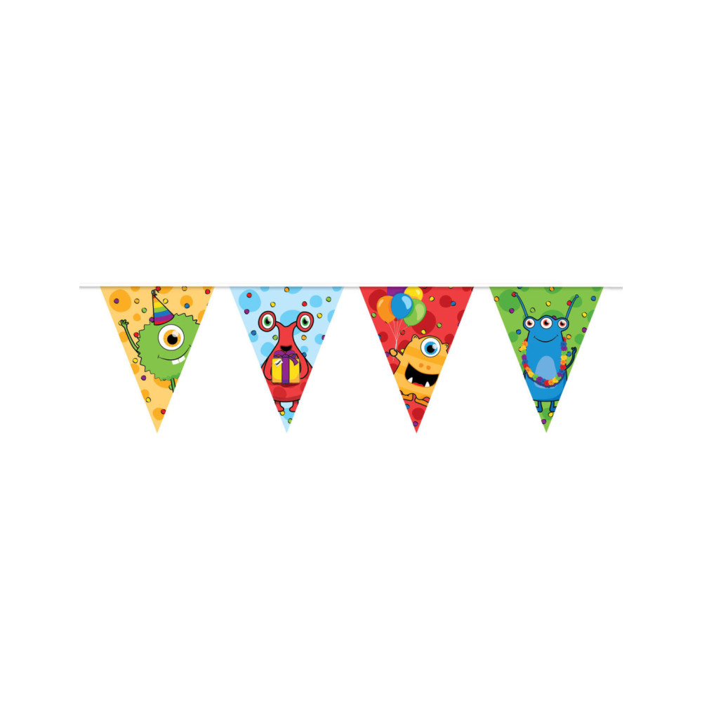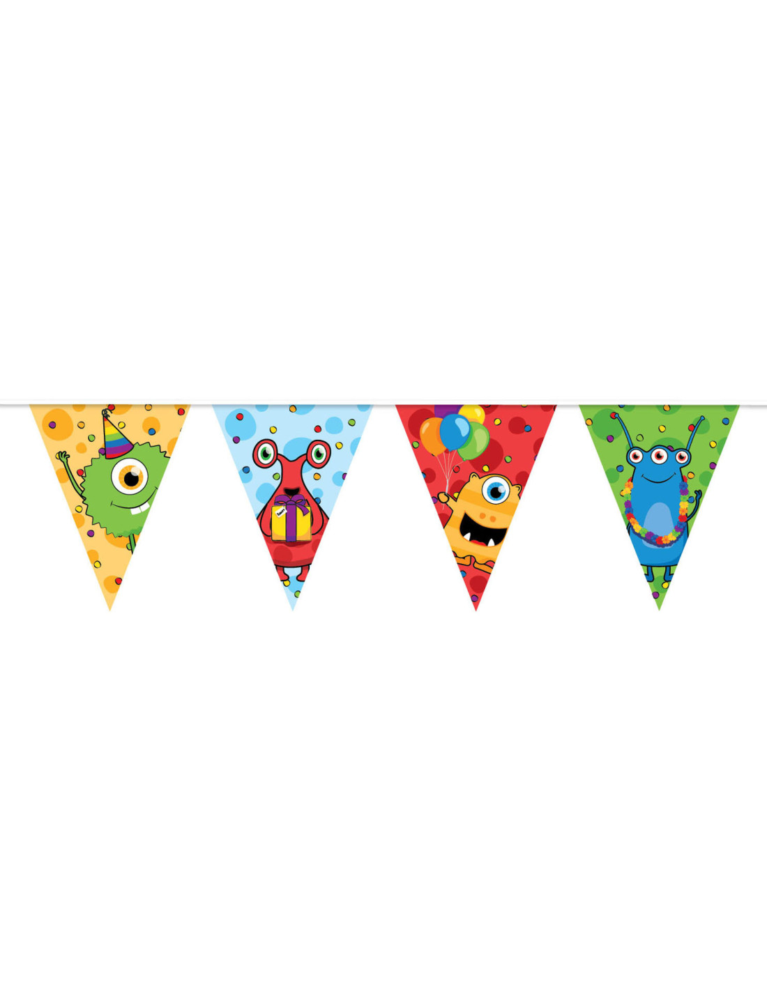 Vlaggetjes horen bij een feestje. Met deze Monster Party vlaggenlijn versier je je woonkamer feestelijk. De vlaggenlijn is 10 meter lang en op de vlaggen staan grappige monsters.