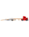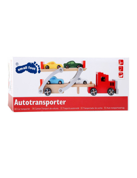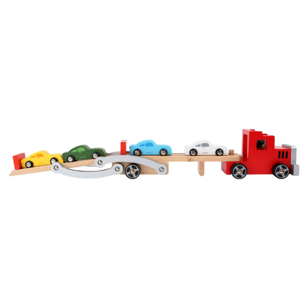 Attentie, hier wordt zwaar geladen! Om de nieuwe automodellen van A naar B te brengen, is dit transportvoertuig perfect. Er kunnen vier auto's op geplaatst worden. Door de kantelbare laadvloer kunnen de houten auto´s makkelijk de vrachtauto op rijden. De aanhanger kan losgekoppeld worden van de vrachtauto.