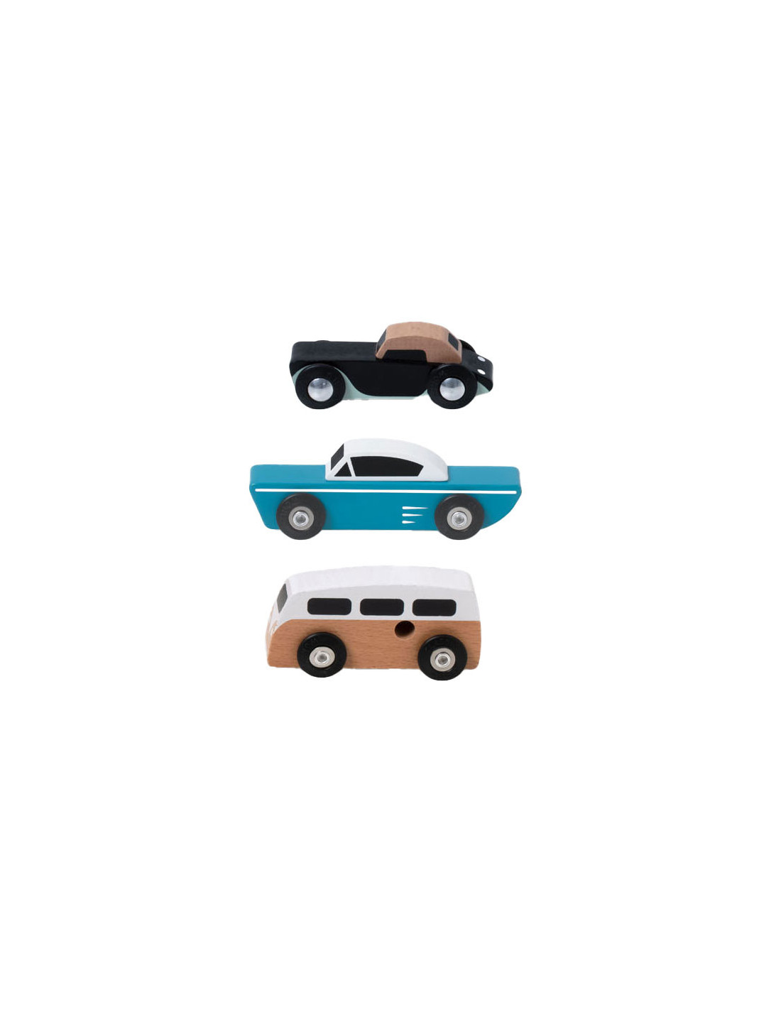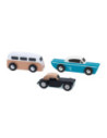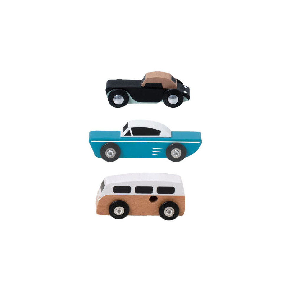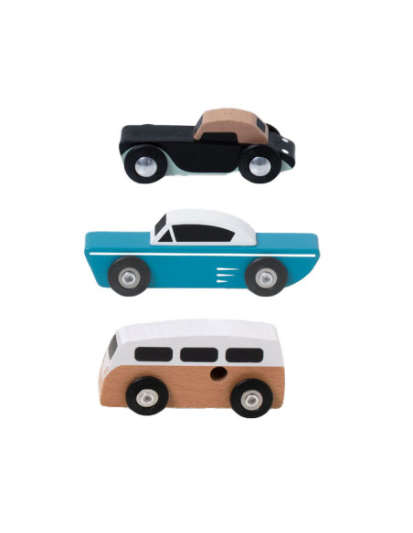 Deze set bevat een krachtige sedan, een cabriolet en een kleine bus. Geïnspireerd door de jaren 50, herinneren deze kleine auto's aan de gouden eeuw van de auto! Ze kunnen ook op treinrails rijden. Deze kleine auto's helpen uw kind bij het ontwikkelen van fijne motoriek en taal. Samen spelen helpt ook bij het ontwikkelen van sociale vaardigheden. Het hout is FSC.