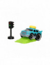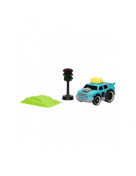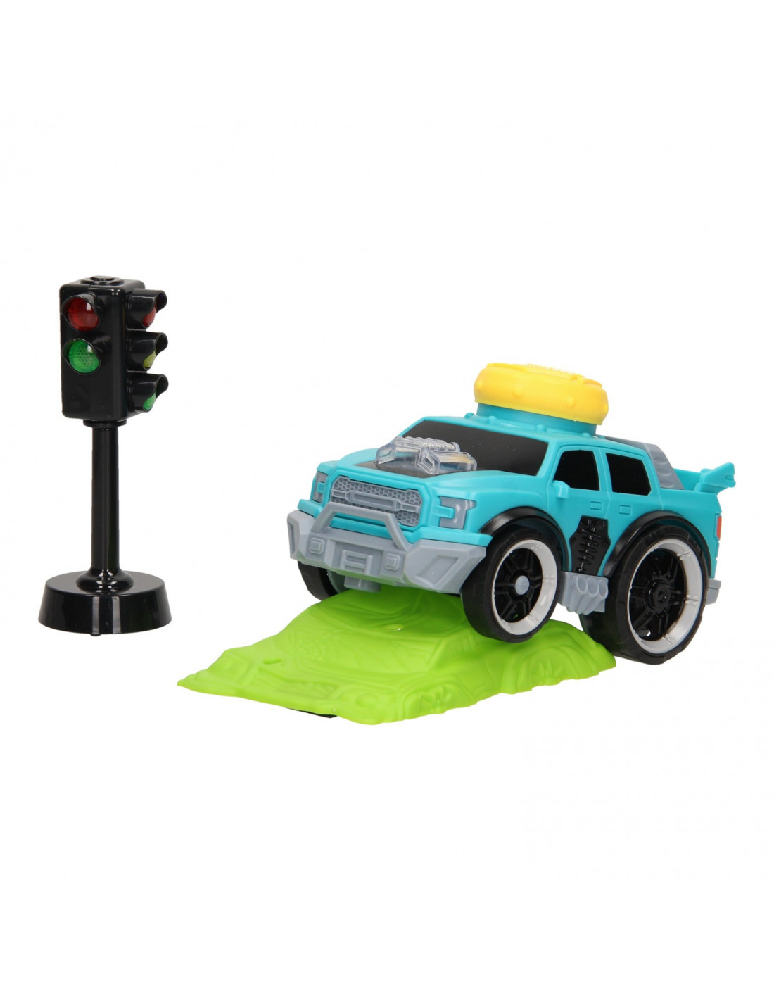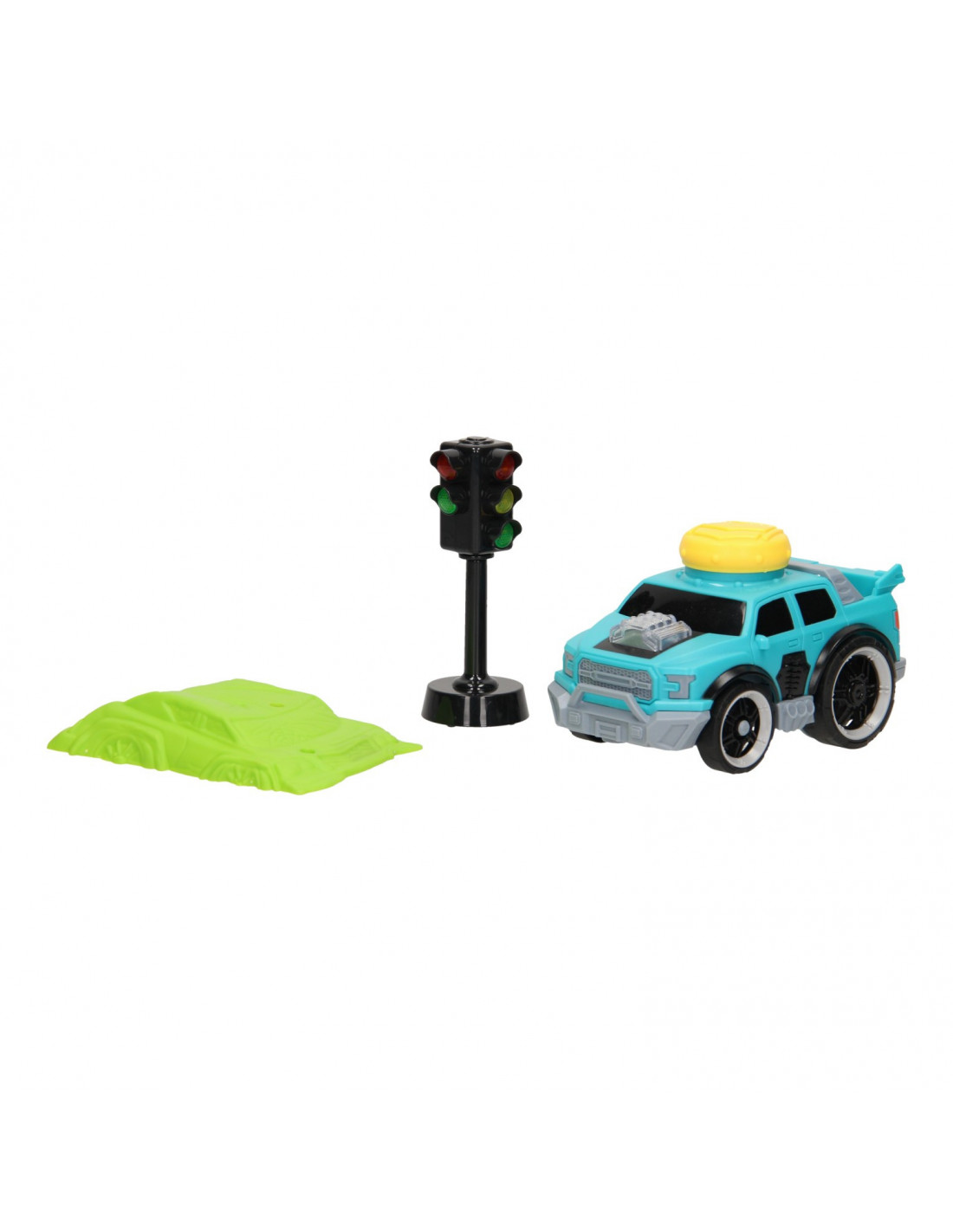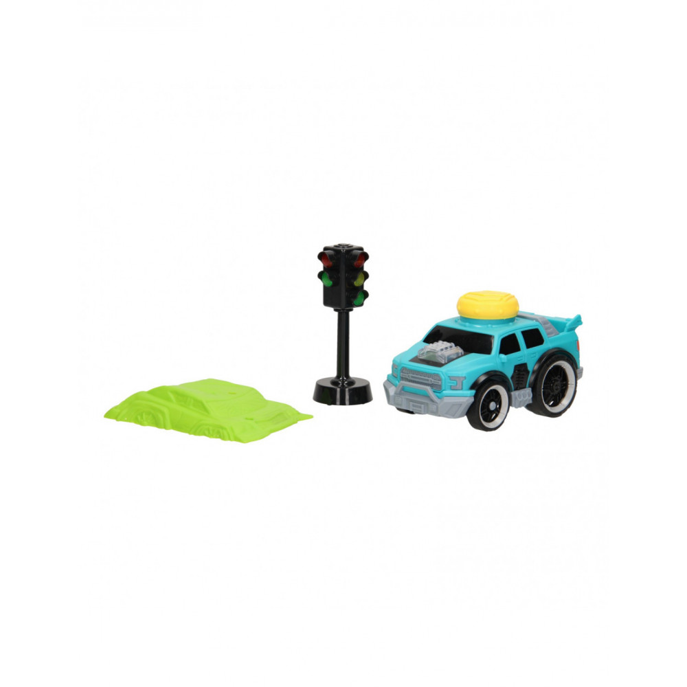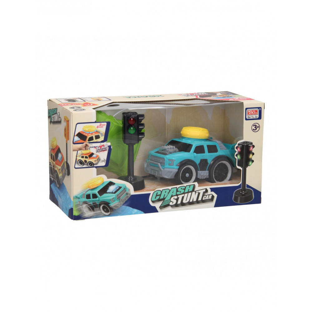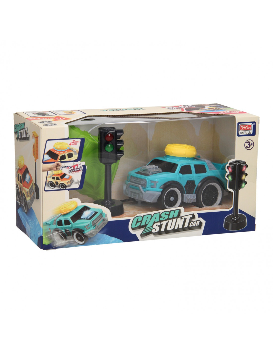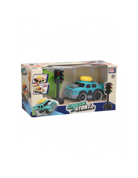 Crash Stunt Auto Set. De stuntauto met licht- en geluidseffecten heeft een blauwe kleur en is geschikt voor kinderen vanaf 3 jaar. Inclusief groen stuntparcours en een stoplicht. Werkt op 2 AA batterijen (niet inbegrepen).