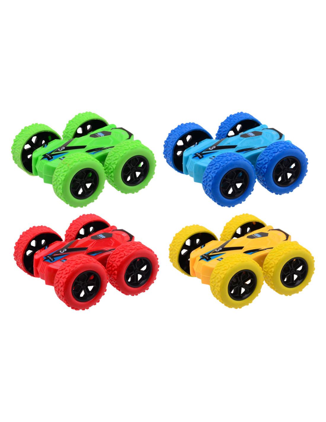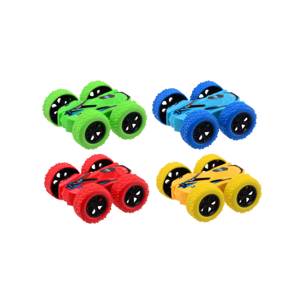 Flip over frictie auto, 4 assorti. De auto heeft een formaat van 8,5 x 3,5 x 8,5 cm.