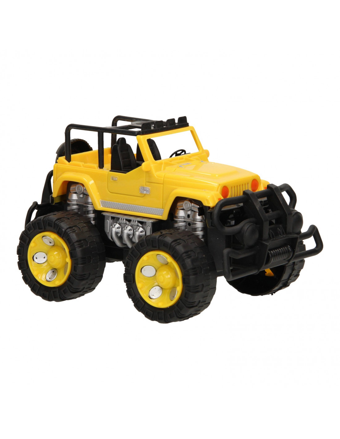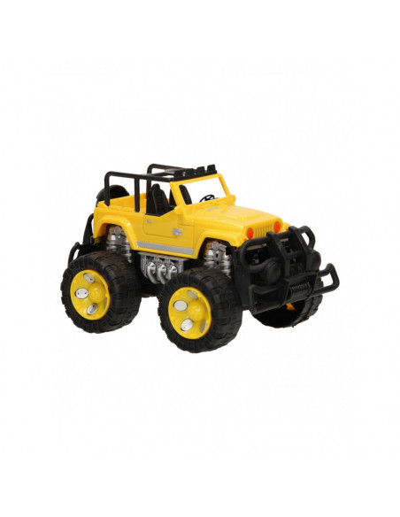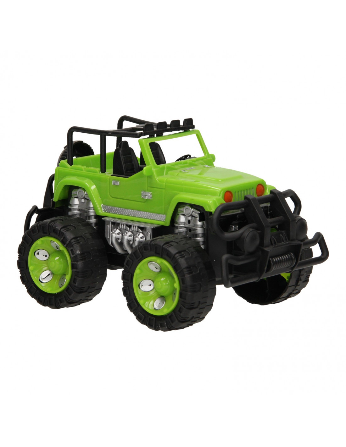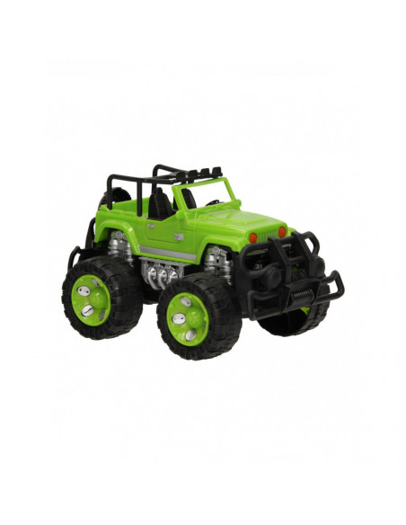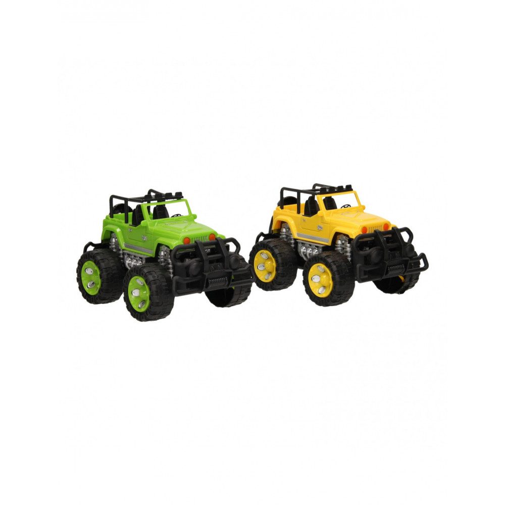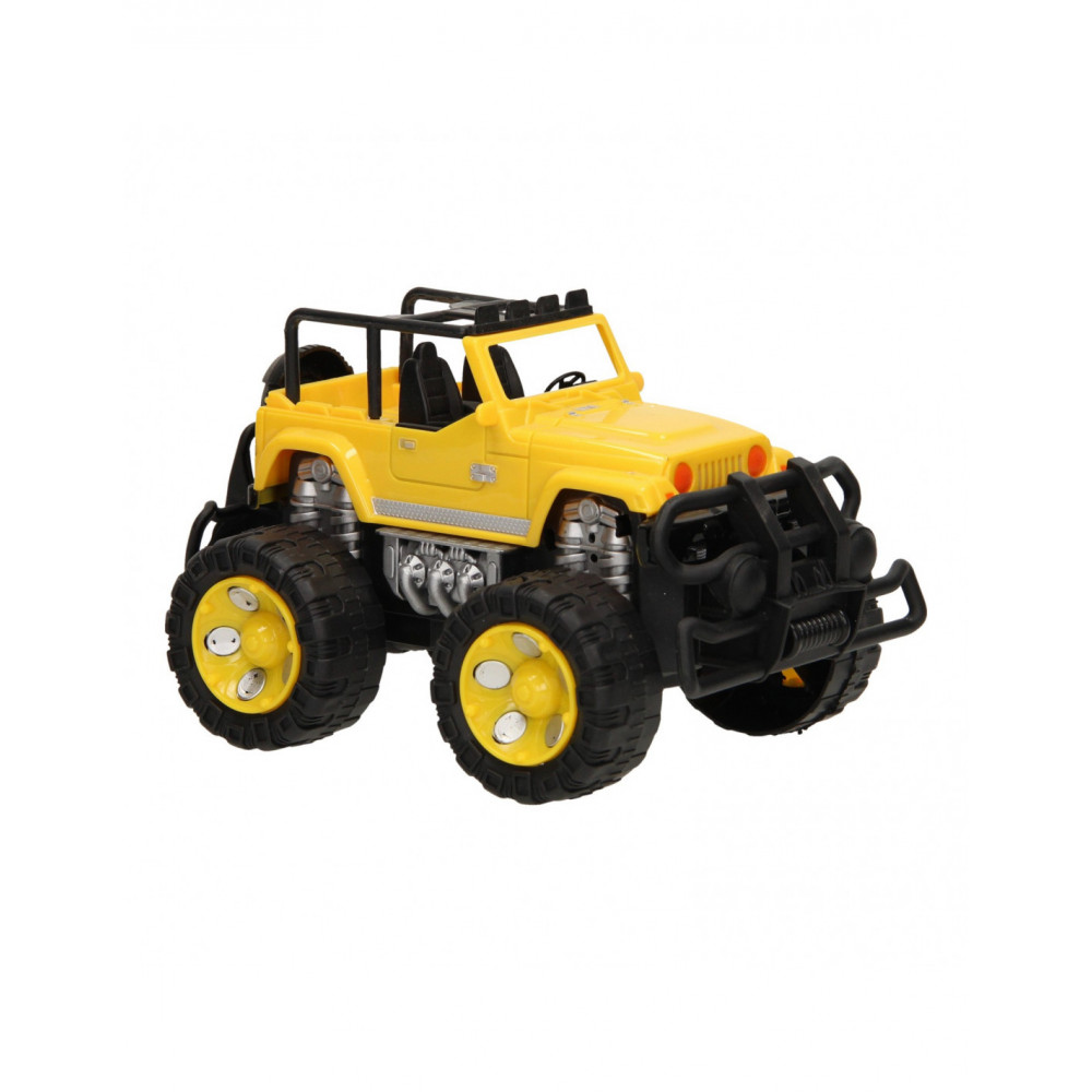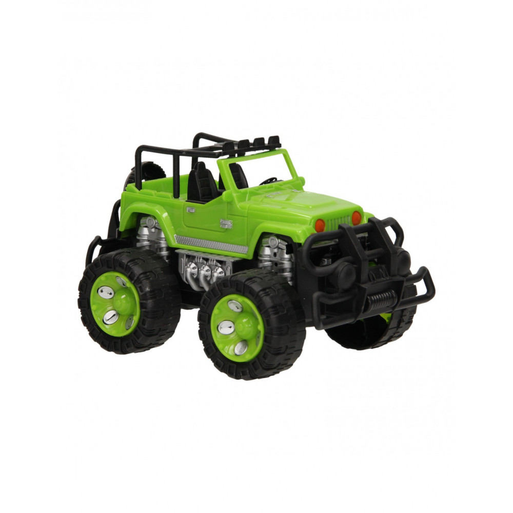 Een stoere terreinwagen met grote wielen en een frictiemotor. De wagen schiet naar voren schiet wanneer je hem naar achteren trekt. De chroomkleurige details maken dat de auto er levensecht uit ziet.