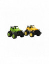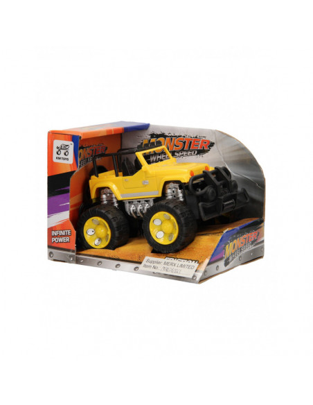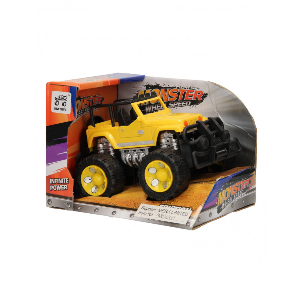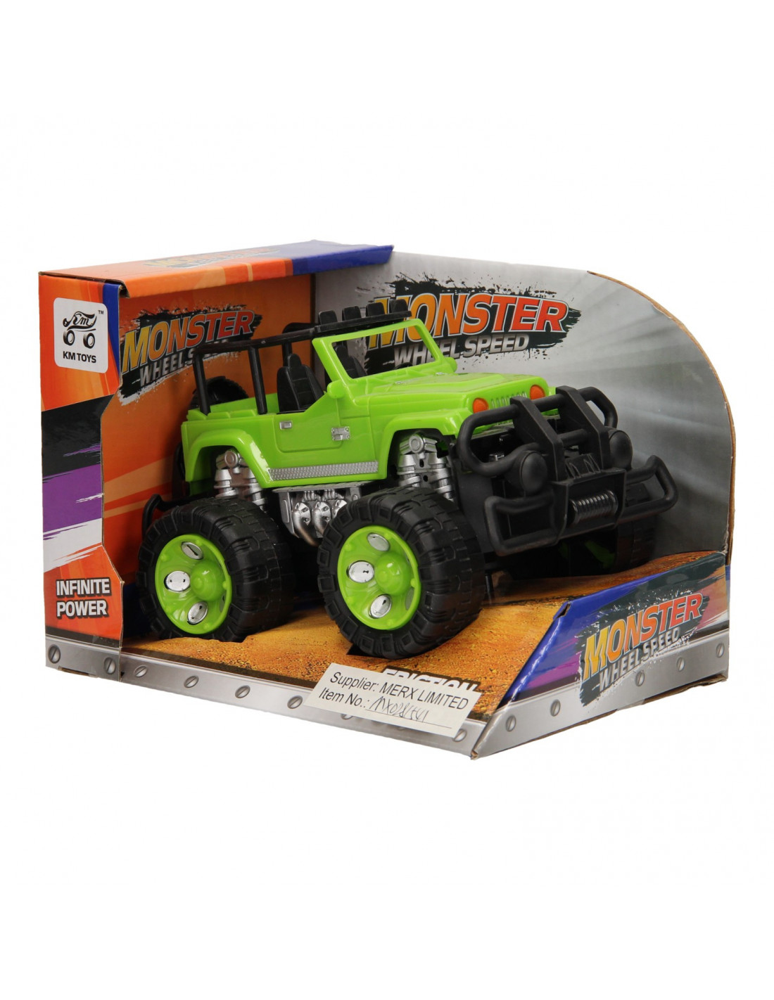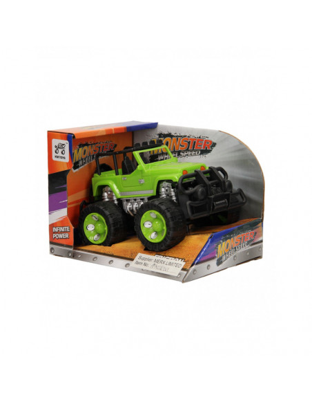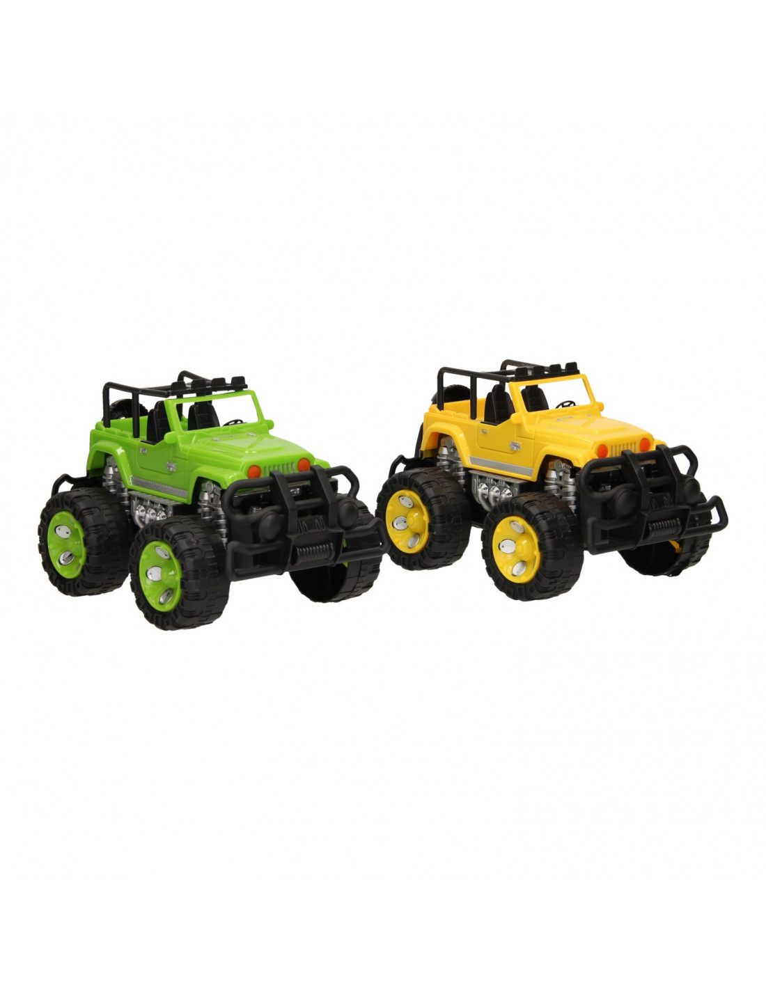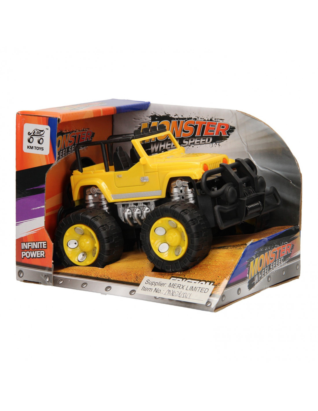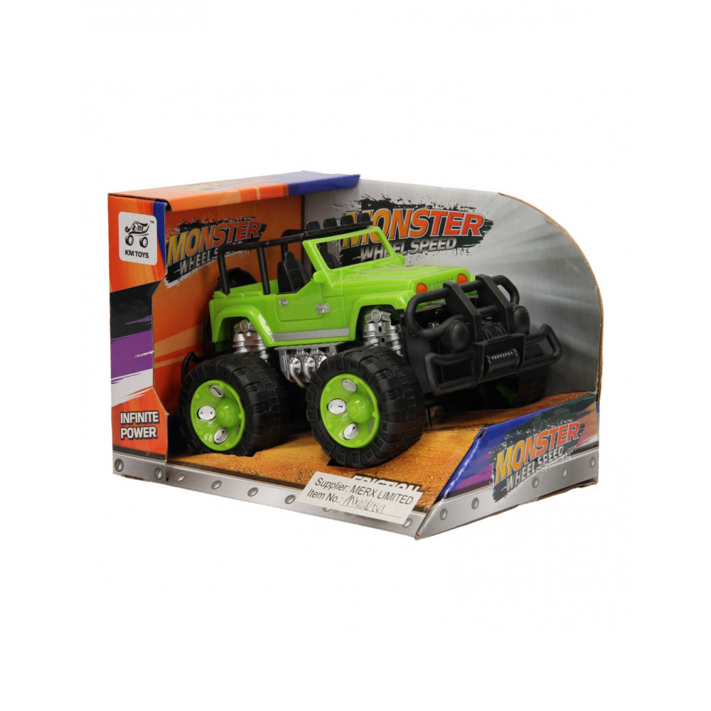 Een stoere terreinwagen met grote wielen en een frictiemotor. De wagen schiet naar voren schiet wanneer je hem naar achteren trekt. De chroomkleurige details maken dat de auto er levensecht uit ziet.