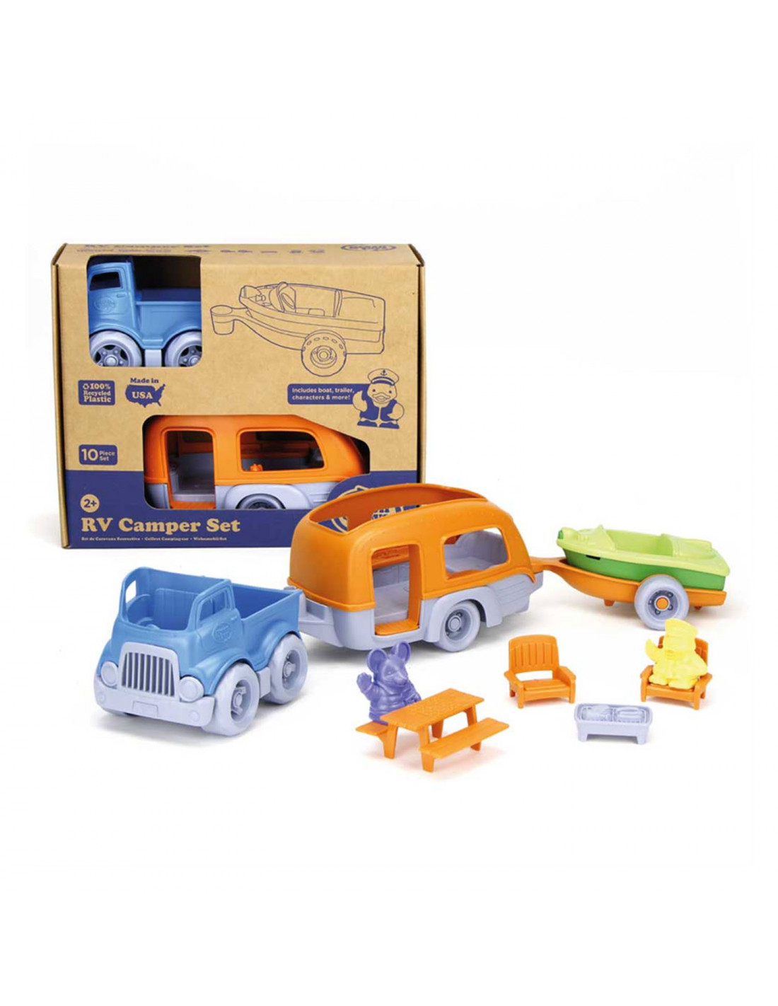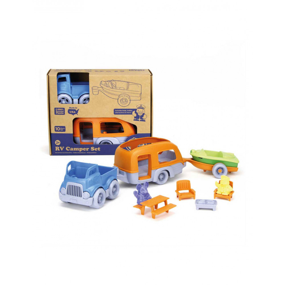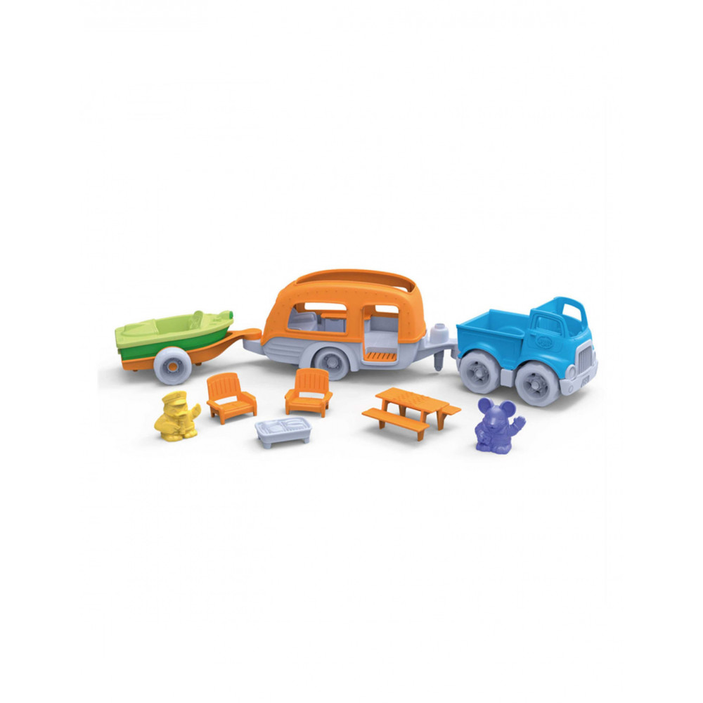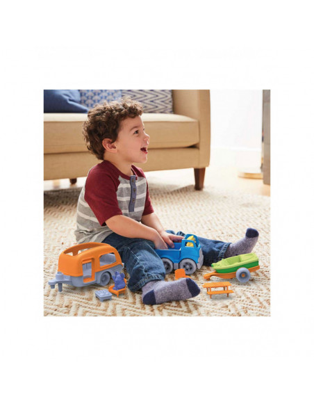 Green Toys camper set van 100% gerecycled kunststof. De duurzame set bevat een pick-uptruck, caravan, boot, boottrailer, picknicktafel, barbecue, twee tuinstoelen en 2 speelfiguren.