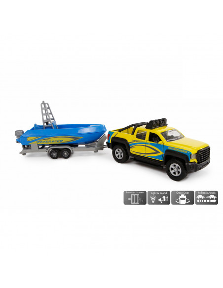 De wagen inclusief aanhanger is 29 centimeter lang. Gemaakt van kunststof en metaal. Werkt op batterijen (inbegrepen).