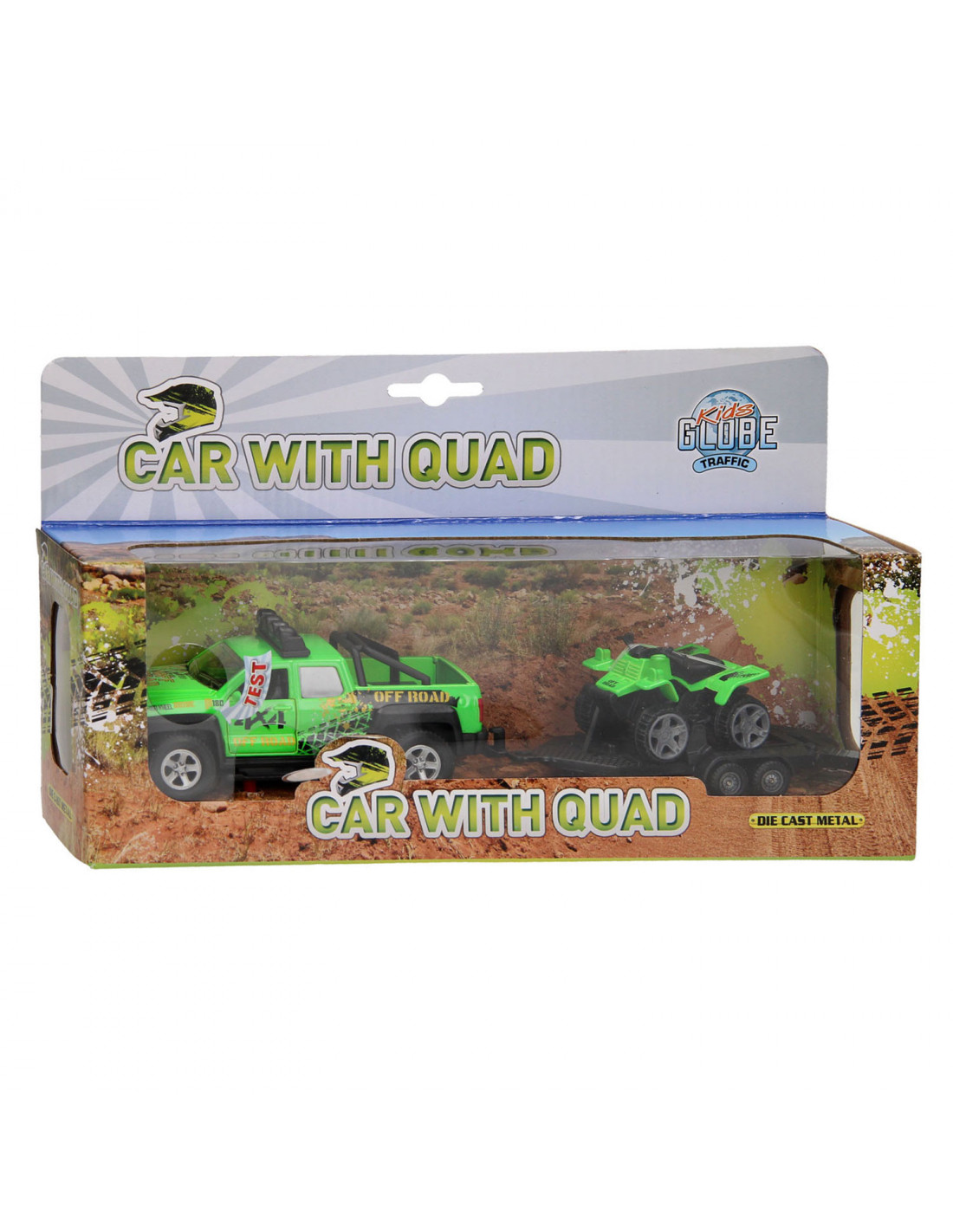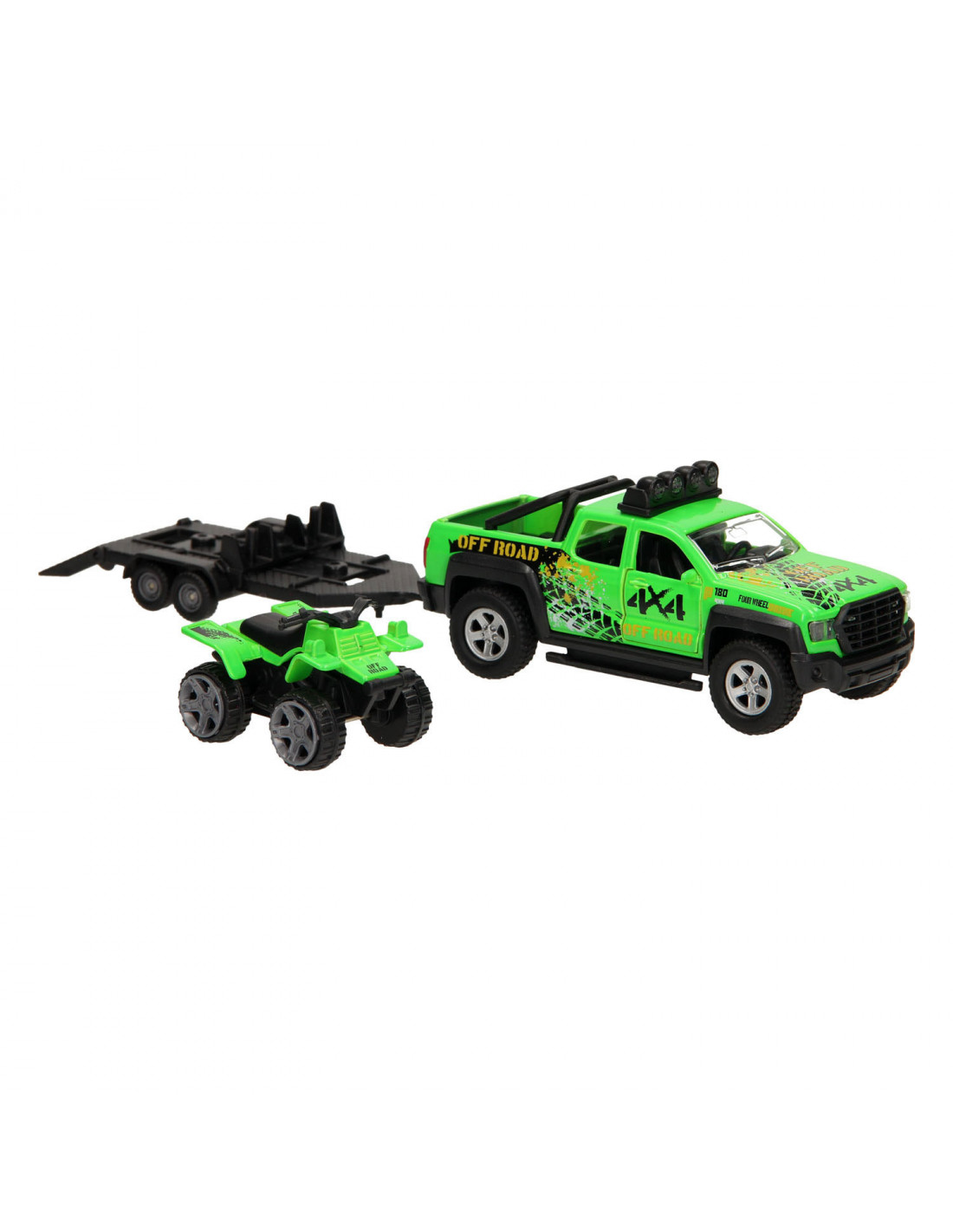 Kids Globe terreinwagen met trailer met quad licht geluid. De knalgroene terreinwagen is gemaakt van kunststof en heeft een pullback functie. De deuren kunnen open en dicht. Werkt op batterijen (inbegrepen). De set is 29 centimeter lang.