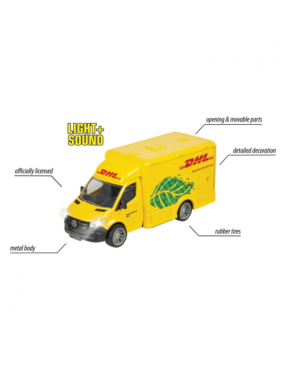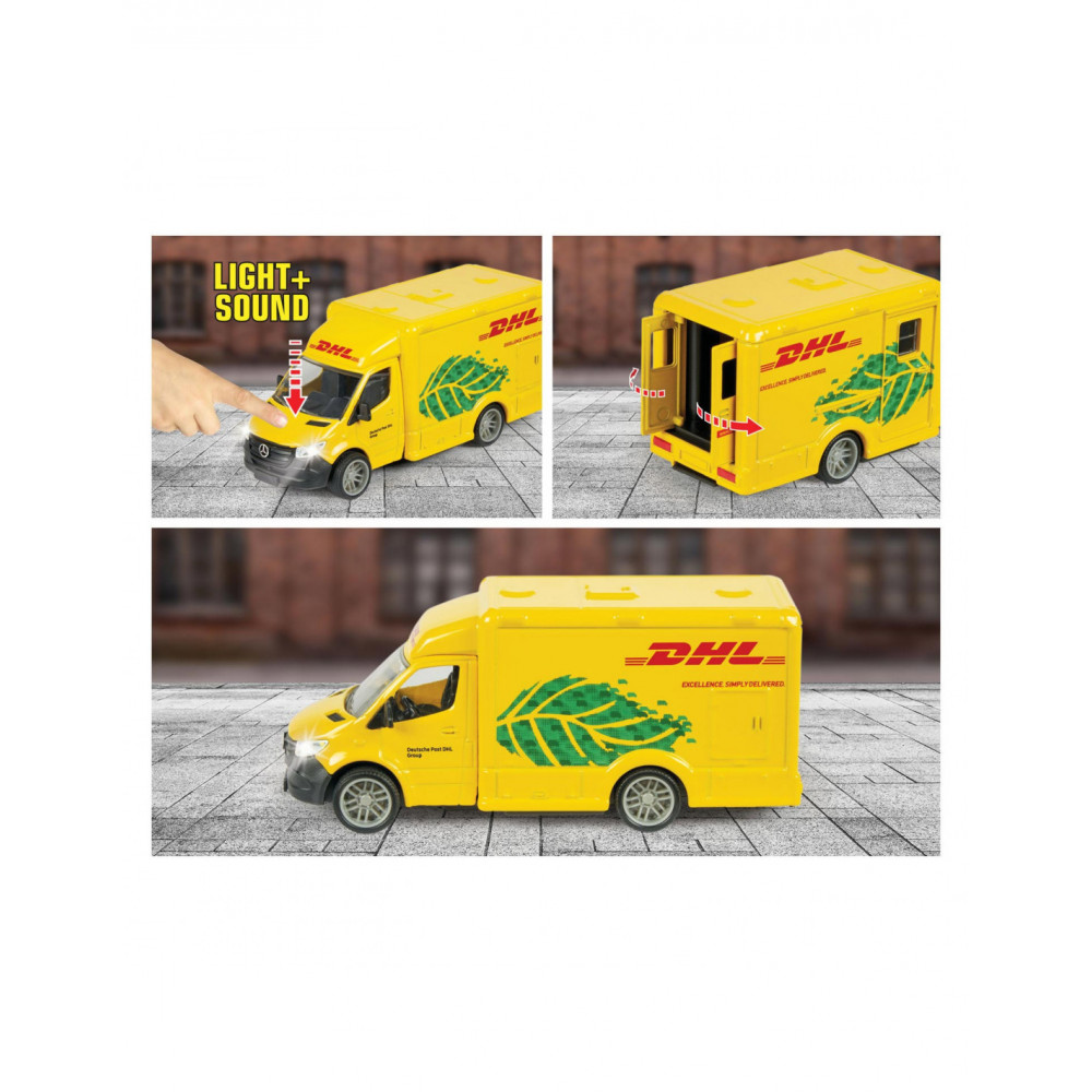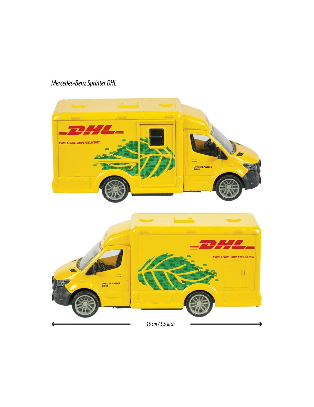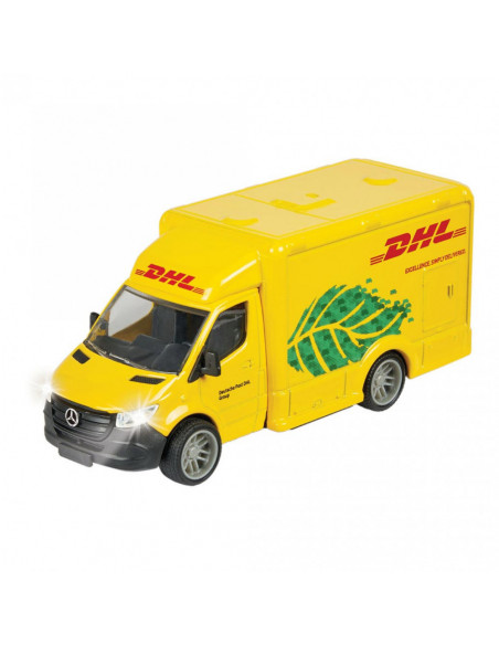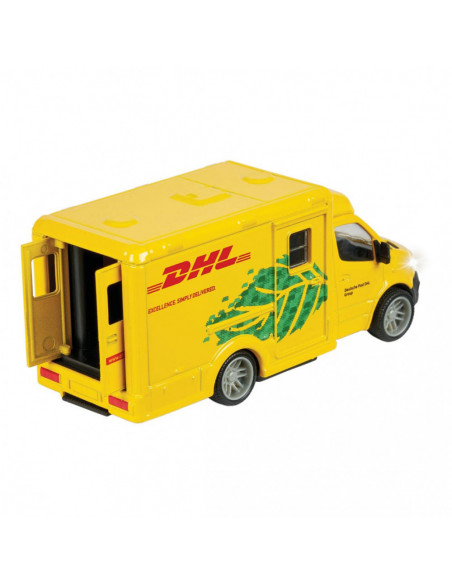 DHL-bezorgbus van Majorette. Deze Mercedes-Benz Sprinter heeft openslaande achterdeuren, rubberen banden en realistische licht- en geluidseffecten. Afmetingen: (LxBxH) 15,0 x 5,5 x 6,5 cm, schaal 1:43. Inclusief 2 AAA-batterijen. Geschikt vanaf 3 jaar.