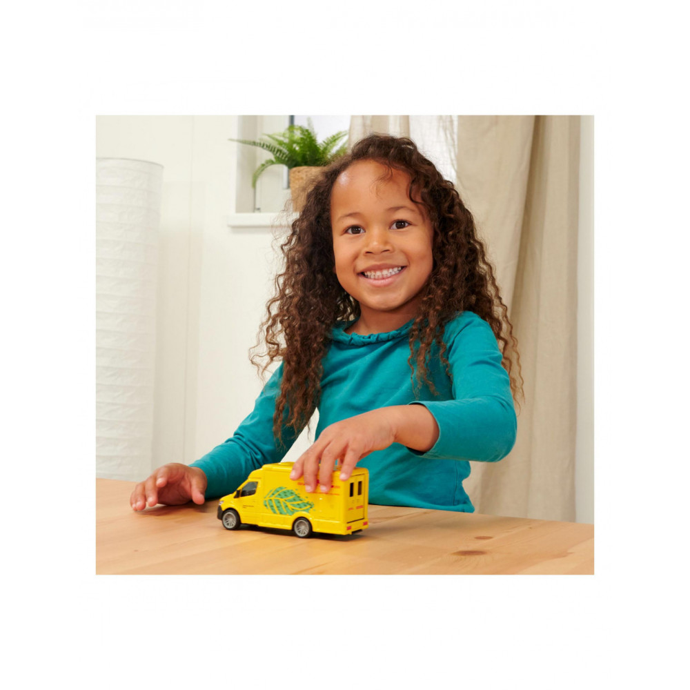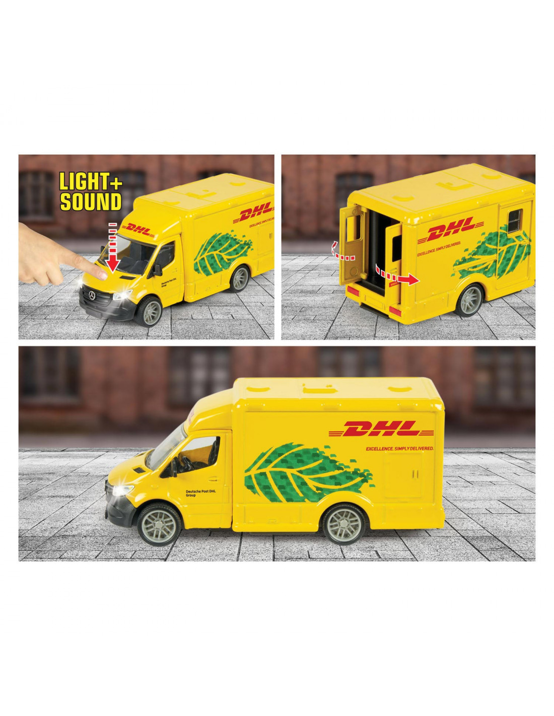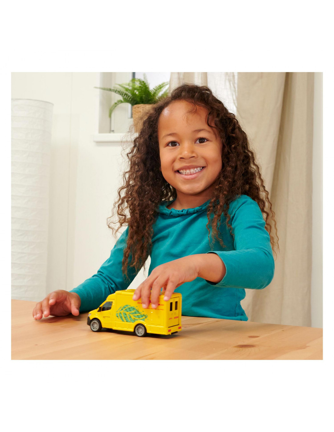 DHL-bezorgbus van Majorette. Deze Mercedes-Benz Sprinter heeft openslaande achterdeuren, rubberen banden en realistische licht- en geluidseffecten. Afmetingen: (LxBxH) 15,0 x 5,5 x 6,5 cm, schaal 1:43. Inclusief 2 AAA-batterijen. Geschikt vanaf 3 jaar.