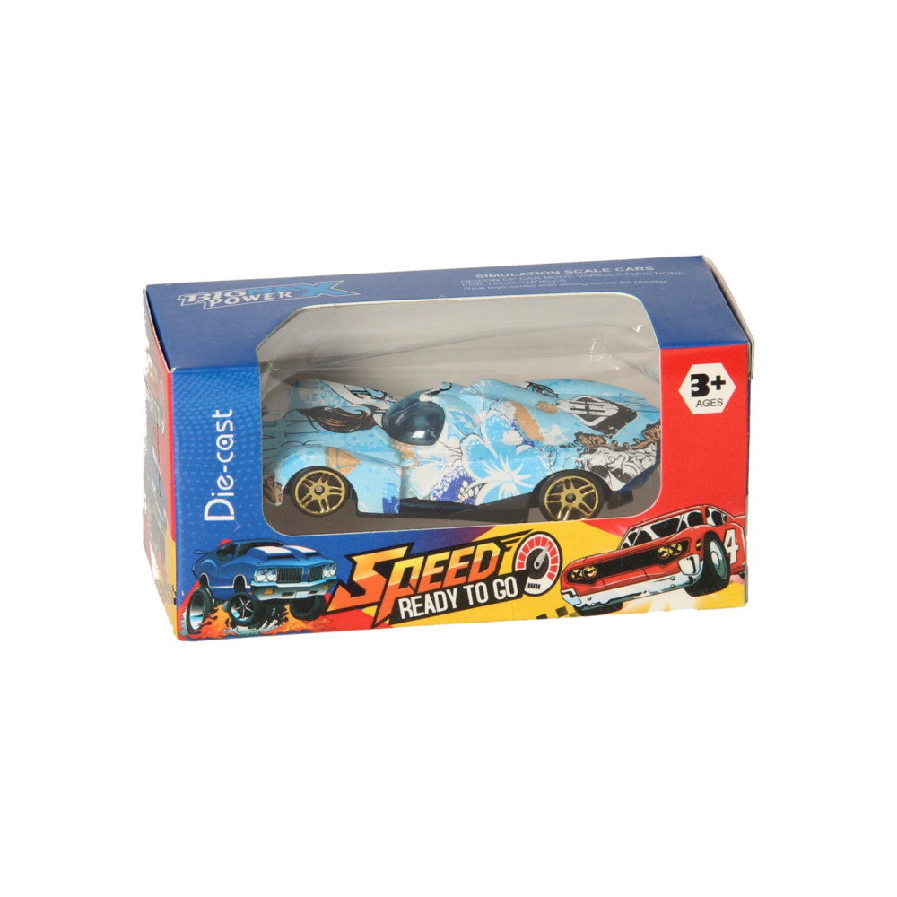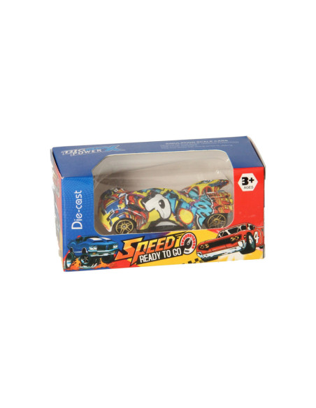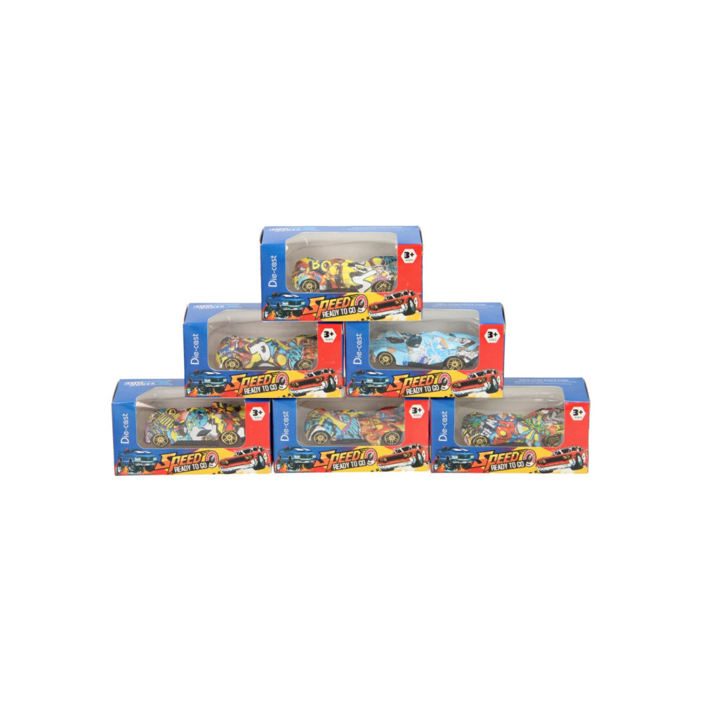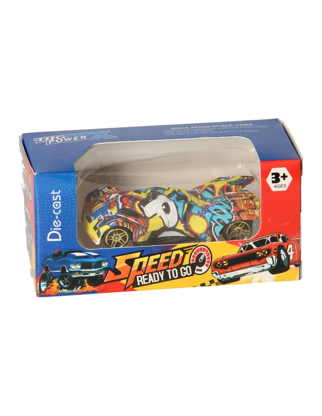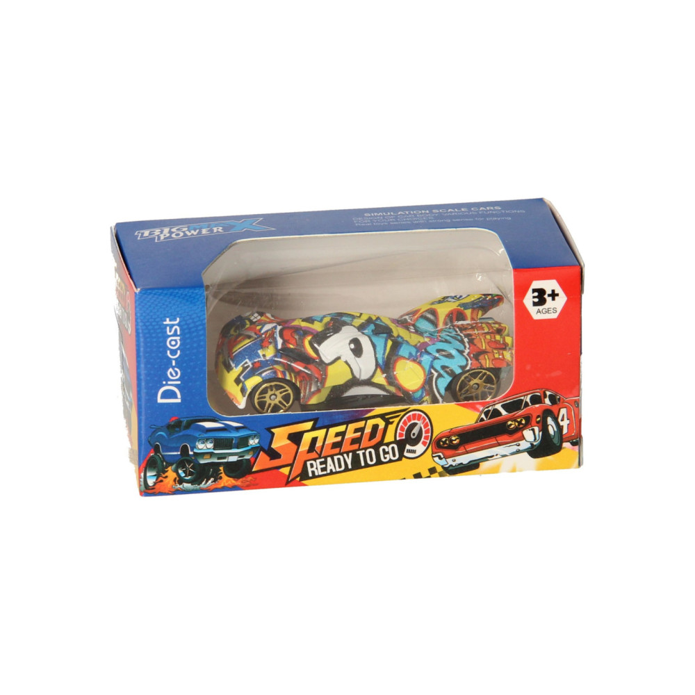 Metalen raceauto met gave graffitiprint. De auto is ca. 7,8 x 3,5 x 2,1 centimeter groot. Geschikt vanaf 6 jaar.