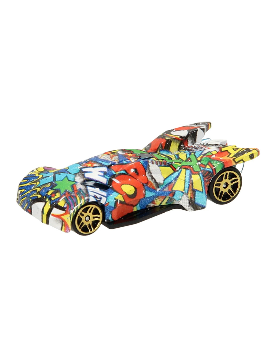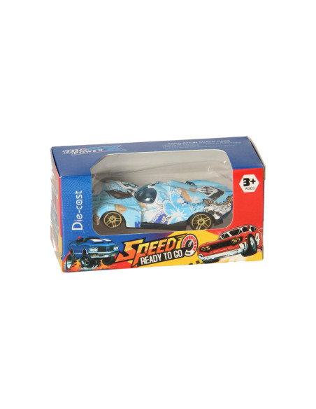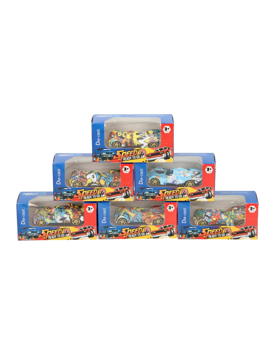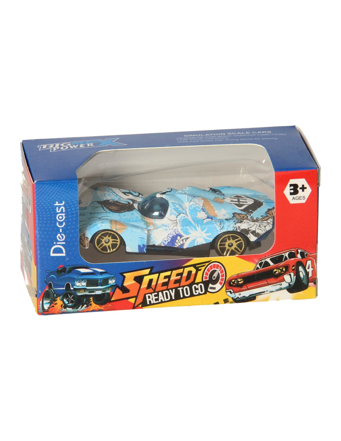 Metalen raceauto met gave graffitiprint. De auto is ca. 7,8 x 3,5 x 2,1 centimeter groot. Geschikt vanaf 6 jaar.
