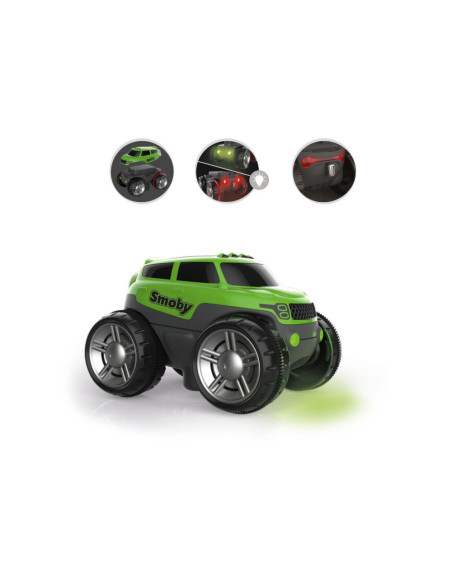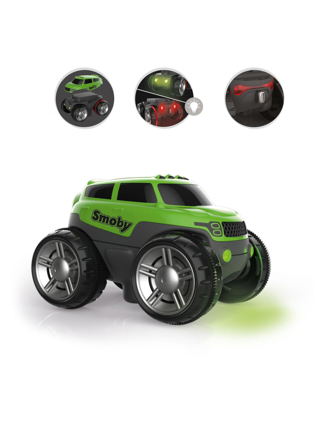 Groene SUV-auto met lichteffecten en een carrosserie om te bevestigen voor de Smoby FleXtreme racebaan. Geschikt voor kinderen vanaf 4 jaar.
