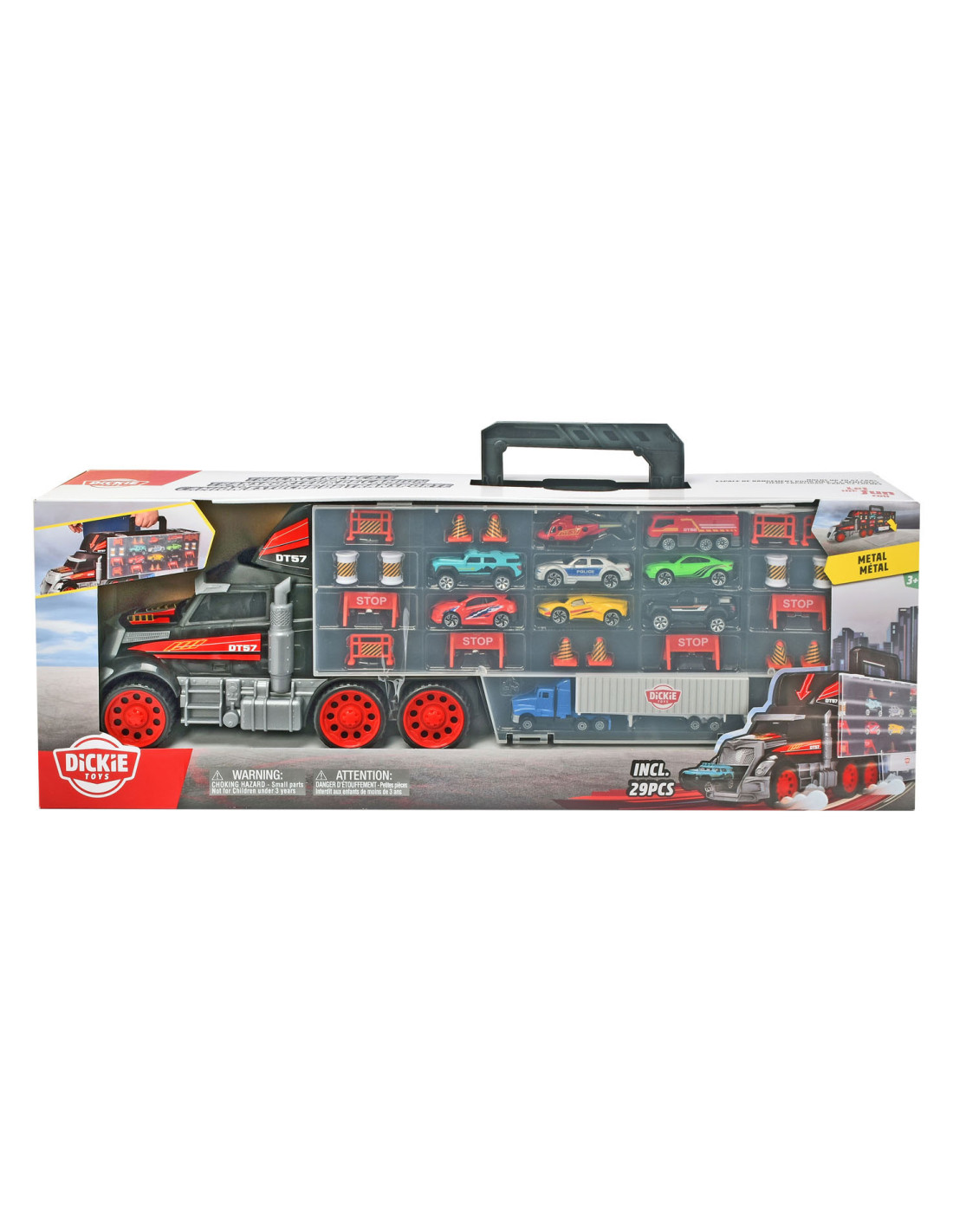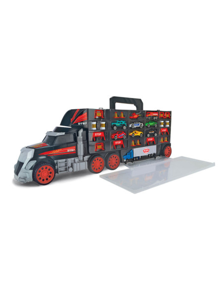 Free-rollende wielen en ruimte voor maximaal 42 speelgoedauto's. 8 gegoten voertuigen en een helikopter zijn al opgenomen in de set. De voertuigen kunnen ook van het dak door de cabine vallen. Met tal van bewegende delen en accessoires zoals pylonen en wegversperringen is plezier gegarandeerd!