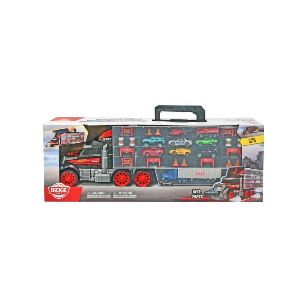 Dickie Toys Truck met draaggreep: voertuigtransporter met meegeleverde voertuigen! Deze Dickie Toys Truck heeft een draaggreep,