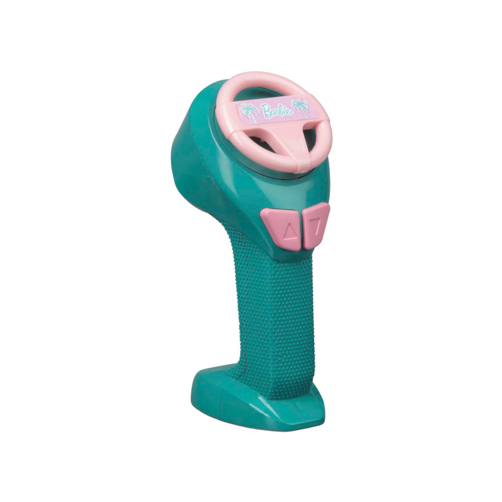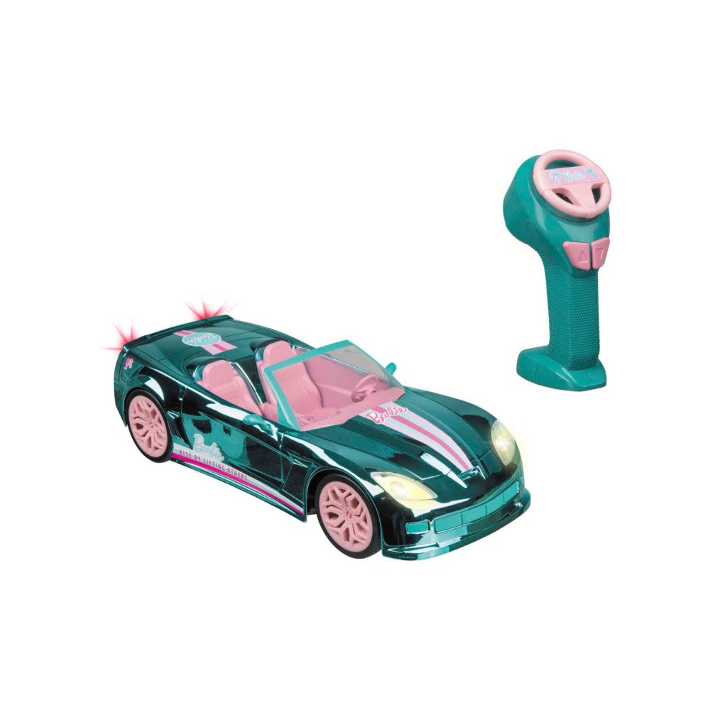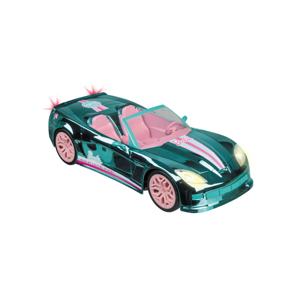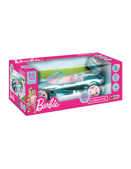 De Barbie Dream Car, een 42,5 cm radiografisch bestuurbare cabriolet met een topsnelheid van 8 km/u en een 2,4 GHz-controller. Geschikt voor kinderen vanaf 3 jaar, met werkende koplampen en een turquoise kleur Exclusief 5 AA- en 2 AAA-batterijen.