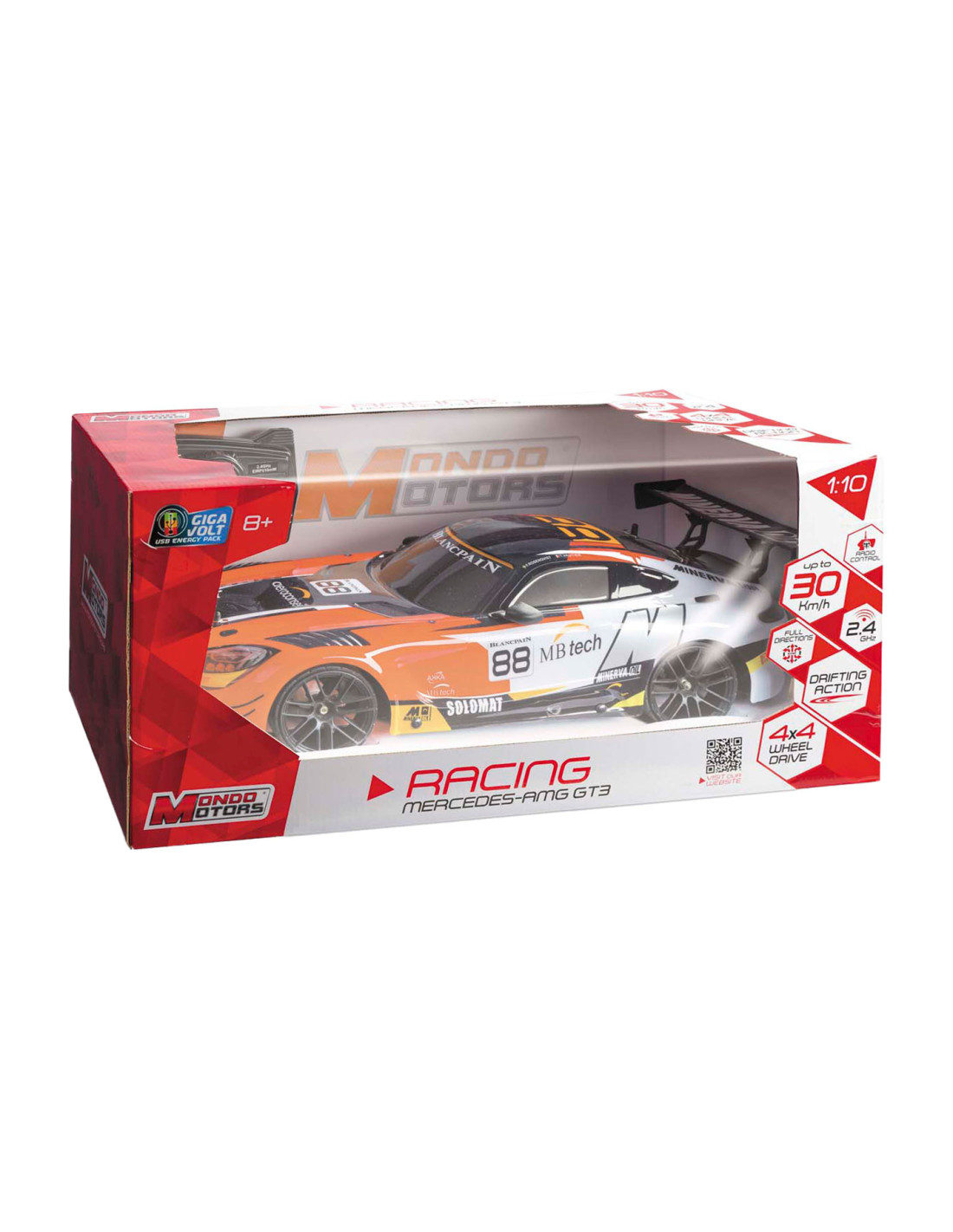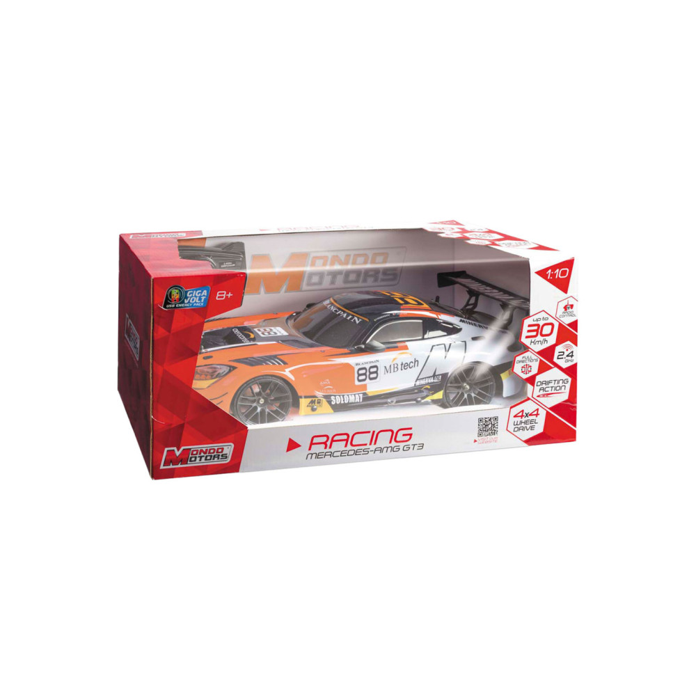 Mercedes AMG GT 3 Drift 22 op schaal 1:10. De auto heeft een snelheid van 30 km/u. Geschikt voor kinderen vanaf 8 jaar.