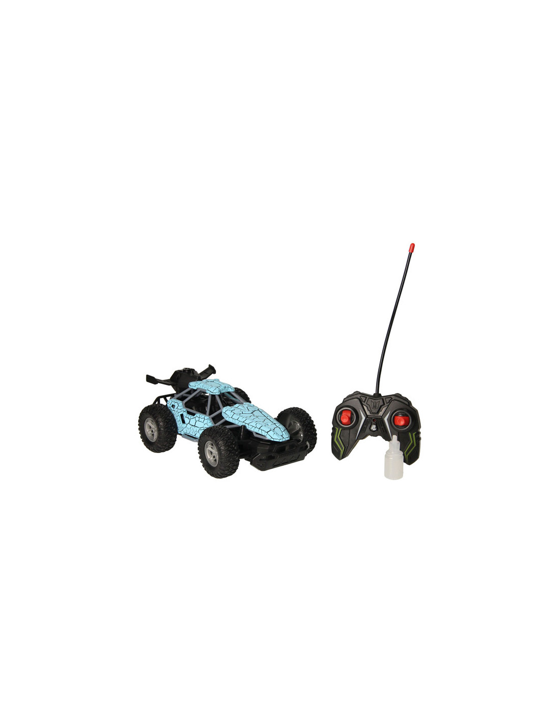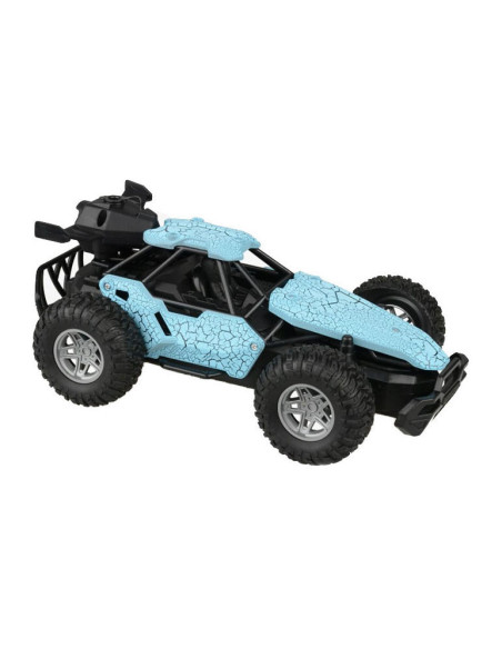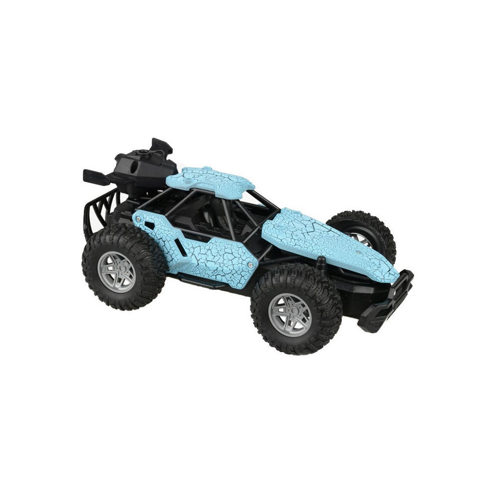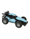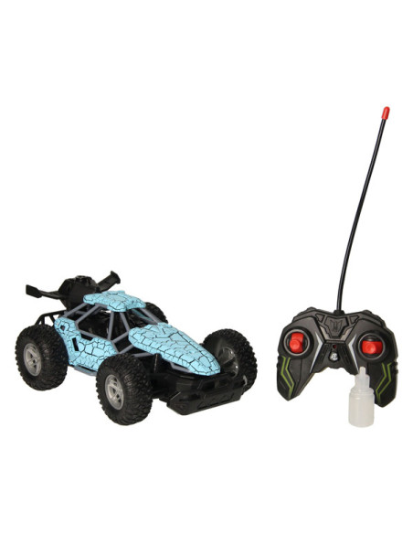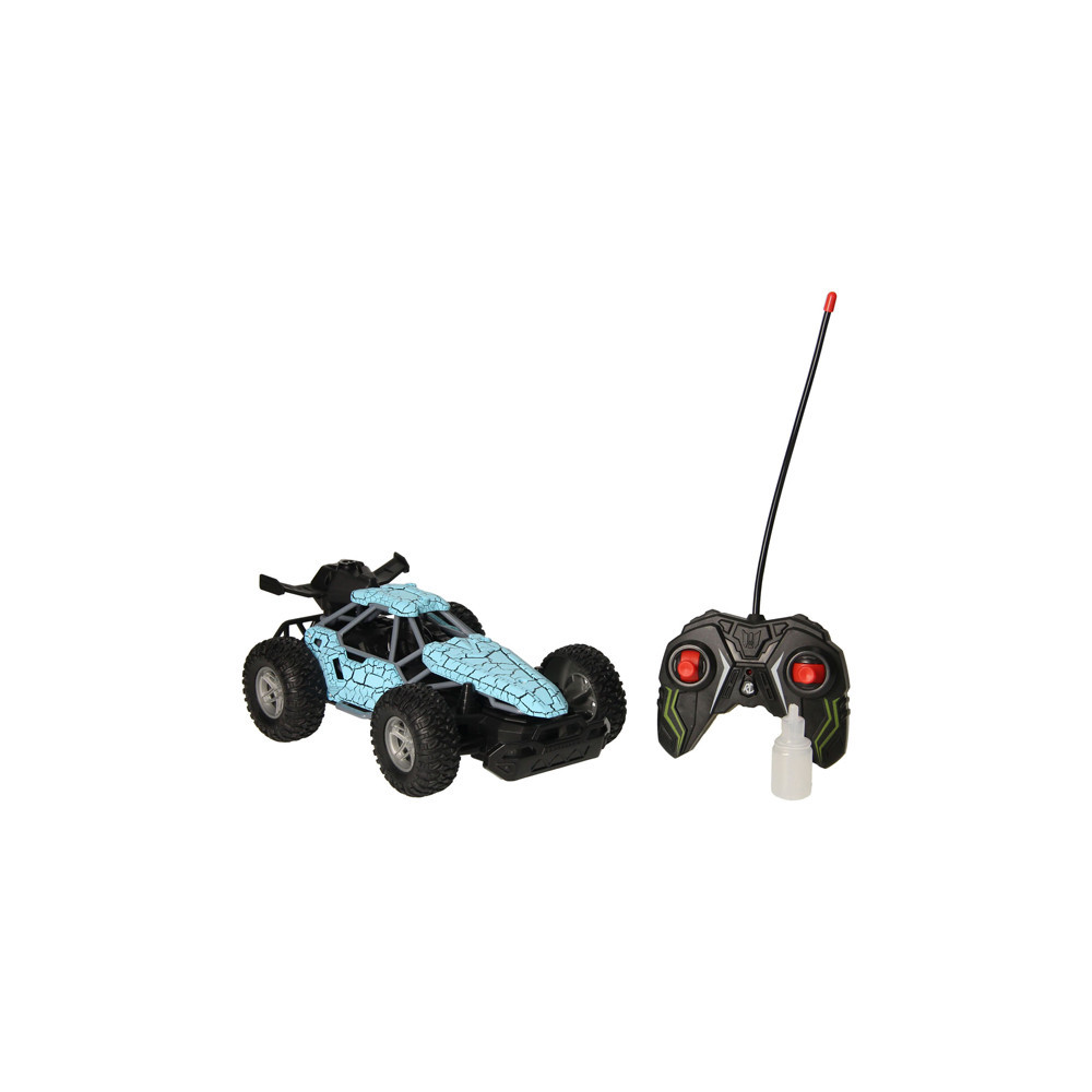 Op afstand bestuurbare auto (blauw) met rookfunctie. Dankzij de stevige profielbanden kan de auto op verschillende terreinen rijden. De auto is 23 x 15 centimeter groot en geschikt voor kinderen vanaf 8 jaar oud. Exclusief batterijen (5x AA). Met het handige flesje kun je de auto vullen om de stoomfunctie te activeren.