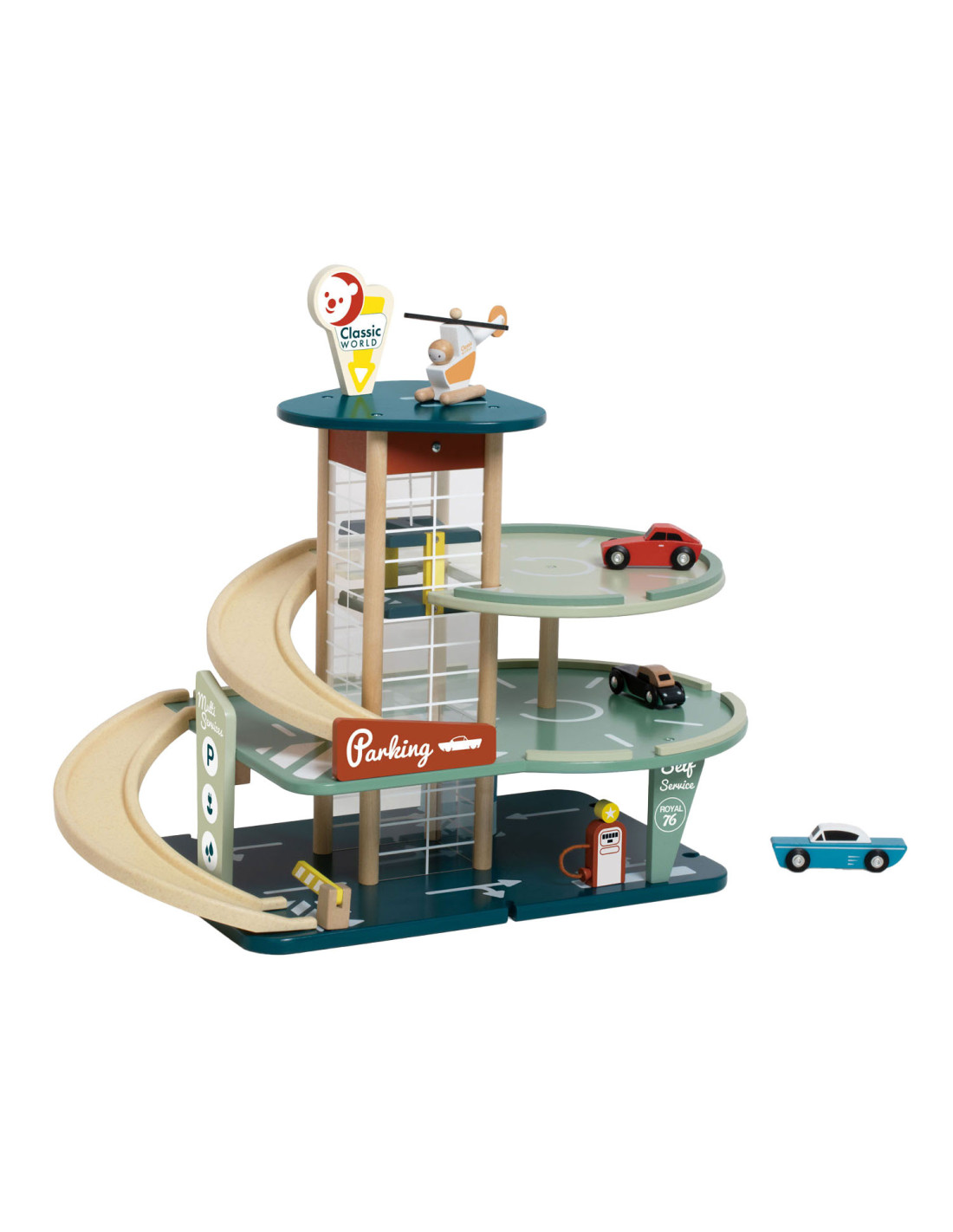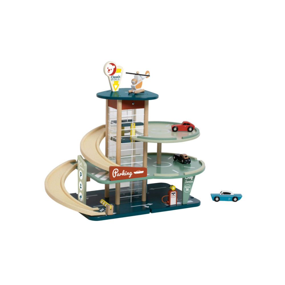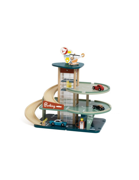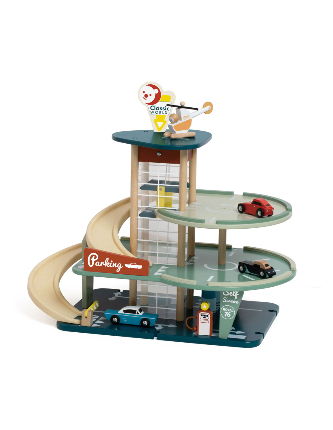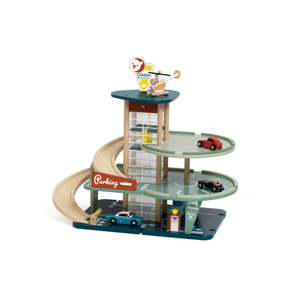 Geïnspireerd door de mooiste garages uit de jaren 50, roept deze "Vintage Garage" de gouden eeuw van auto's en verzamelobjecten op! Met zijn stijlvolle graphics en auto's, beschikt het over een autowasstraat, brandstofpomp en bioplastic hellingen om toegang te krijgen tot de parkeerplaatsen. De lift bedient alle 3 niveaus en is zelfs bekroond met een platform met een helikopter.