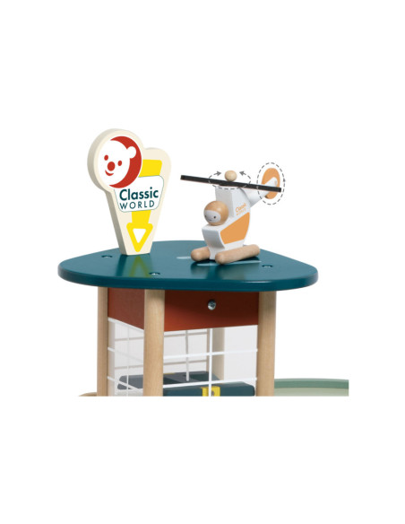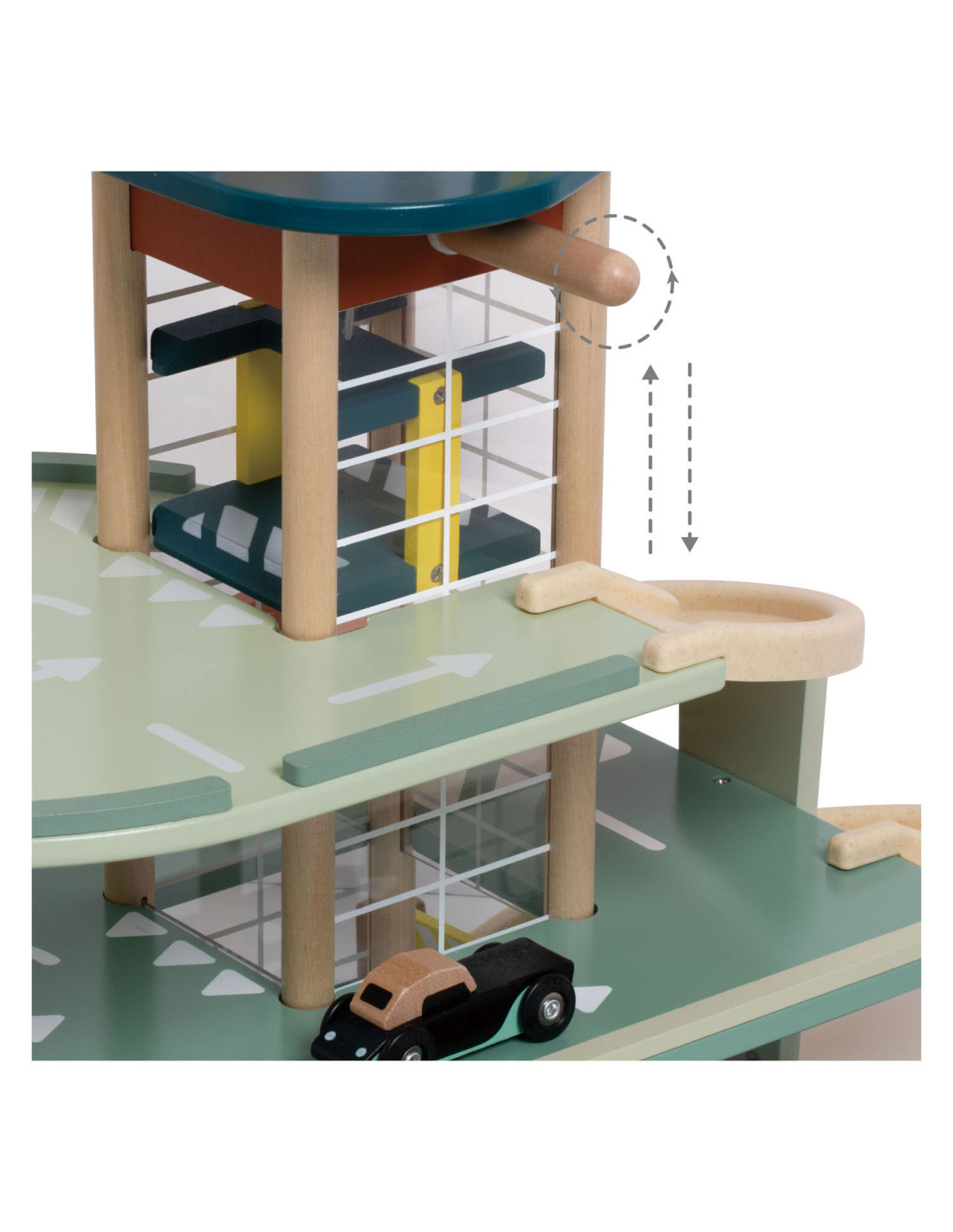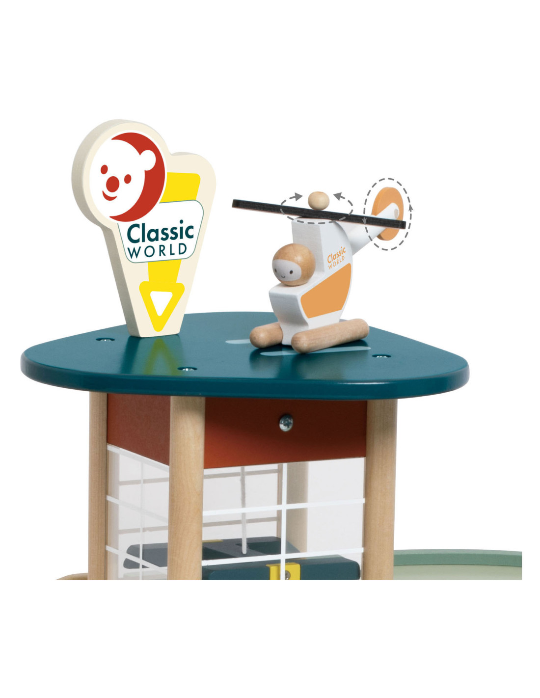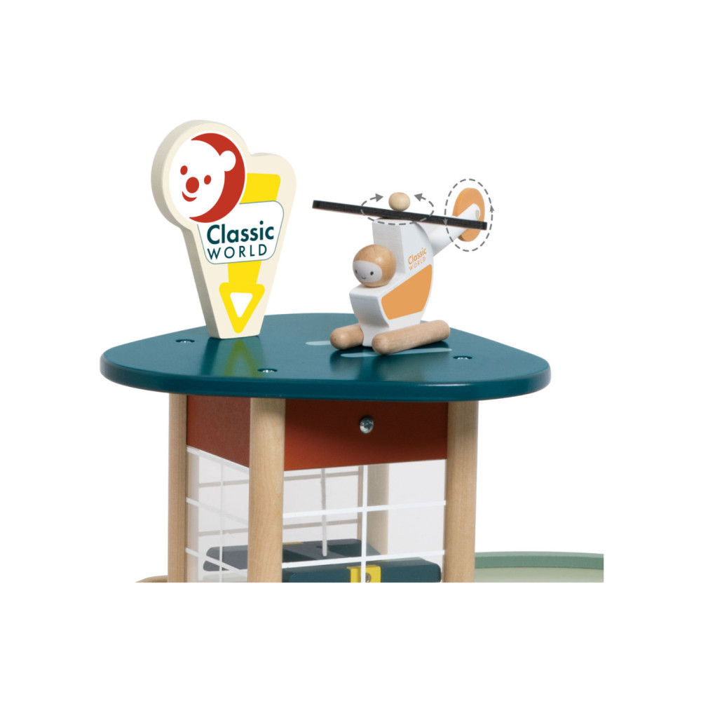 Geïnspireerd door de mooiste garages uit de jaren 50, roept deze "Vintage Garage" de gouden eeuw van auto's en verzamelobjecten op! Met zijn stijlvolle graphics en auto's, beschikt het over een autowasstraat, brandstofpomp en bioplastic hellingen om toegang te krijgen tot de parkeerplaatsen. De lift bedient alle 3 niveaus en is zelfs bekroond met een platform met een helikopter.