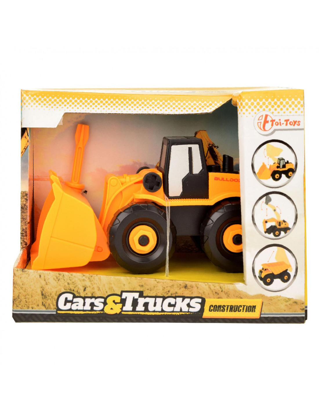 Stoer bouwvoertuig dat zwaar werk doet op de bouwplaats. Met de bijgeleverde schroevendraaier kun je verschillende onderdelen van de kiepwagen, kraanwagen of wiellader demonteren.