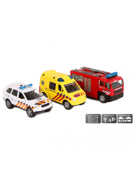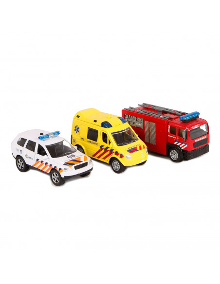Onze Nederlandse Hulpdienst Voertuigen Set bevat een selectie van realistische voertuigen, waaronder politieauto's, brandweerwagens en ambulances. Elke auto is voorzien van een pull-back mechanisme, waardoor ze snel optrekken zodra je ze naar achteren trekt. Laat ze los en zie hoe ze met hoge snelheid naar het noodgeval racen!