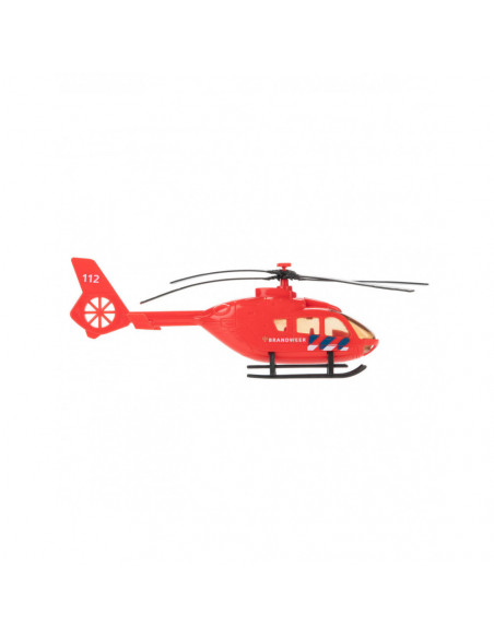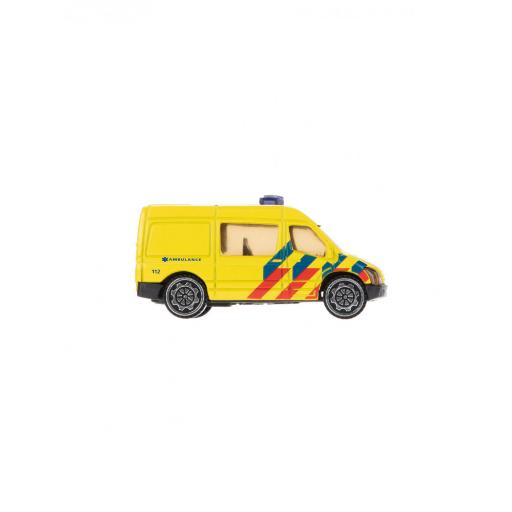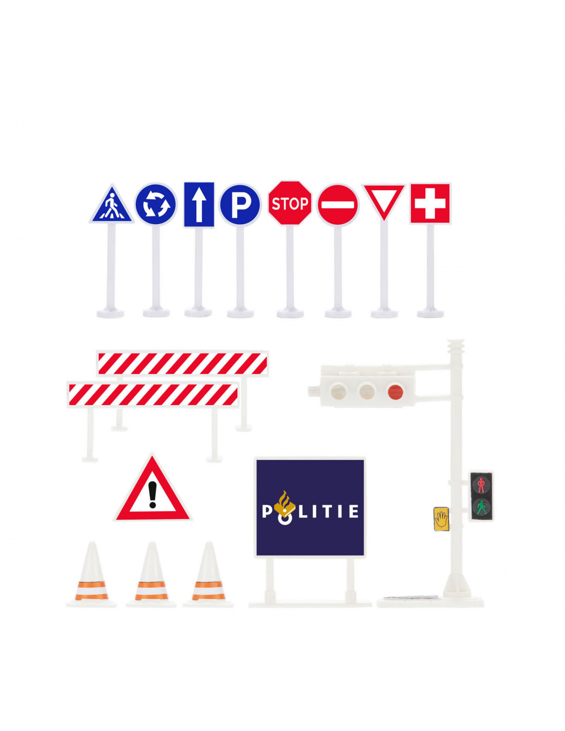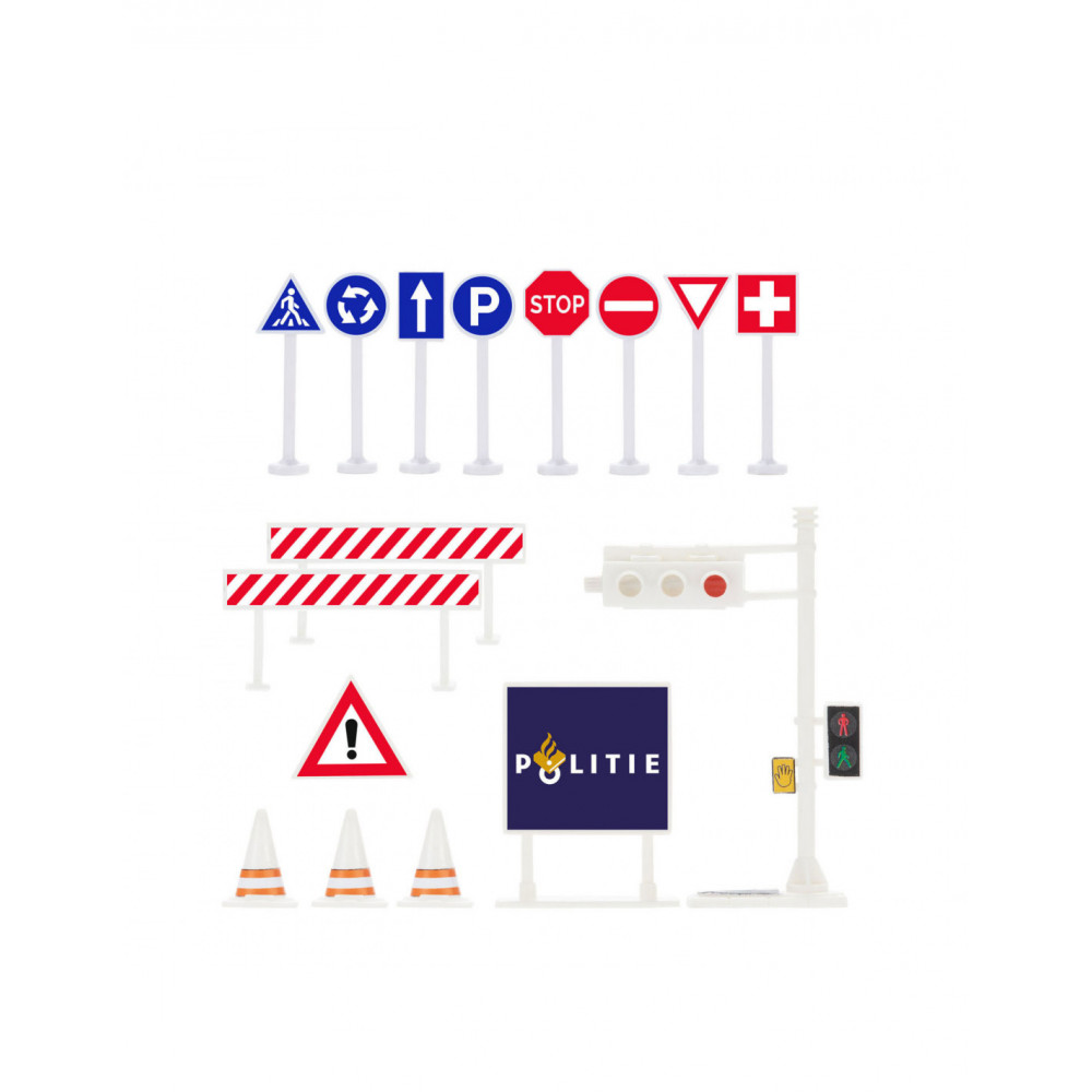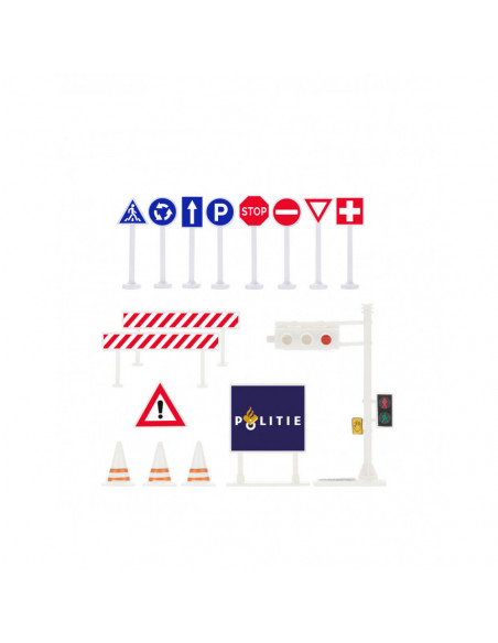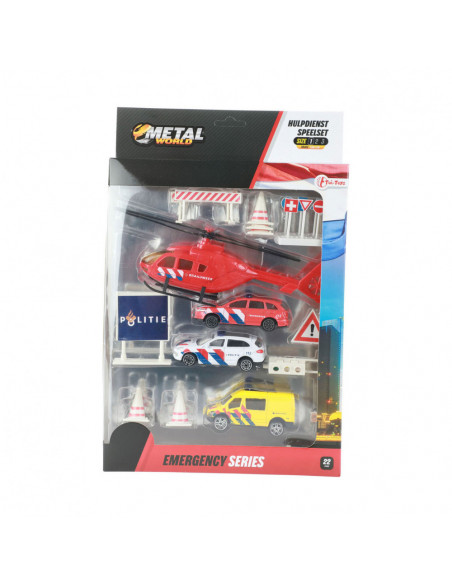 Verkeerset bestaande uit een metalen politieauto, een brandweerauto, een ambulance busje en een plastic brandweer helikopter. Ook zijn 8 verkeersborden en een stoplicht inbegrepen. Waarbij het stoplicht zelfs van kleur verandert kan worden. Samen met de hekken en pionnen regel je zo veilig het verkeer.