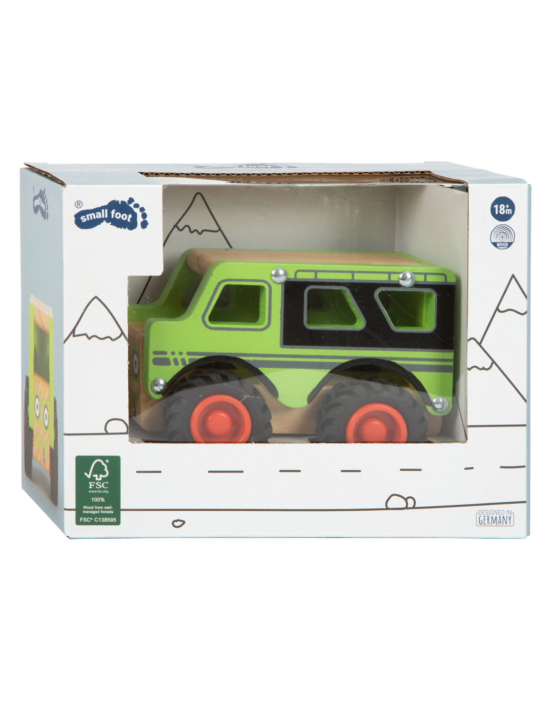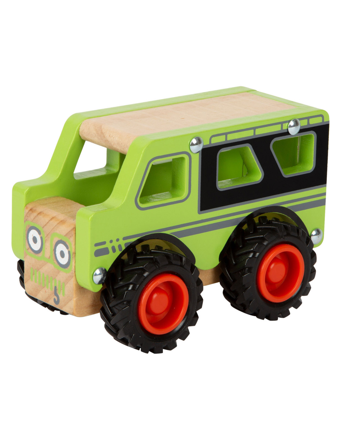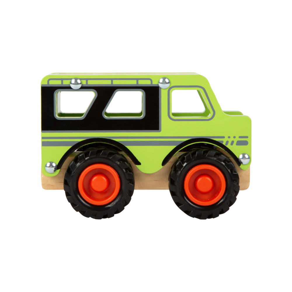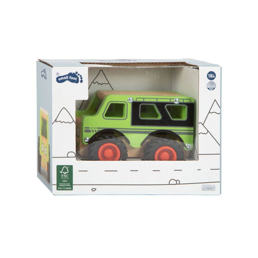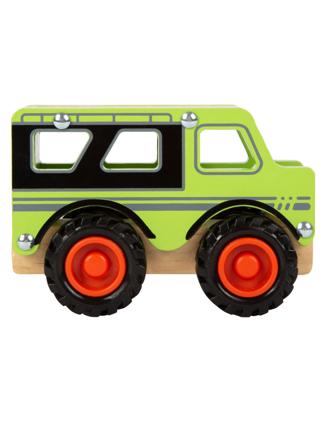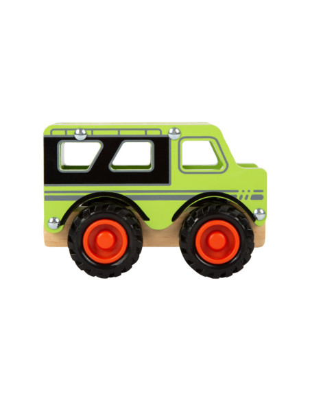 Het avontuur roept! Met robuuste, met rubber afgewerkte wielen en veel opbergruimte is deze terreinwagen de beste keuze voor spannende ritten door de kinderkamer en over ruig terrein! De passende details zoals een bedrukte kabellier of een reservewiel maken het uiterlijk van dit grote voertuig van 100% FSC-gecertificeerd hout compleet. Door de raamopeningen kunnen kleine handjes deze SUV goed vasthouden. Een gezicht op de voorkant van het voertuig geeft het een persoonlijkheid en biedt creatieve en fantasierijke speelmogelijkheden voor jonge autofans.