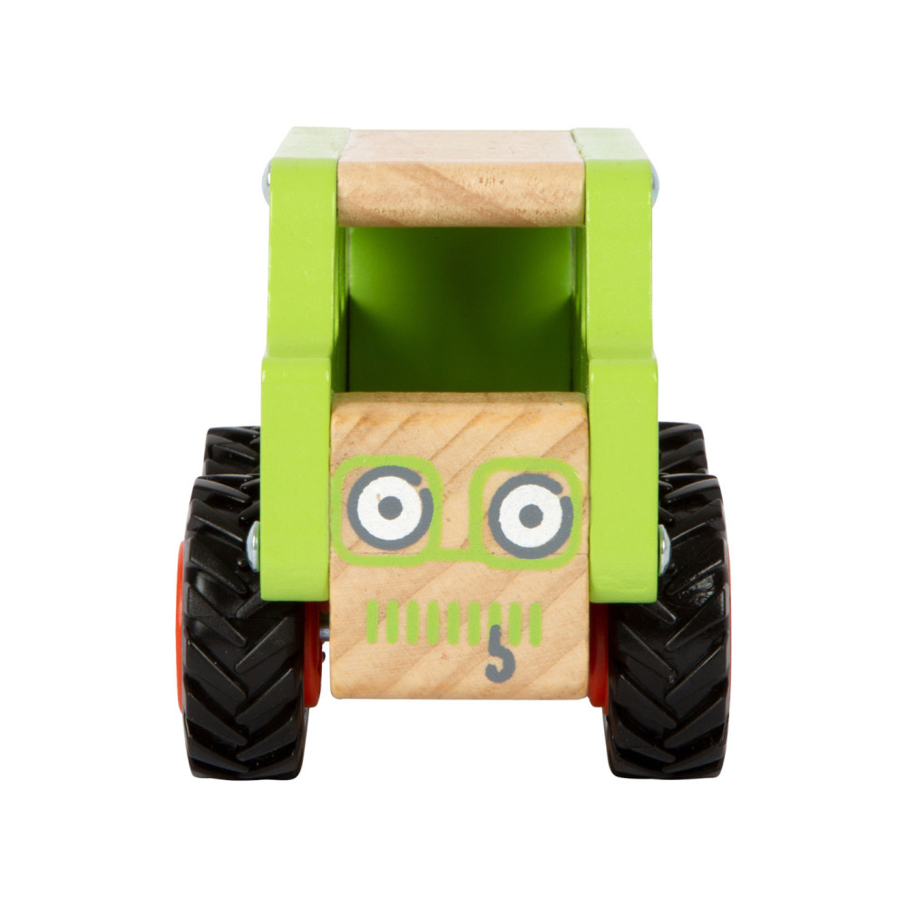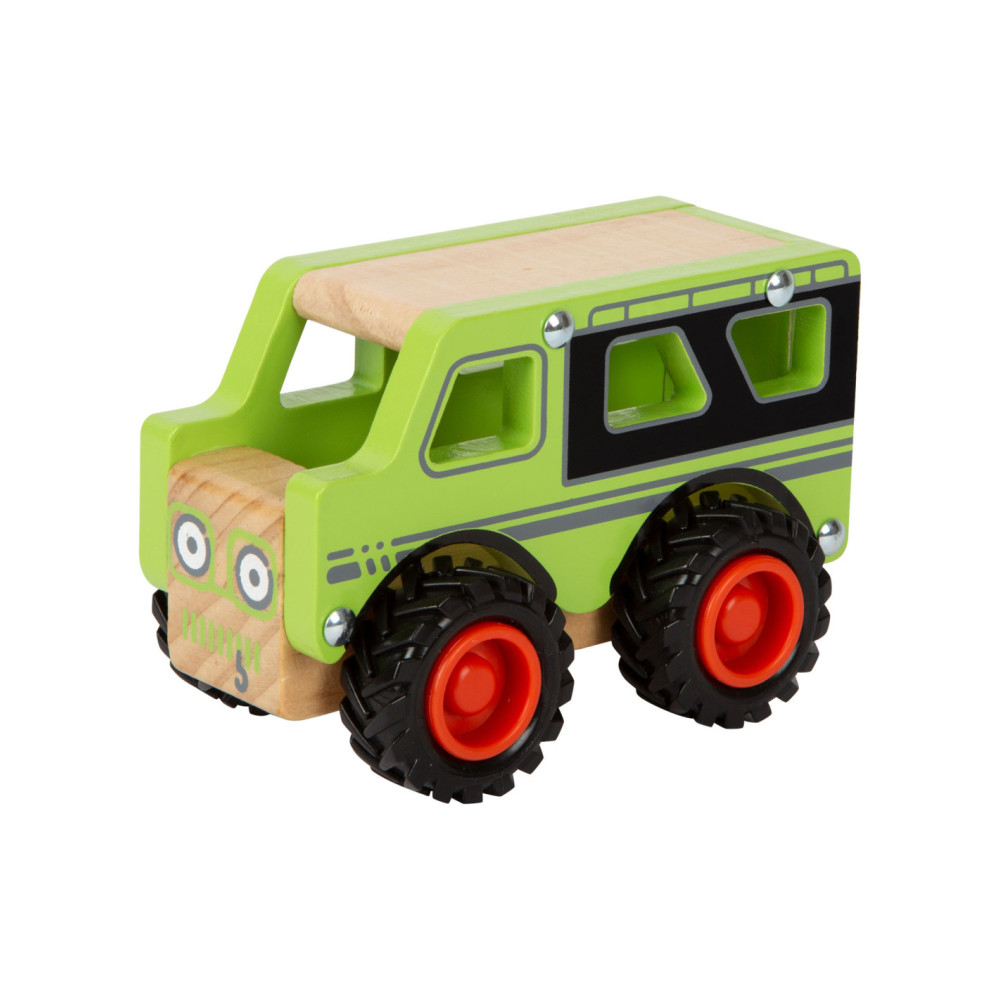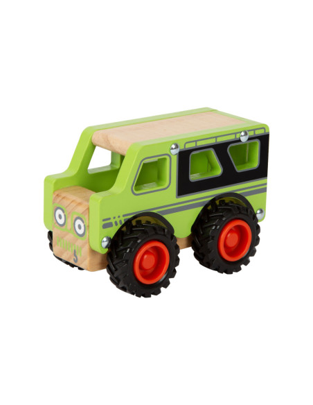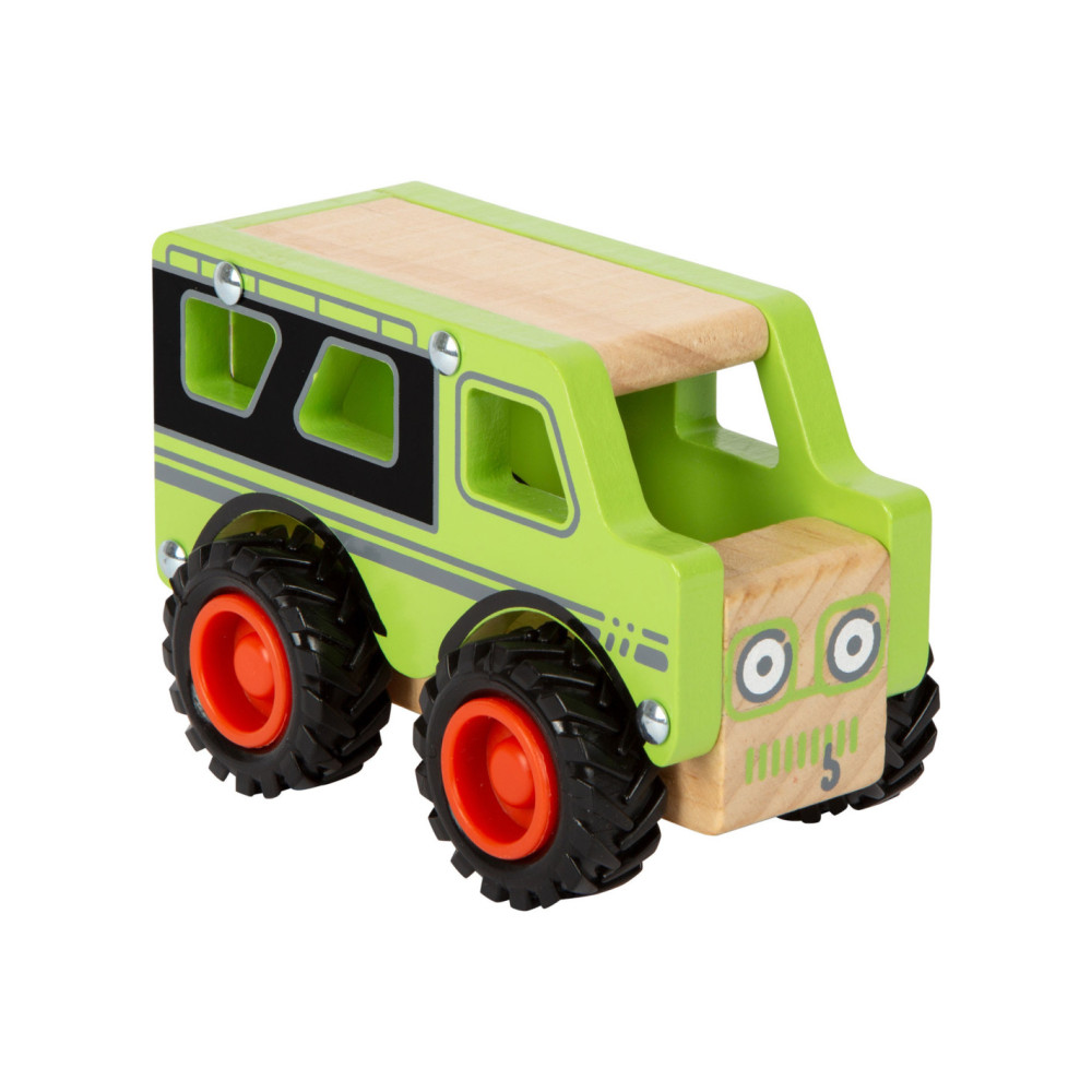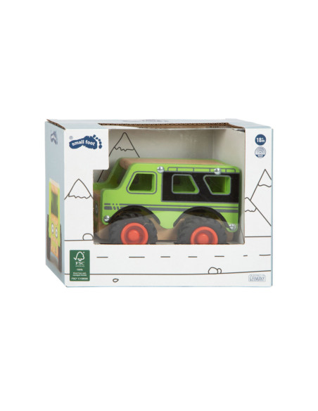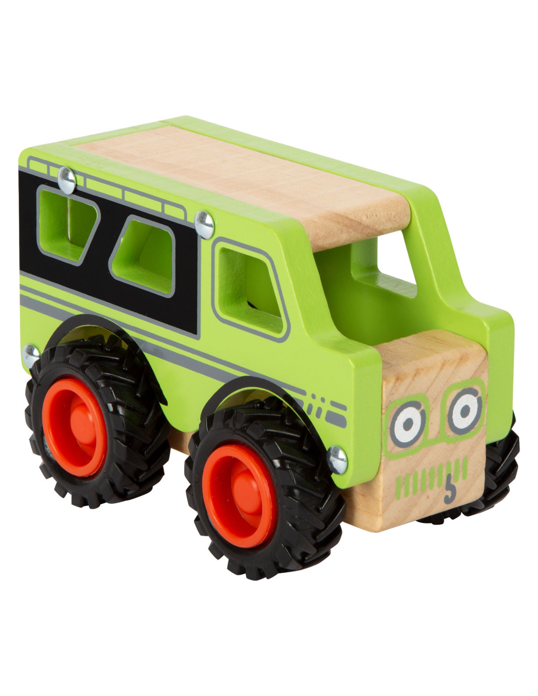 Het avontuur roept! Met robuuste, met rubber afgewerkte wielen en veel opbergruimte is deze terreinwagen de beste keuze voor spannende ritten door de kinderkamer en over ruig terrein! De passende details zoals een bedrukte kabellier of een reservewiel maken het uiterlijk van dit grote voertuig van 100% FSC-gecertificeerd hout compleet. Door de raamopeningen kunnen kleine handjes deze SUV goed vasthouden. Een gezicht op de voorkant van het voertuig geeft het een persoonlijkheid en biedt creatieve en fantasierijke speelmogelijkheden voor jonge autofans.
