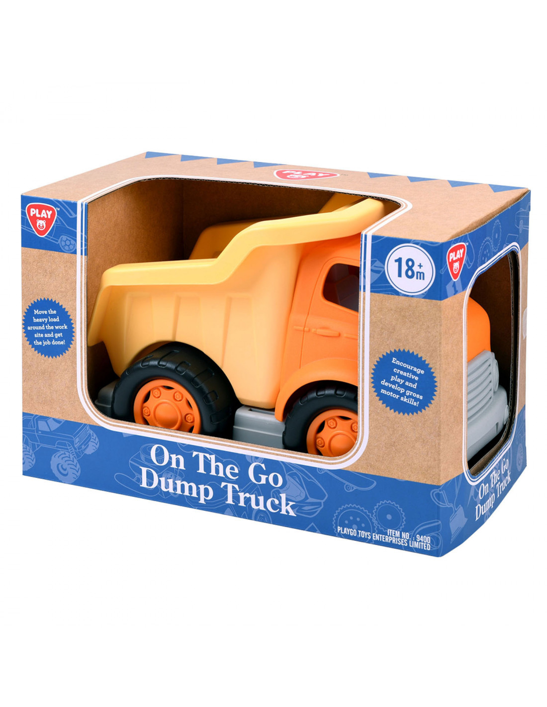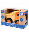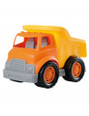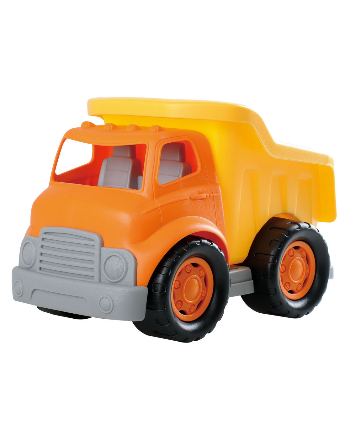 Deze kunststof kiepwagen heeft een oranje kleur. De kiepwagen kan omhoog en omlaag bewogen worden.