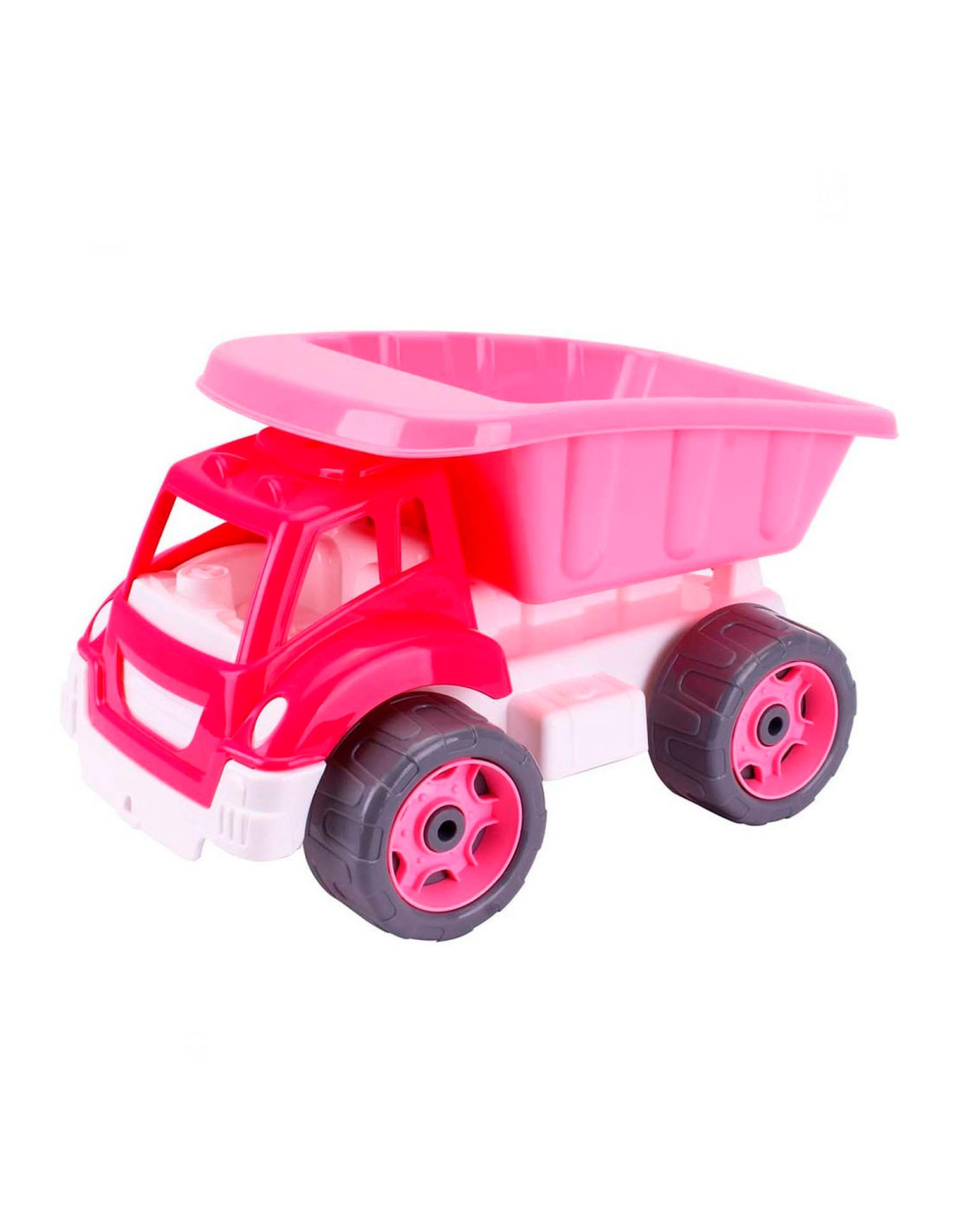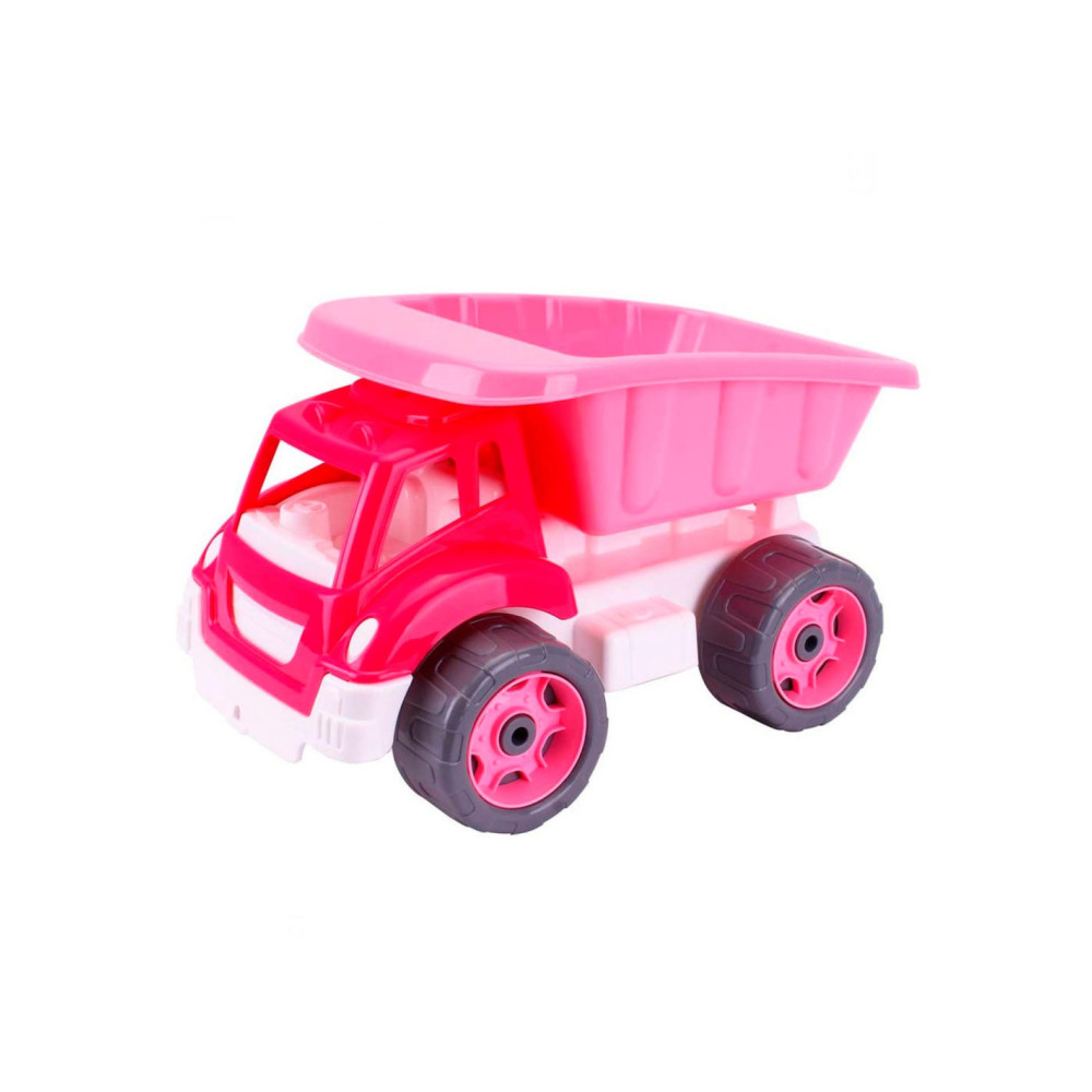 Roze kiepwagen, donkerroze en lichtroze. Geschikt voor kinderen vanaf 3 jaar oud.