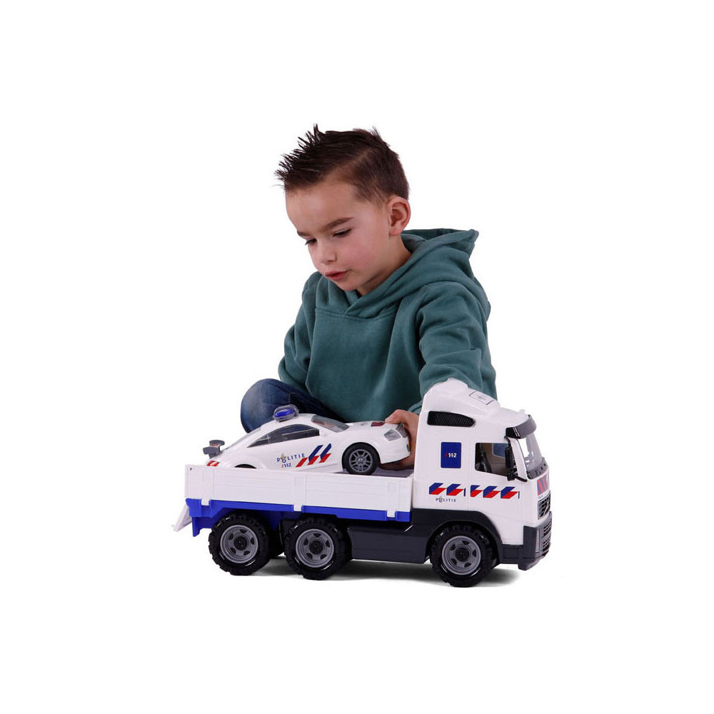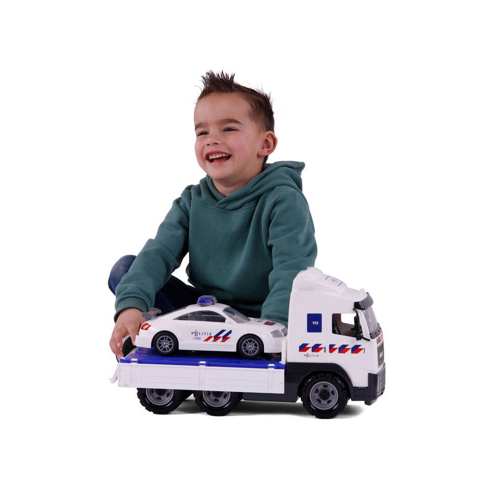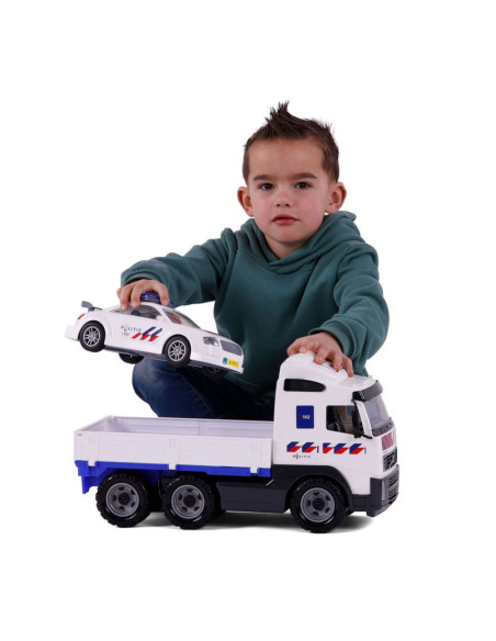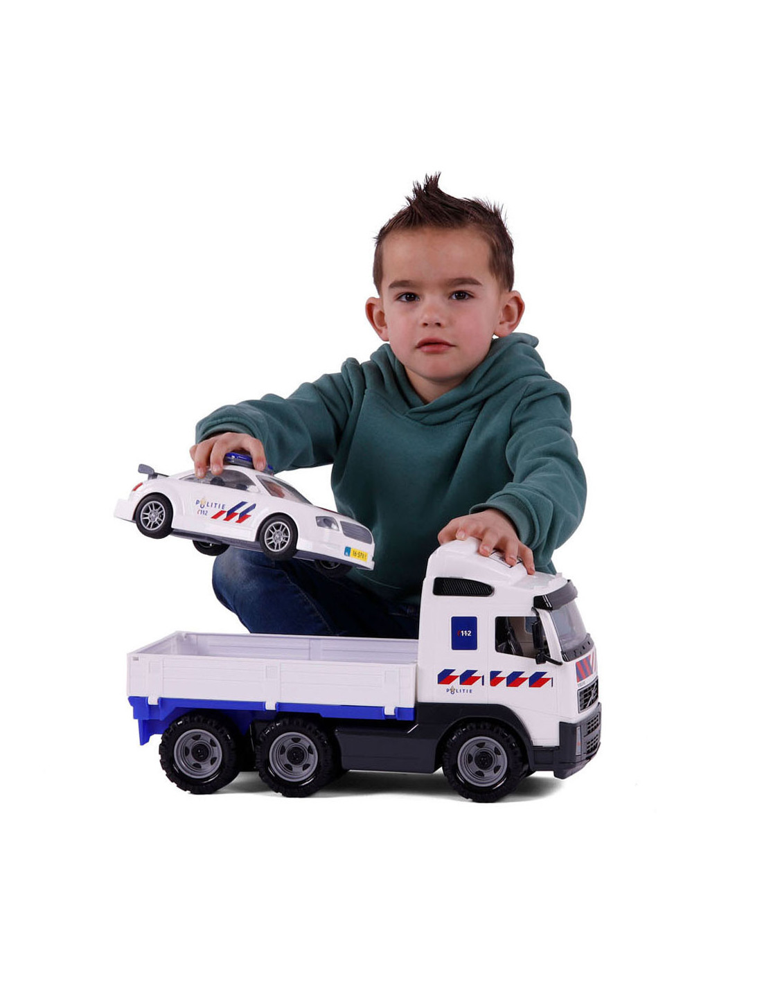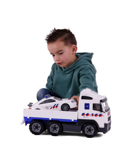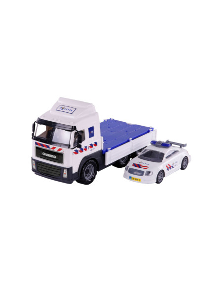Beheers de straten met de Police Truck and Car in schaal 1:16! Deze indrukwekkende set bevat een politieauto in de laadbak. Met uitklapbare zijkanten!