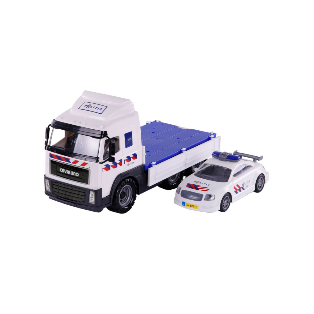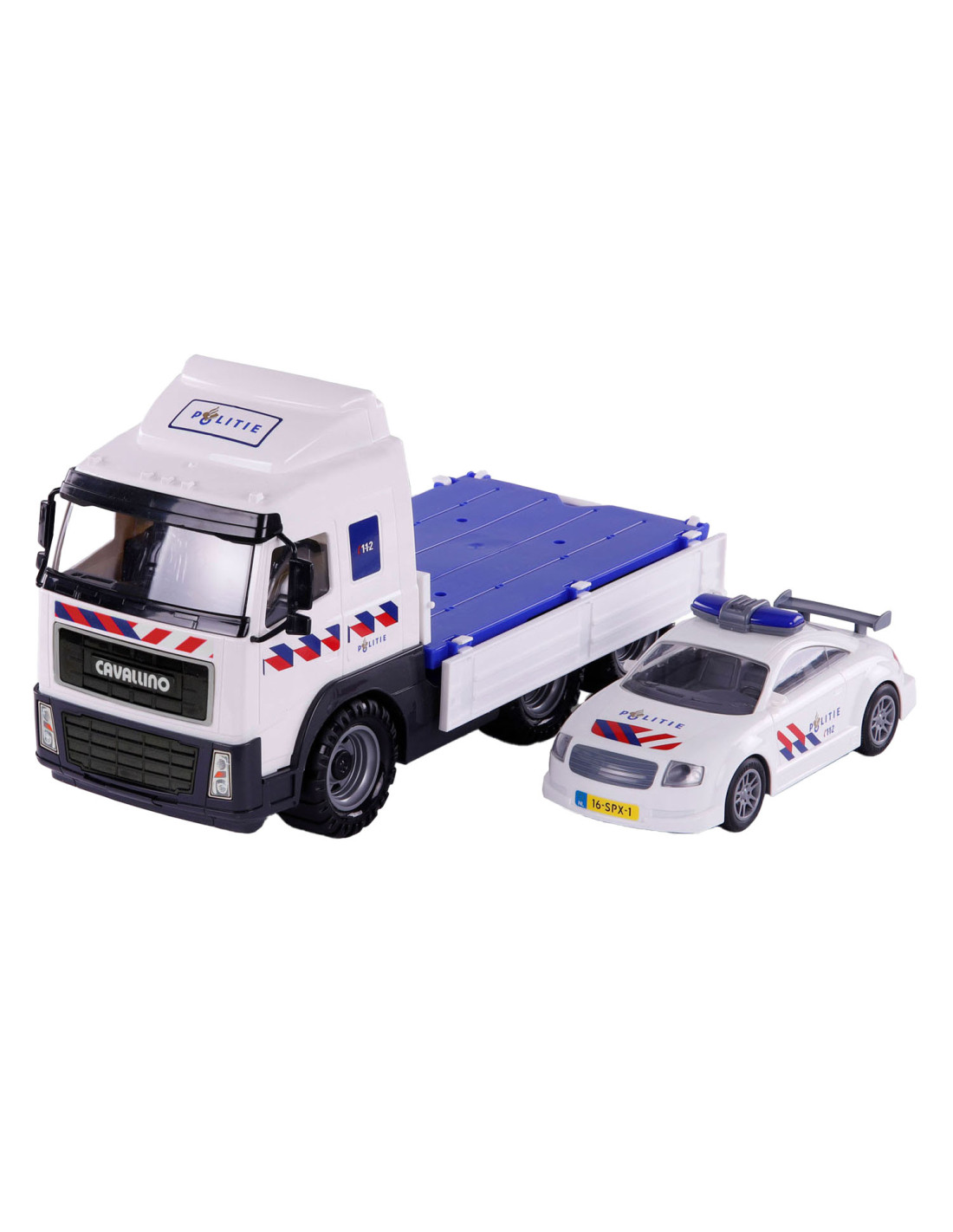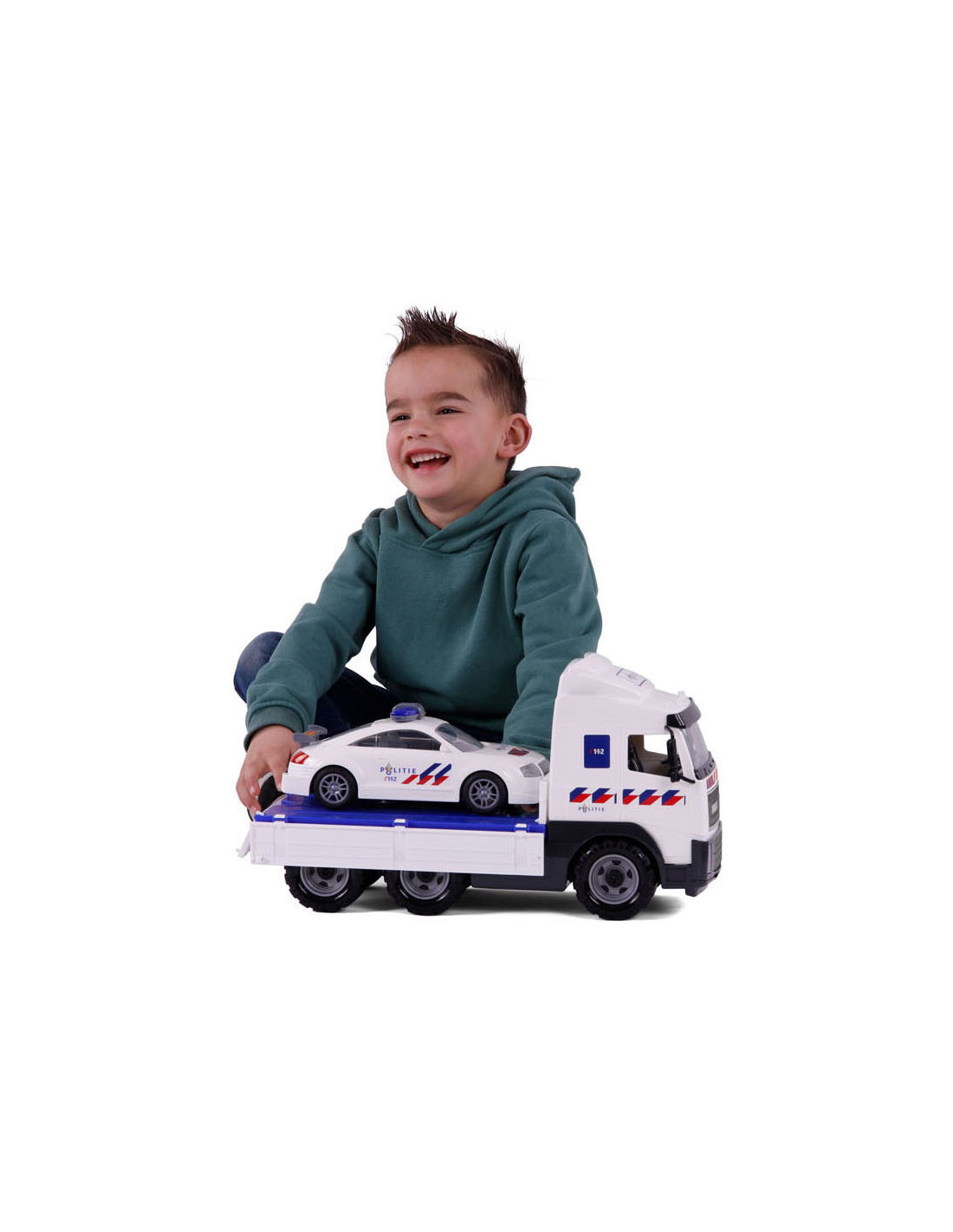 Beheers de straten met de Police Truck and Car in schaal 1:16! Deze indrukwekkende set bevat een politieauto in de laadbak. Met uitklapbare zijkanten!