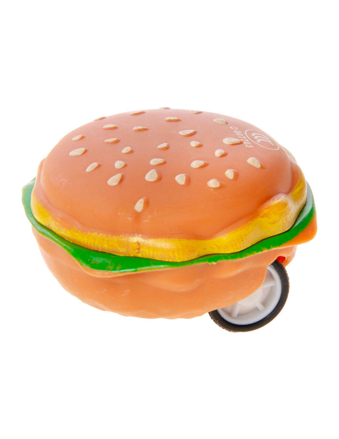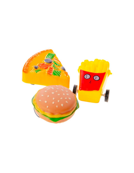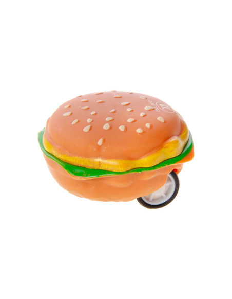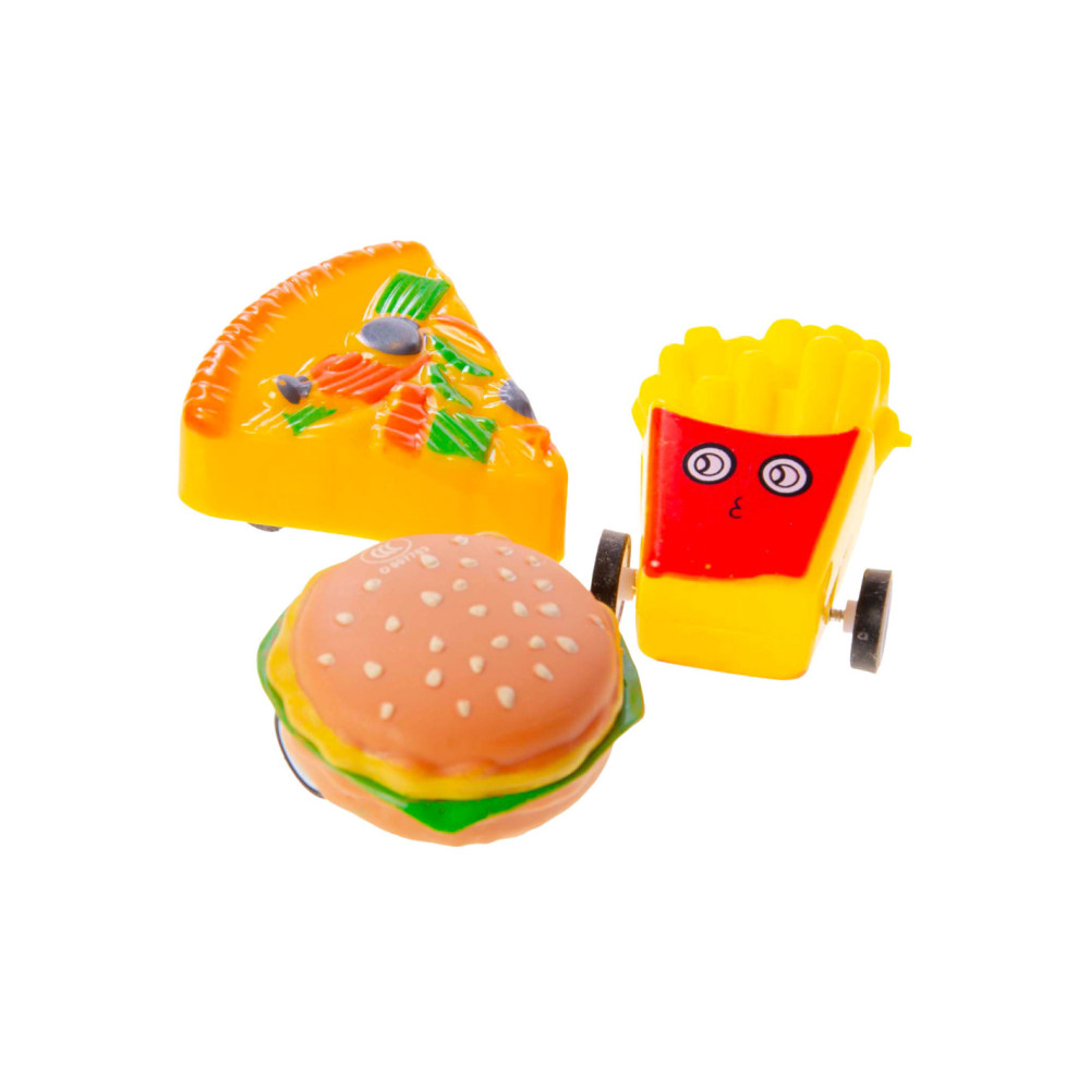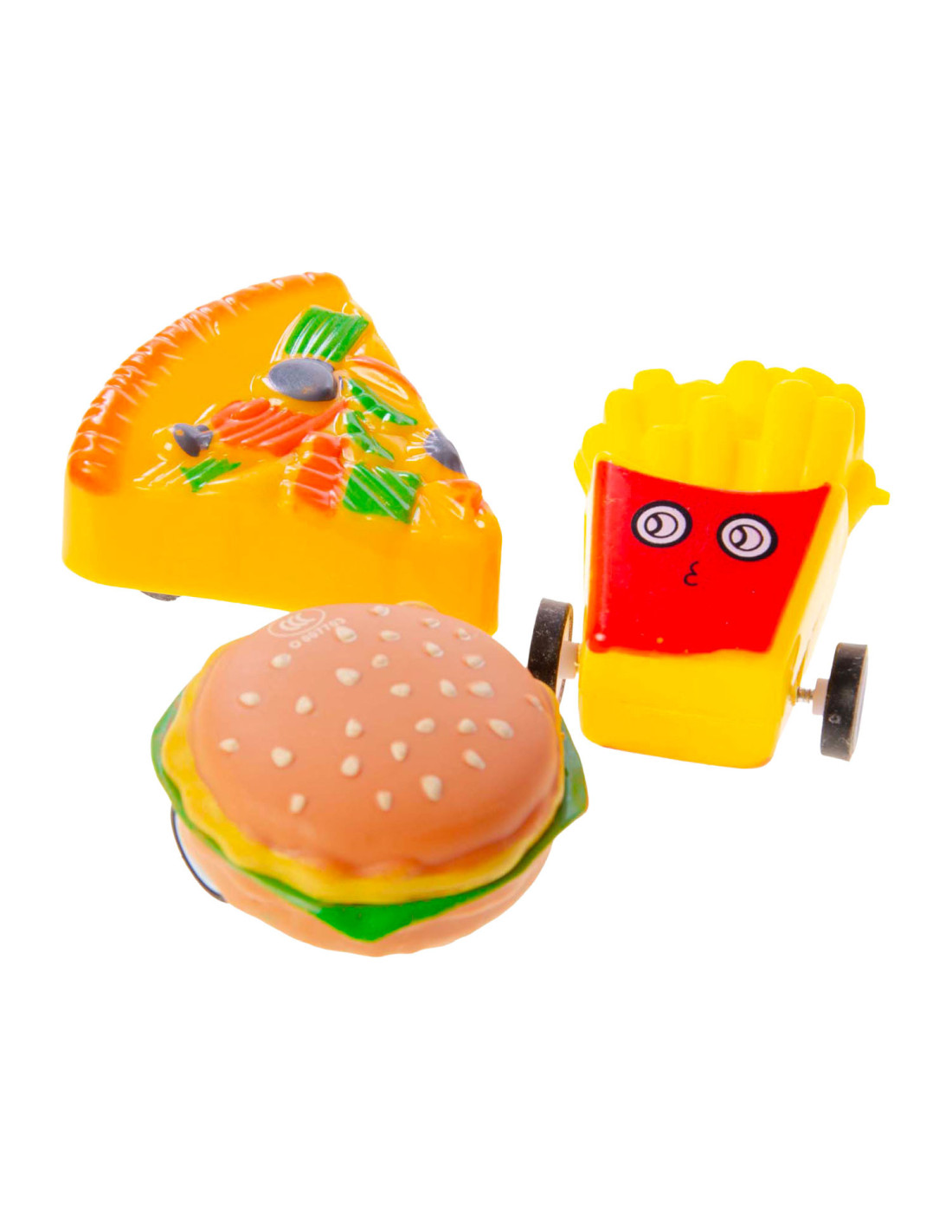Pull-back voertuig in de vorm van je favoriete fastfood zoals een hamburger of pizzapunt. Afmetingen: 4 x 3 centimeter.